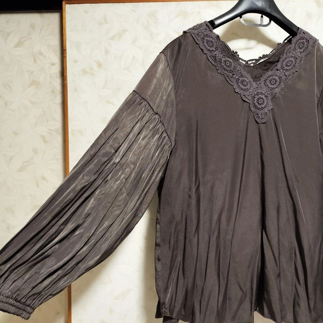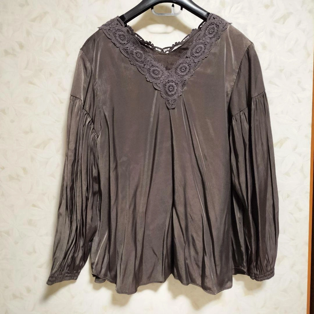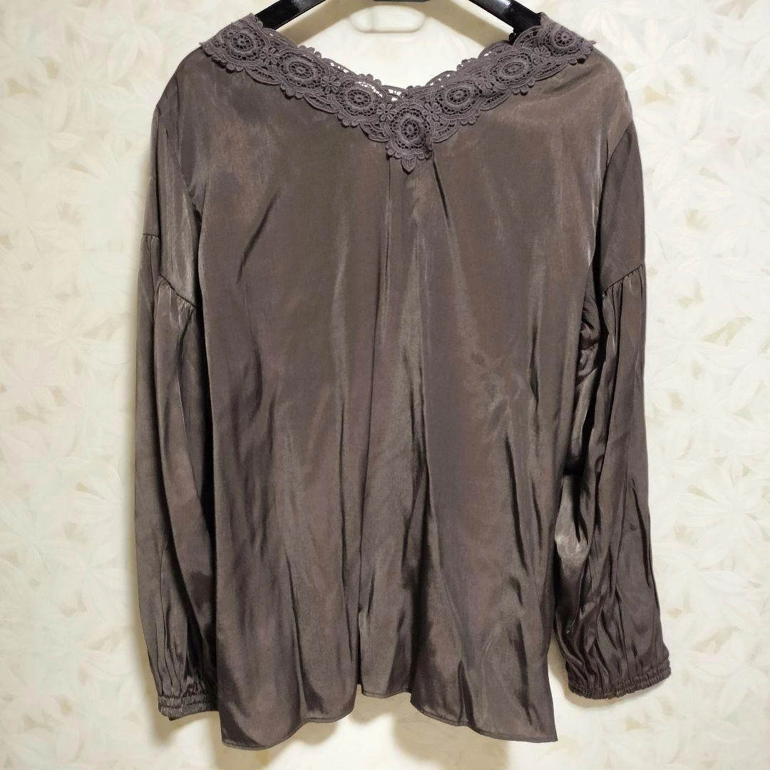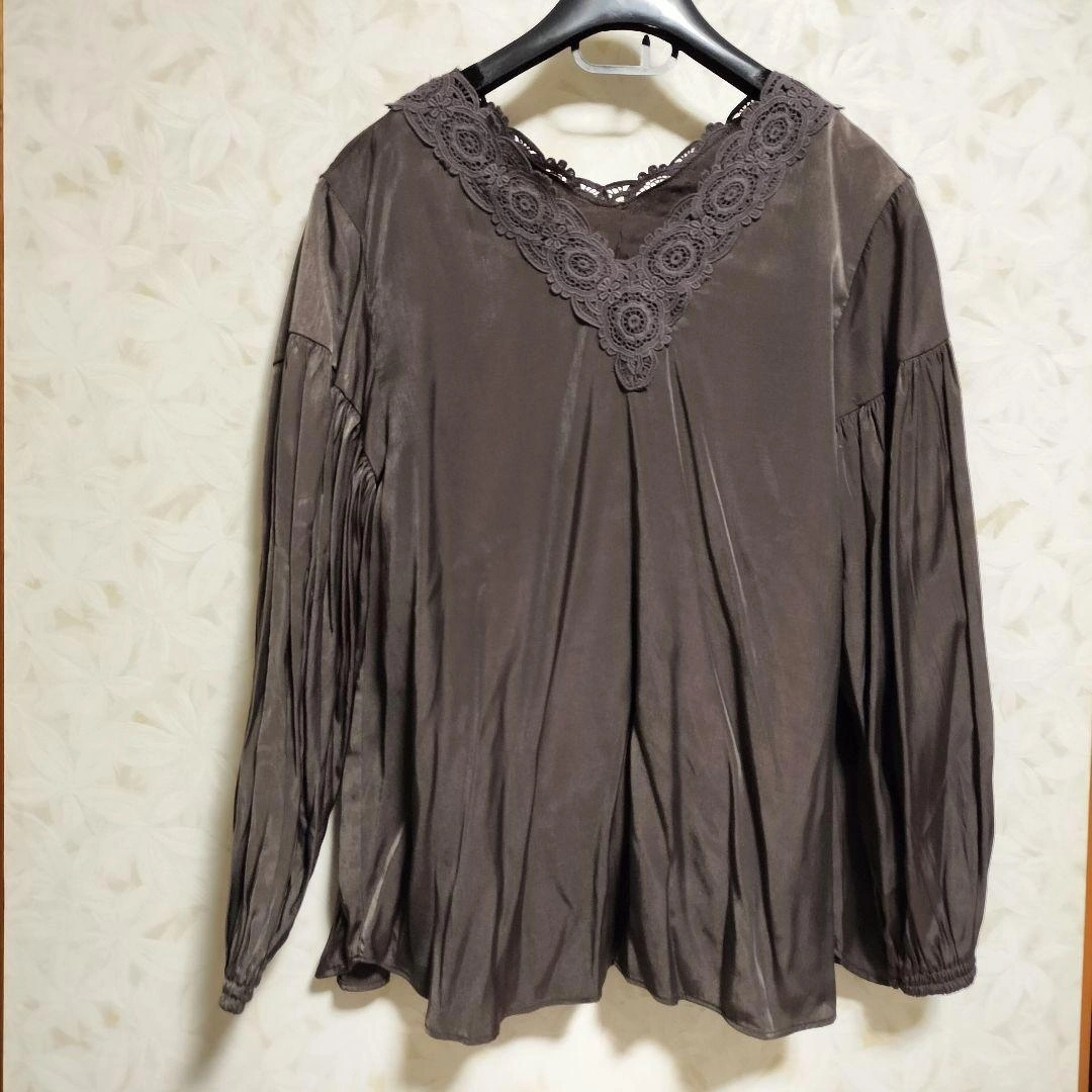 光沢感のあるブラウンの長袖トップスです。レース付きVネックのデザイン。 - 色: ブラウン - デザイン: レース付き Vネック - 袖のスタイル: 長袖・ギャザー入り - 素材: 光沢感のある生地 サイズ42なのでL〜LLになります。 ご覧いただきありがとうございます。