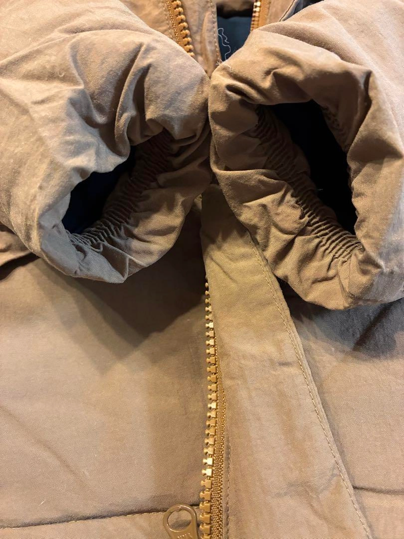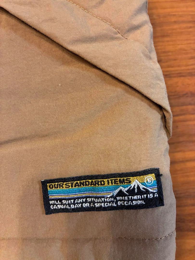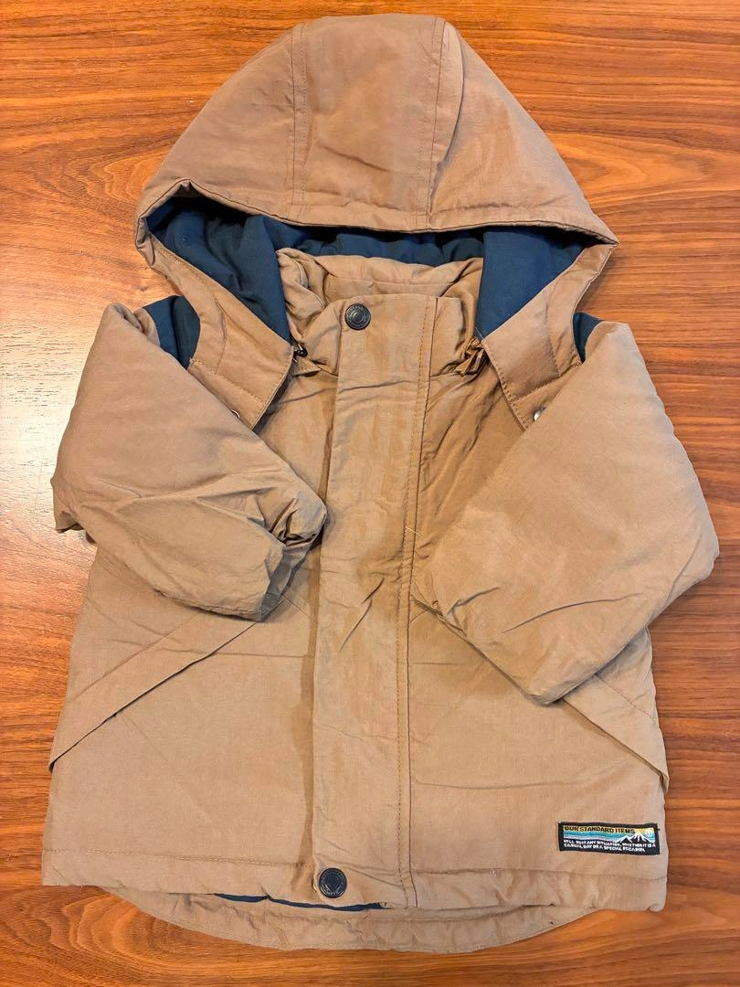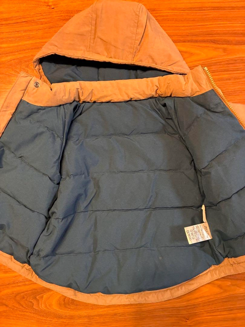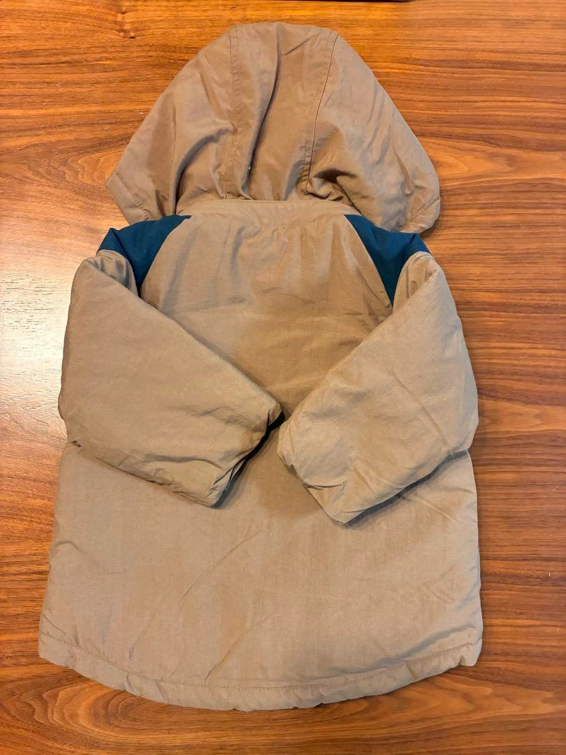 フード付きの軽量ベージュ中綿コートです。カジュアルや特別な場面に。 フードは取り外し可能です。 ブラウンにネイビーのデザインです。 襟のところに紐を付けていた跡があります。針を通した穴なので、目立ちませんが、写真をご確認下さい。 - 色: ベージュ - 特徴: フード付き、軽量、中綿コート - デザイン: シンプル、カジュアル - 用途: カジュアルや特別な場面に適している 受け渡し場所は、綱島駅、新綱島駅でも 可能です。