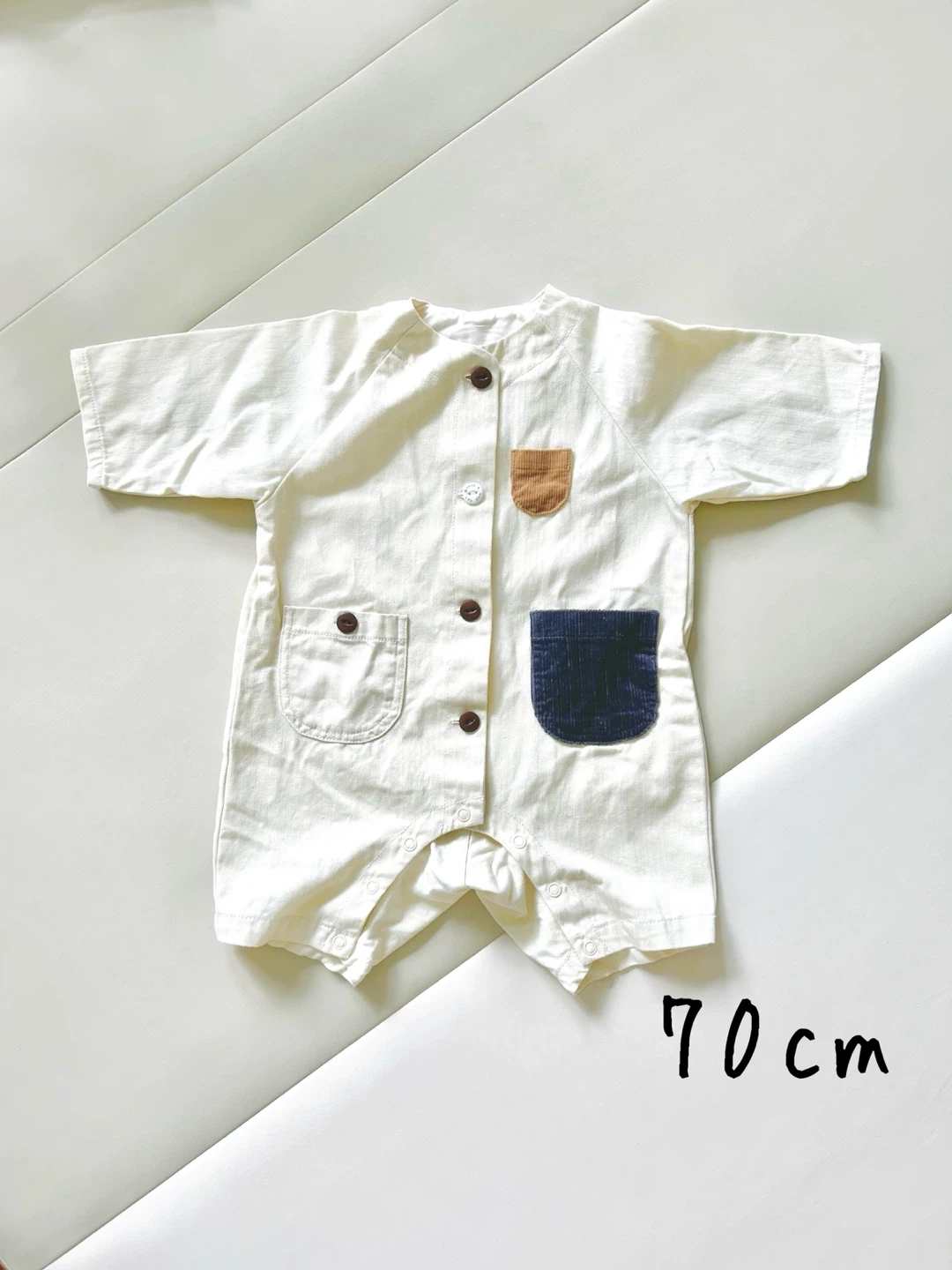 ブリーズのベビー服ロンパースです! 【情報】 ブランド:BREEZE (ブリーズ) サイズ:70 素材:本体、ポケット (綿100%)、左ポケット(綿98%、ポリウレタン2%) 【状態】 ほぼ新品 (ベビが生まれる前に買っておしゃれ着として着せるのを楽しみにしていましたが、いざオンシーズンで着せてみると我が子にはサイズアウトでした。タグを外して水通し済みですが、試着1回のみです。自宅保管をご理解ください。) 【その他対応可能な受け渡し場所】 ・錦糸町PARCO ・カメイドクロック