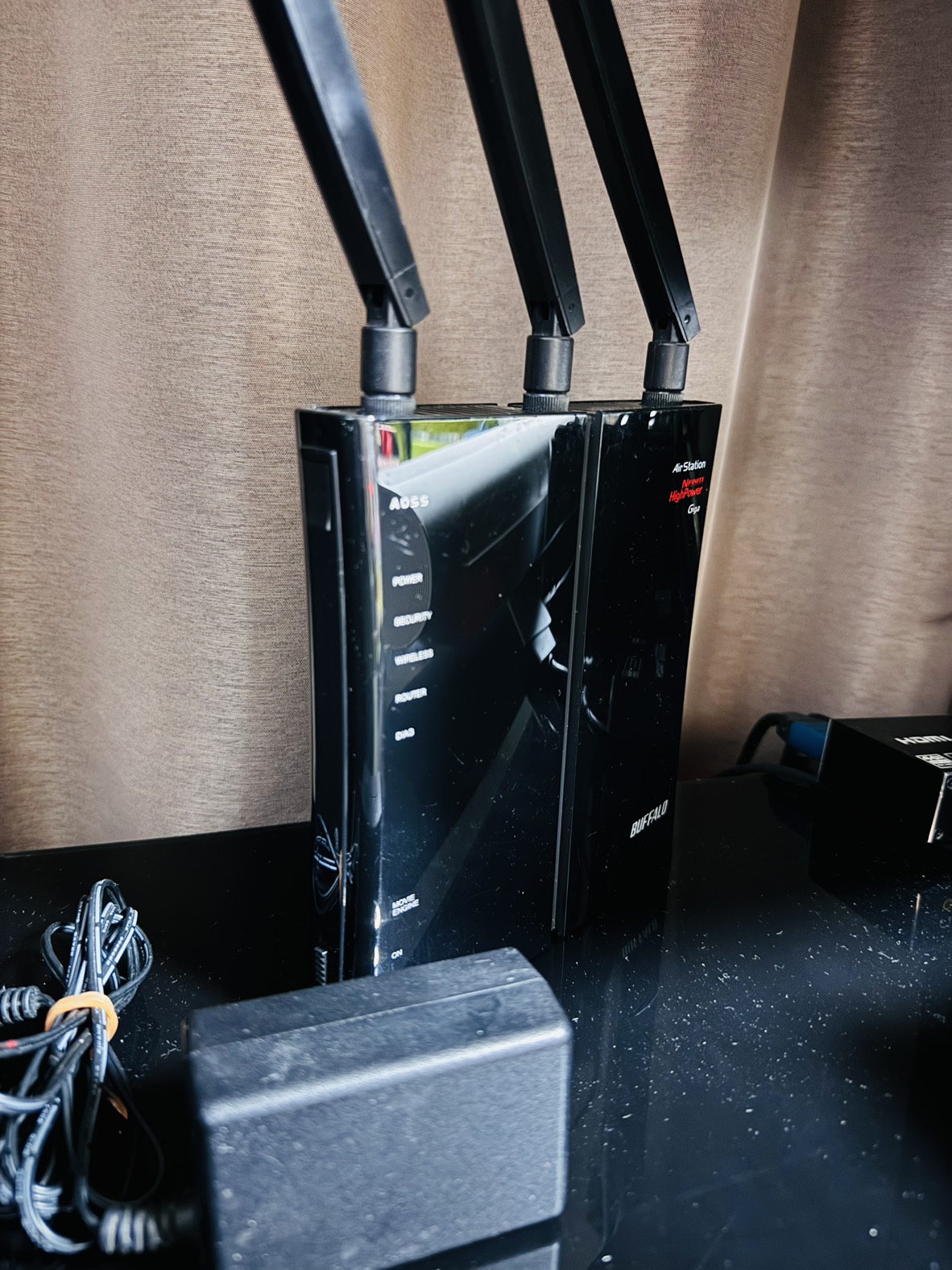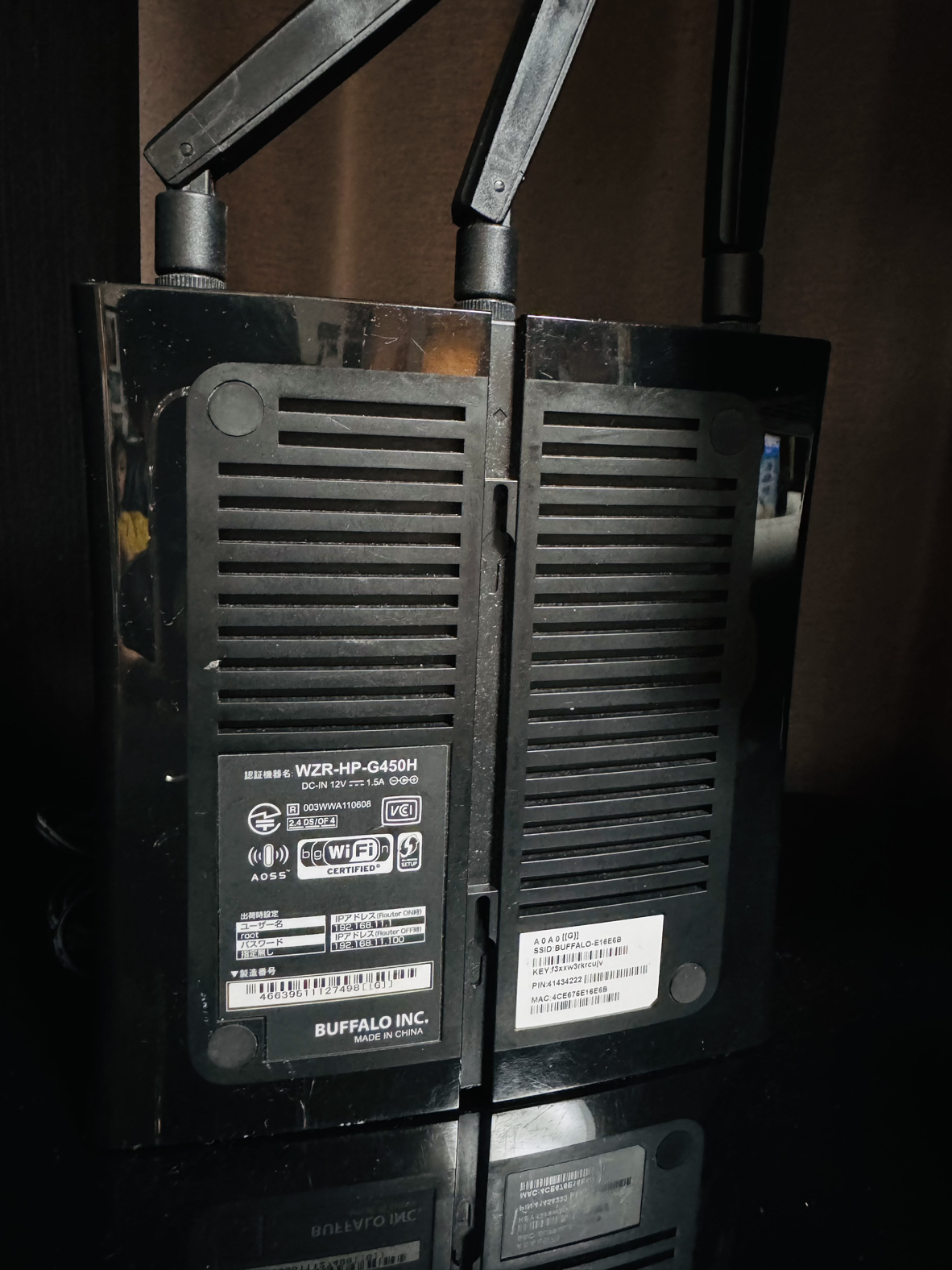 BUFFALOの無線LANルーターです。 最大450Mのwifi通信が可能。 中古品で本体およびアダプターのみとなります。 仕様 AirStation NFINITI HighPower Giga WZR-HP-G450H ブランド:BUFFALO AirStation 転送速度(2.4GHz):450 Mbps Wi-Fi(無線LAN)規格:IEEE 802.11n対応 IEEE 802.11g対応 IEEE 802.11b対応 アン テナ数:3 本 ポート数:4ポート 無線LANルーター機能:IPv6 NAS機能 ビームフォーミング MIMO VPNパススルー セキュリティ規格:WPA2 WPA WEP 無線セットアップ:WPS AOSS