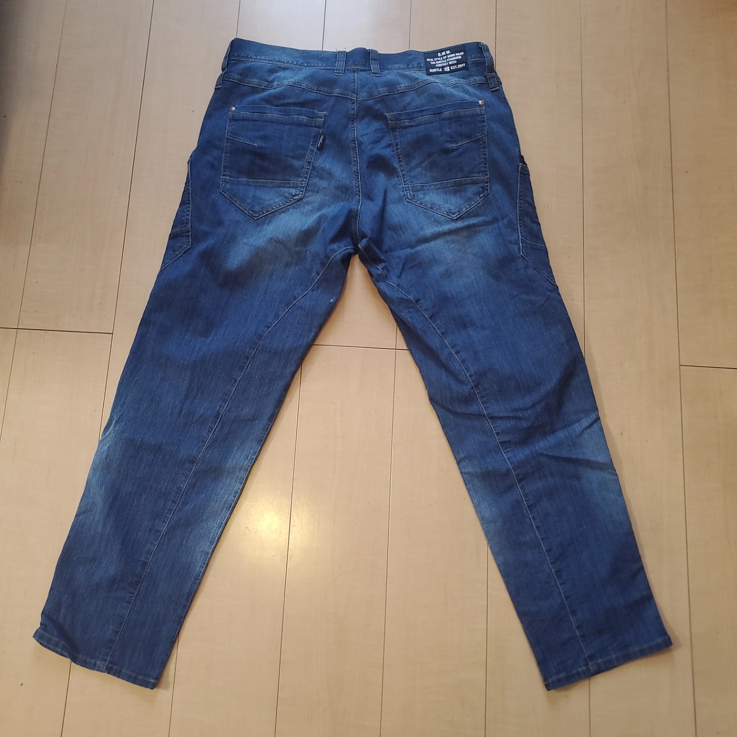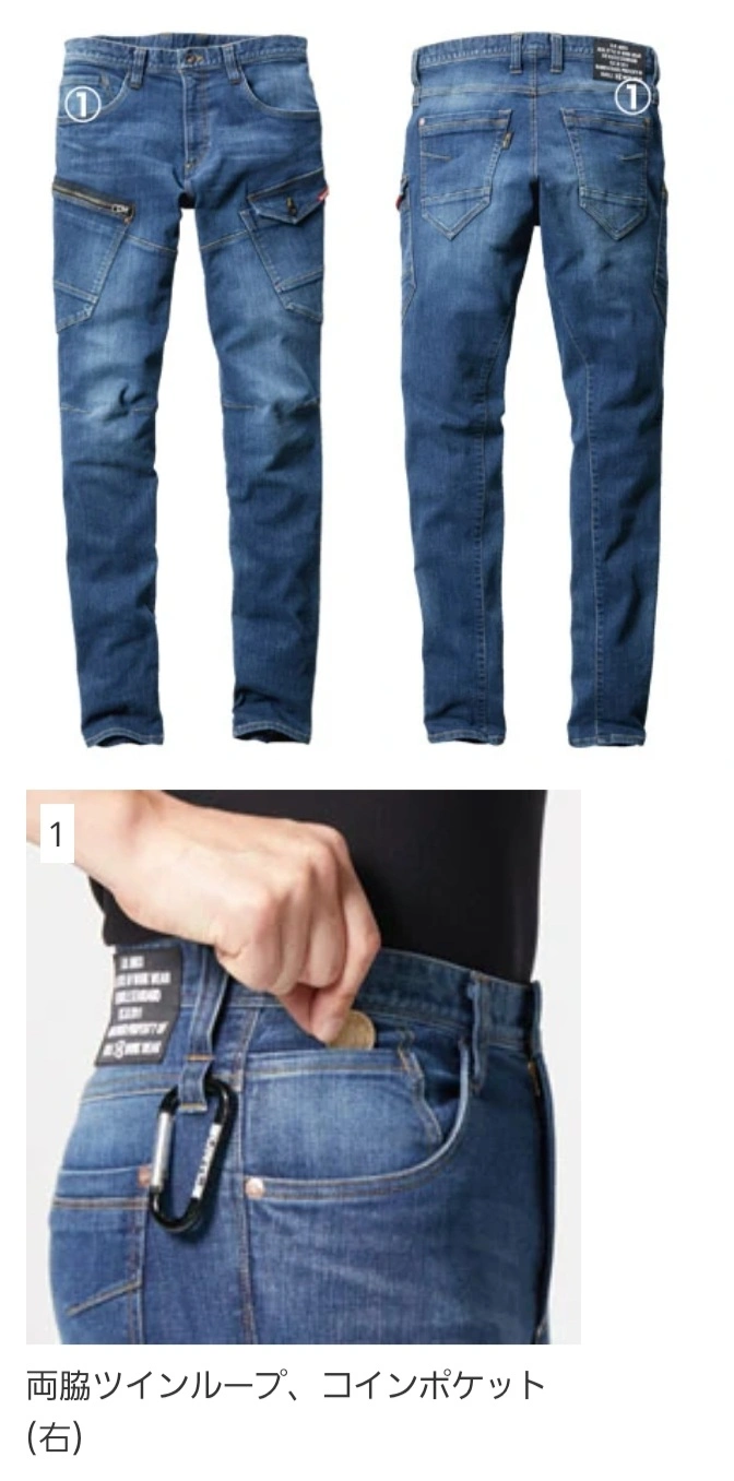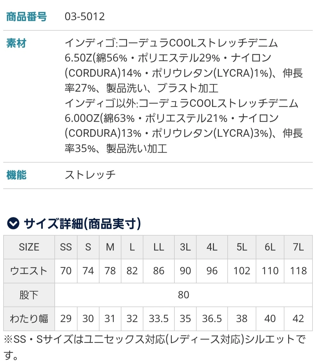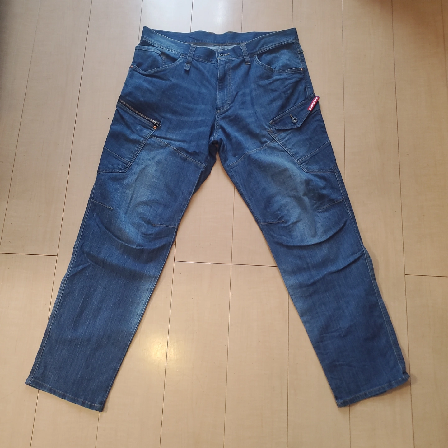2着購入して、こちらは1度着用したものです。 サイズが合わなかったため、出品します。 写真の通り少し白くなった部分があります。その他はキレイです。 ホームページで恐らくこちらと同じ商品を発見したので、サイズ詳細は写真にてご確認ください。 ストレッチの効いた、クール対応の生地を使用しているそうです。空調服とセットで涼しい作業をにオススメします。 人気で品薄状態のようです。ご検討下さい。 春夏用 バートル 5012 ストレッチデニムカーゴパンツ男女兼用