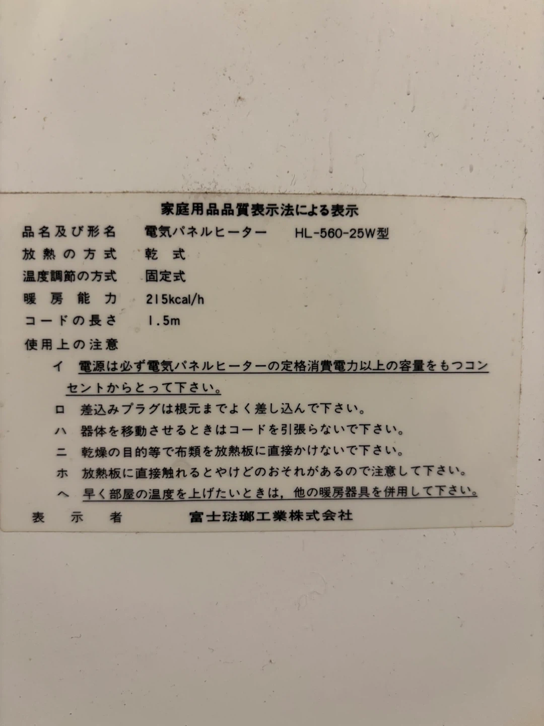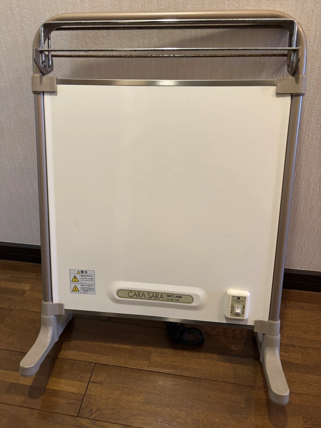 カーラサラ HOTLANDの電気パネルヒーターです。 しばらく使用してませんでした。 通電して温めてみました。 1分ほどで暖かくなり、1時間作動させてみましたが、正常に動作することを確認しました。 トイレや風呂場で使えそうですが、見栄え、古さを考えると 、ジャンク品の一歩手前でしょうか。 【情報】 ブランド:カーラサラ HOTLAND 型番:HL-560-25W 暖房能力:255w コードの長さ:1.5m 【状態】 使用感、サビあり ご不明点があればお気軽にお尋ねください。