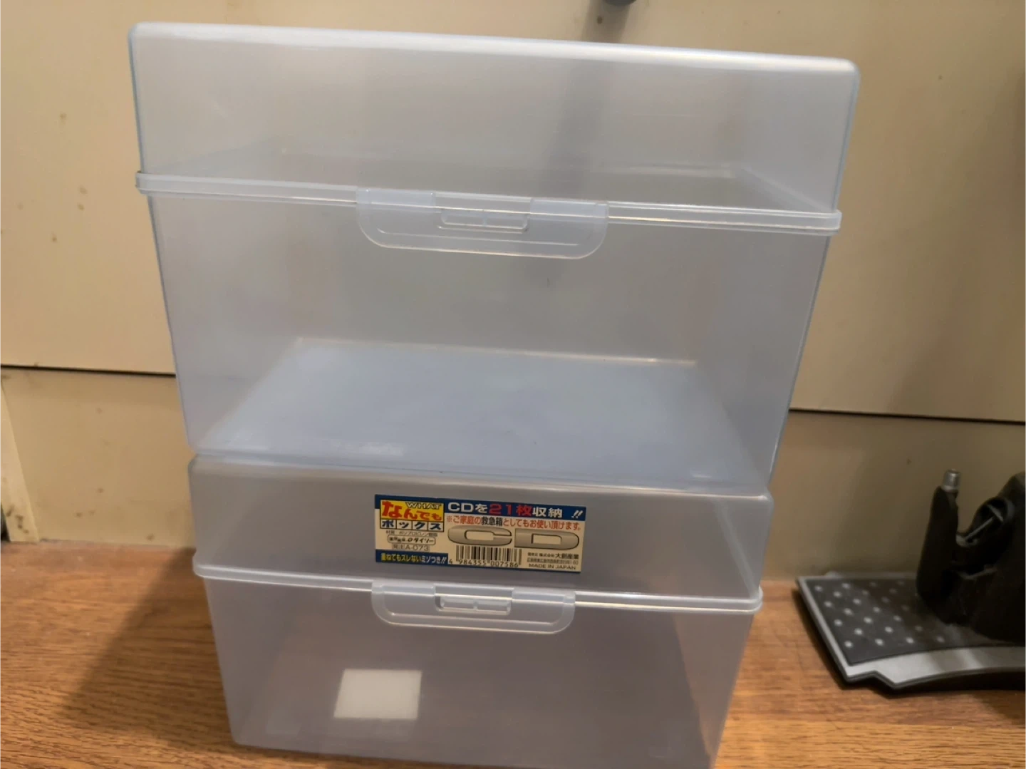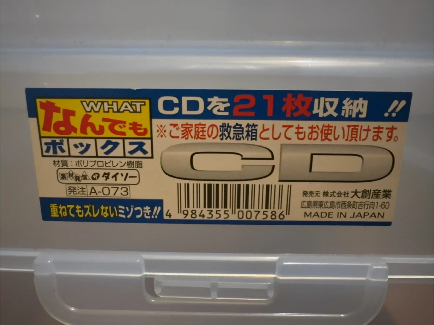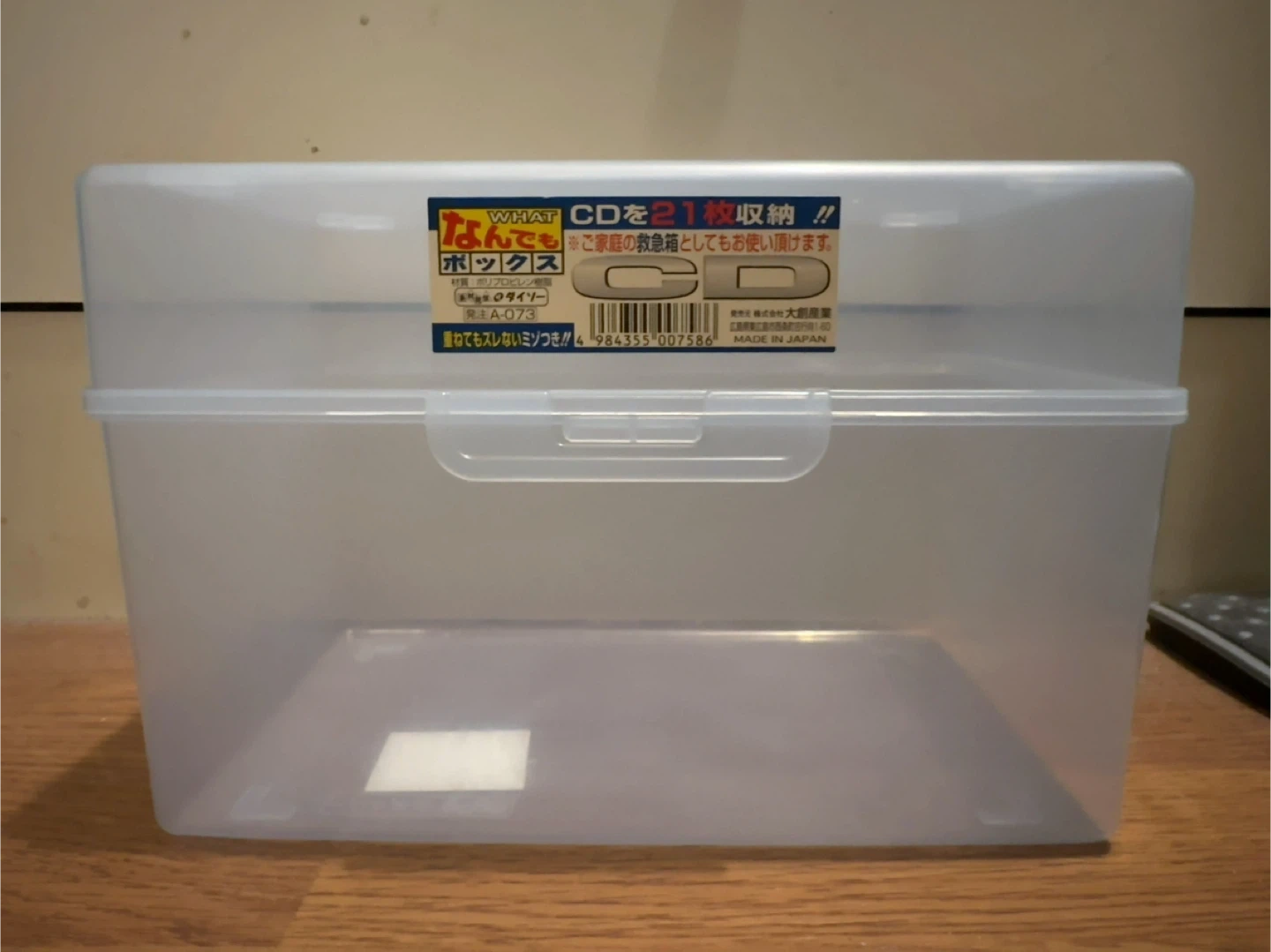 旧ダイソー製品の収納プラケースになります。 CDを21枚収納可能だそうです、ケースの薄さにより収納量は変わります。 廃盤製品の為現在ダイソーでは取り扱いがありません。 お近くの方で必要とあらばいつでもメッセージお待ちしております。