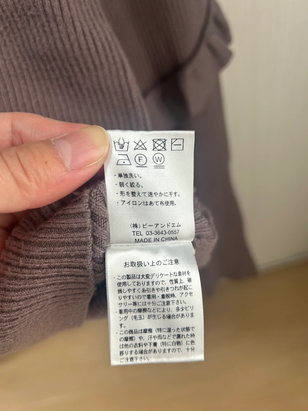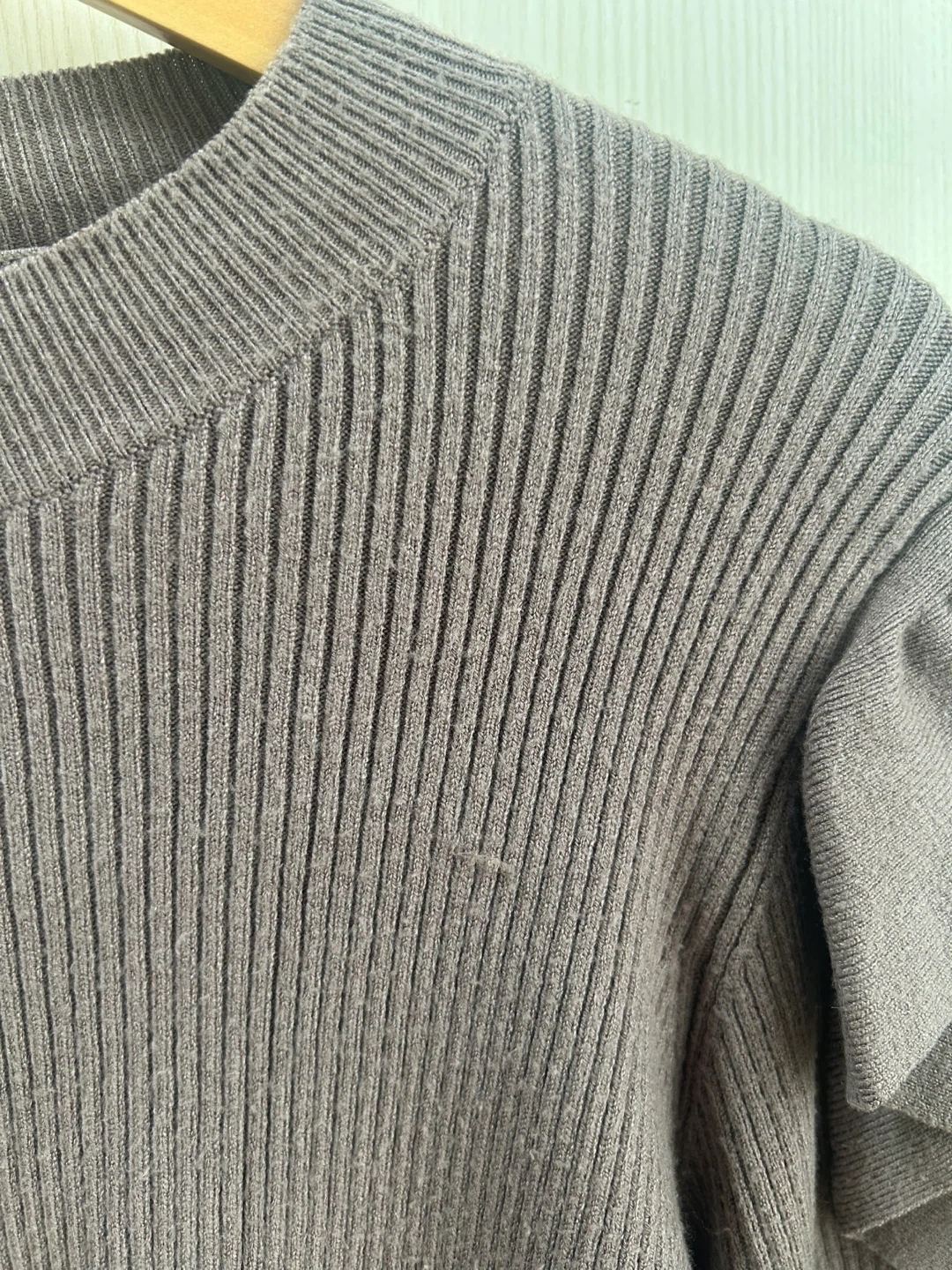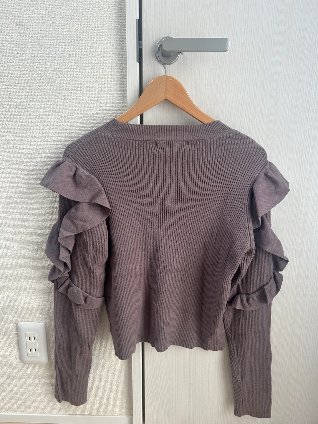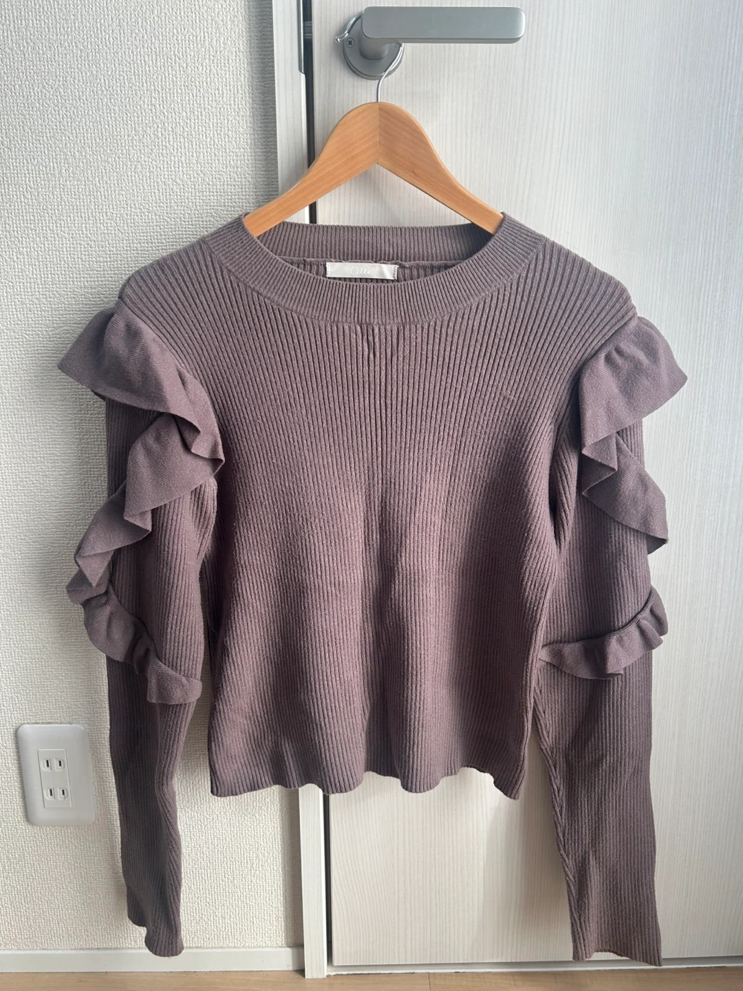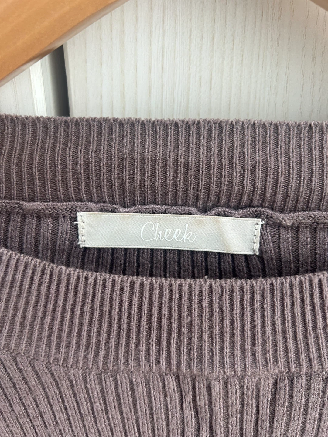 Cheekのニットセーターです♡ ・ブランド:チーク ・サイズ:M ・素材:レーヨン41%、ナイロン33%、ポリエステル23%、ポリウレタン3% ・色:紫がかった茶色(1、2枚目の写真参照) ・袖にフリルデザイン ・使用感少々あり(ほつれ、シミ) 中古品であることをご了承ください。 受け渡し場所は町田駅、成瀬駅でも可能です。