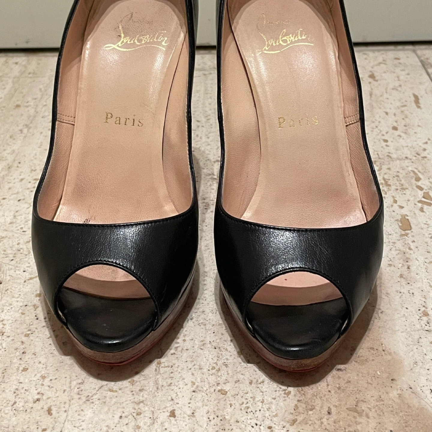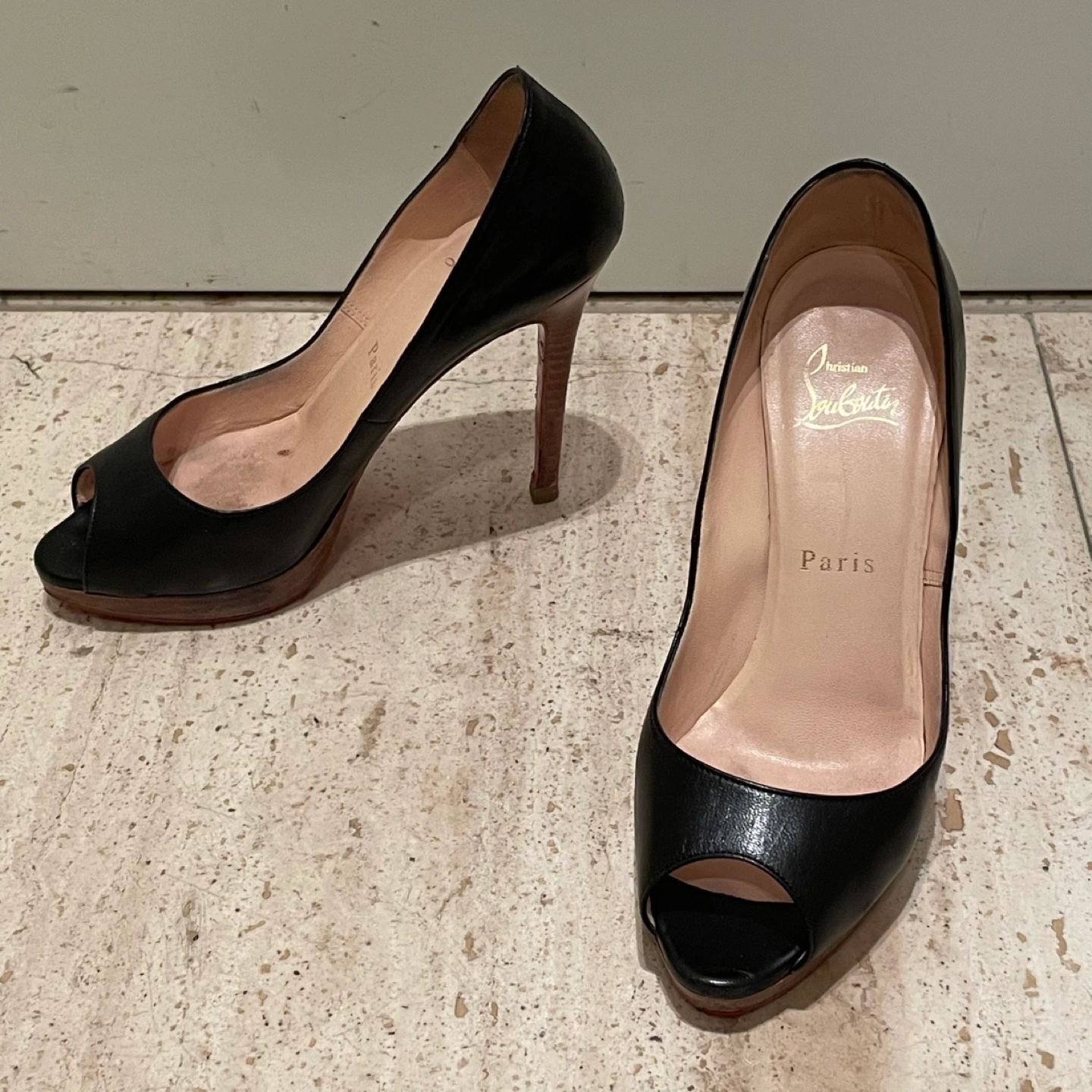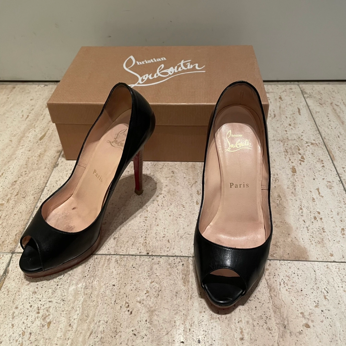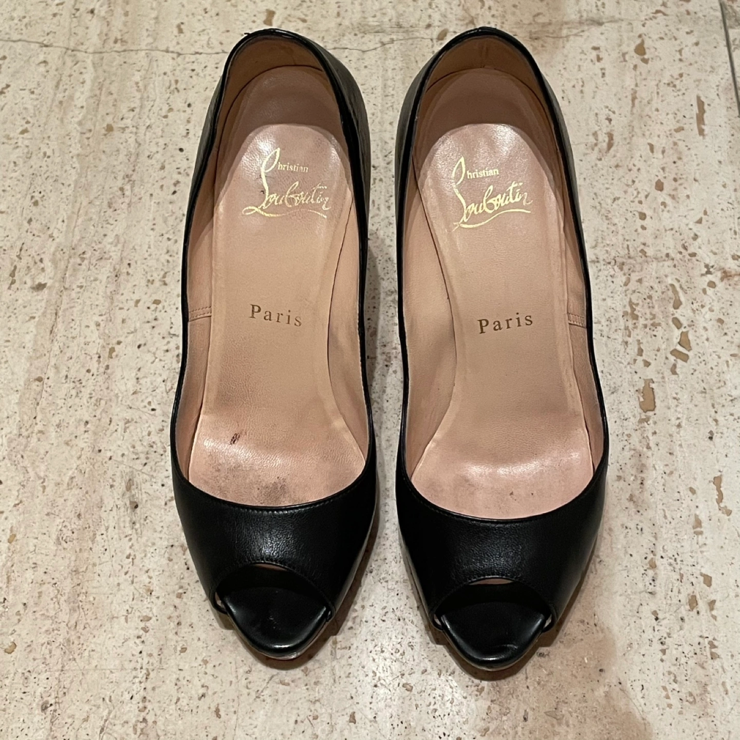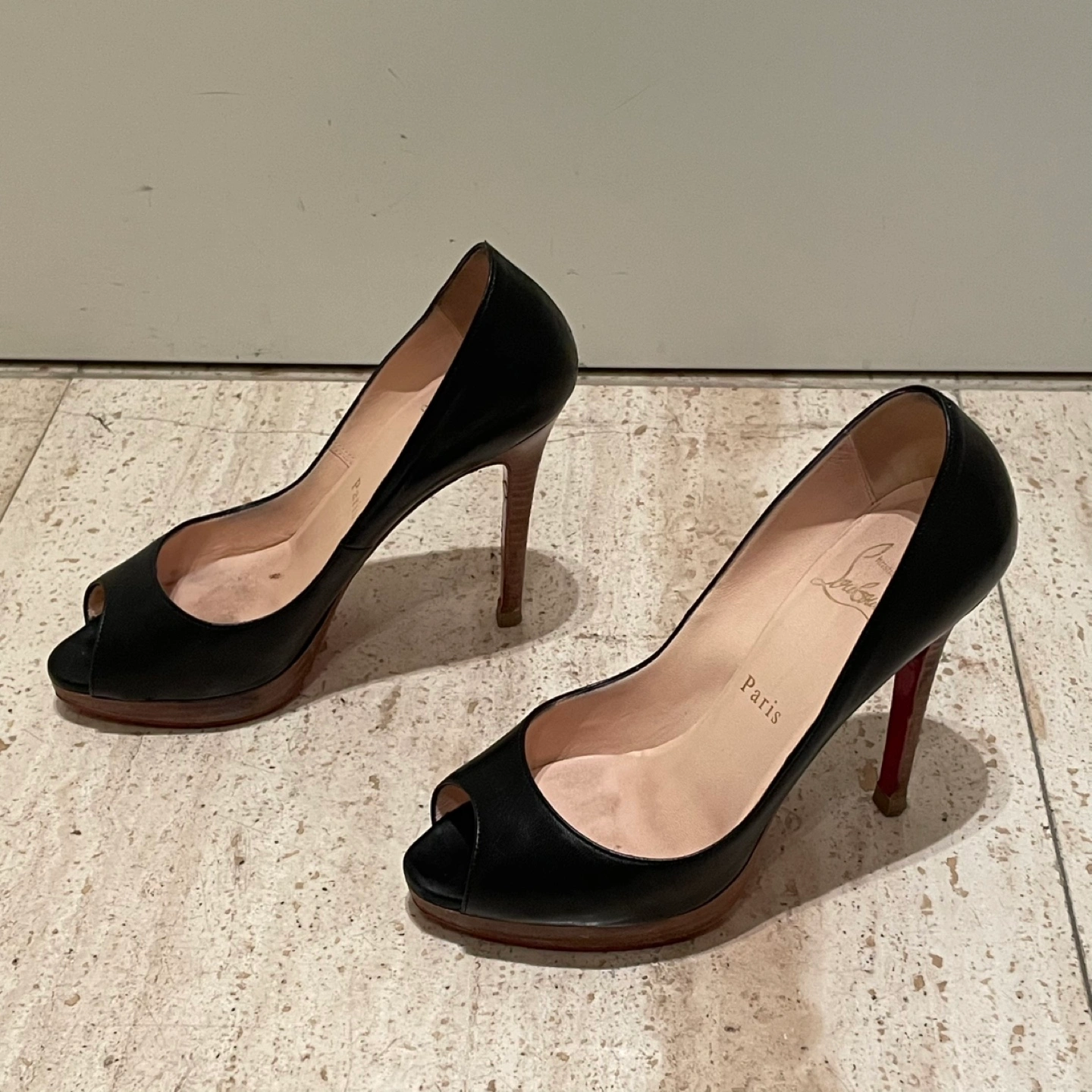 Christian Louboutin クリスチャンルブタン オープントゥパンプス ハイヒール ヒール11cm プラットフォーム 35.5 箱 保存袋あり 裏側などにスレ、汚れあり ソール裏張り 多少の使用感はありますが比較的綺麗でまだまだご使用いただけます 写真にて状態を確認してください 特に目立つキズや汚れはございませんが、 ユーズド品であることをご理解お願いいたします。 洗練されたデザインのクリスチャン・ルブタンのブラックオープントゥハイヒール。 - ブランド: Christian Louboutin - 色: ブラック - スタイル: オープントゥ - ヒールの高さ: 高ヒール - 製造国: フランス