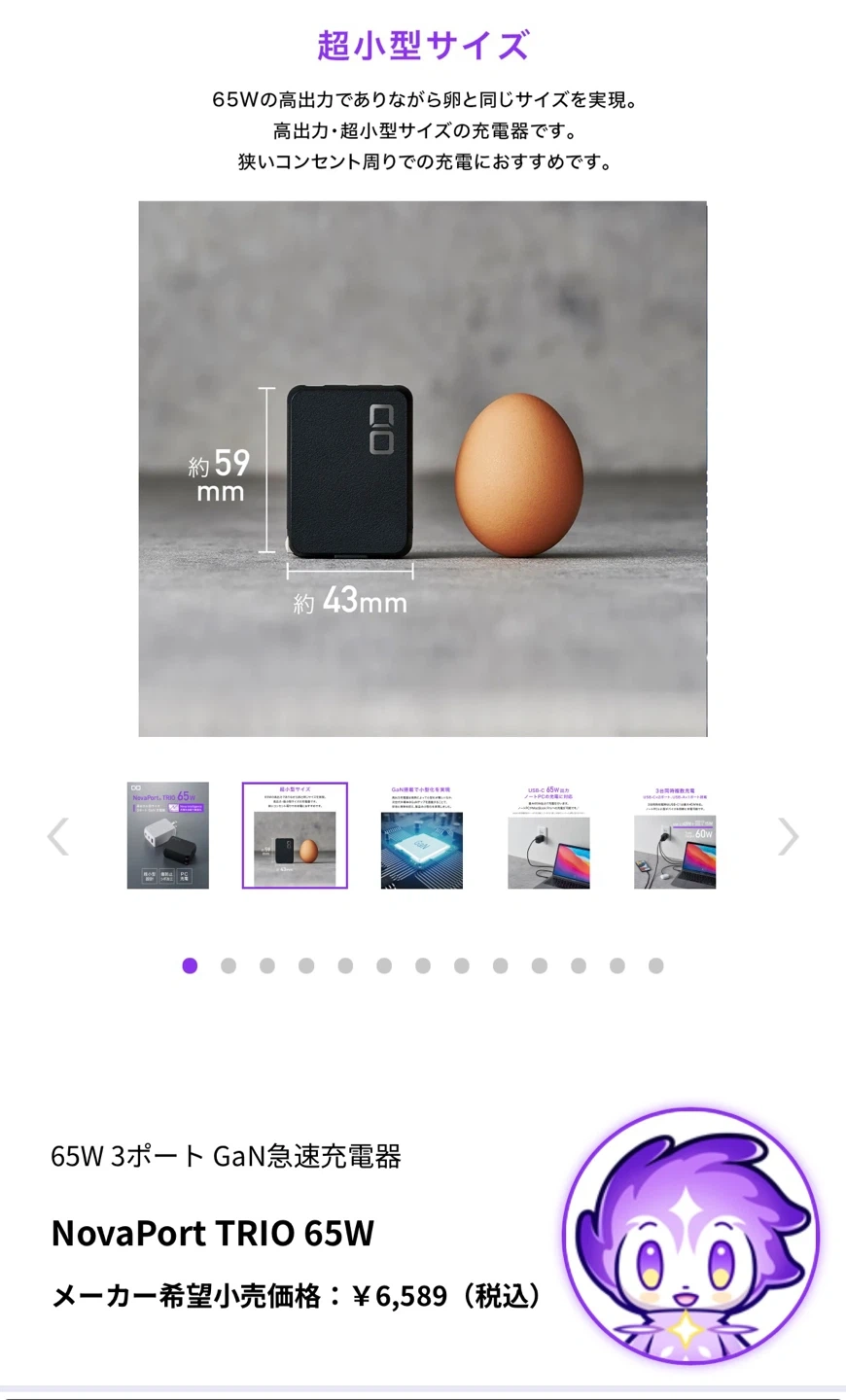 ご覧いただきありがとうございます。 販売価格は6589円で購入しました。 最初少しだけ使用しましたが、それ以降はほぼ未使用のため出品です。 3ポートで65WのGaN急速充電が可能なコンパクトな充電器です。 旅行などに活躍するサイズ感と良スペックを持ち合わせています。 - モデル名: NovaPort TRIO 65W - 出力: 65W - ポート数: 3ポート【Type-C】 - サイズ: 約59mm x 約43mm - 色: ホワイト - 機能: GaN急速充電 【状態】 使用感少なめですが、 中古品であることをご了承ください。
