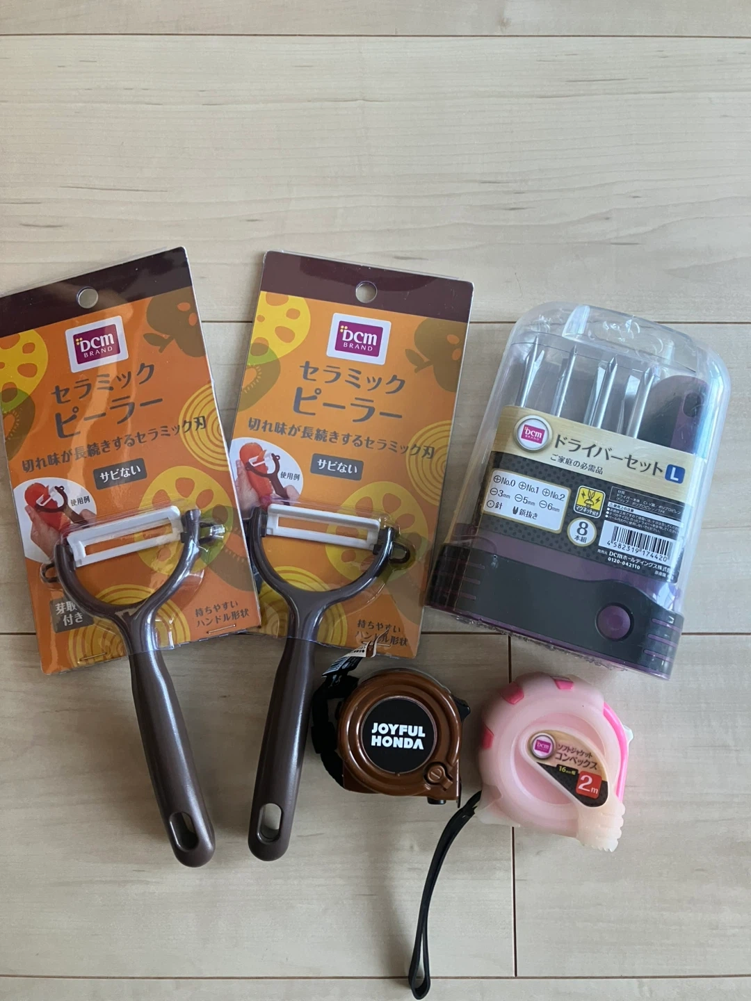 DCMのセラミックピーラー、ドライバーセット、メジャー、JOYFUL HONDAのメジャーです。 【情報】 ブランド:DCM、JOYFUL HONDA 商品:セラミックピーラー、ドライバーセット、メジャー 【状態】 未使用品 ペット、喫煙者なしです。 ピンクのメジャーは半透明のカバーの部分が経年変化で色がややくすんでいます。