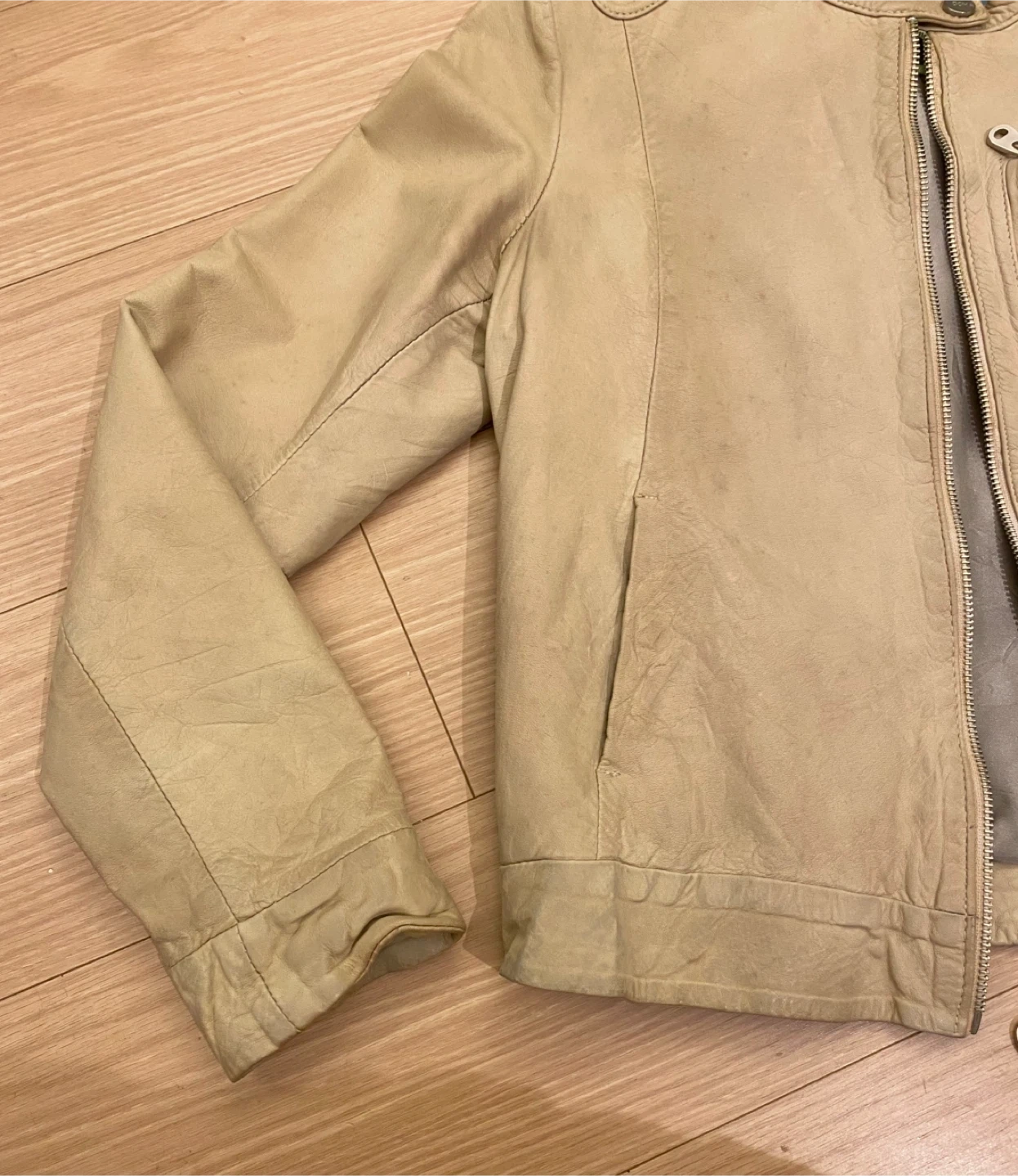 購入後、着用回数は3回程度です。 クリーニング後暗所にて保管していましたが、シミができてしまいました。あらかじめご了承ください。 牛革100% - デザイン: ジップアップ、ラウンドネック - ポケット: 胸ポケット、サイドポケット - 素材: レザー - 袖: 長袖 ご覧いただきありがとうございます。 レザー素材···本革 汚れ・破れ・臭いなど···あり 肩幅/身幅/袖丈/着丈 肩幅···38cm 身幅···43cm 袖丈···59cm 着丈···47cm