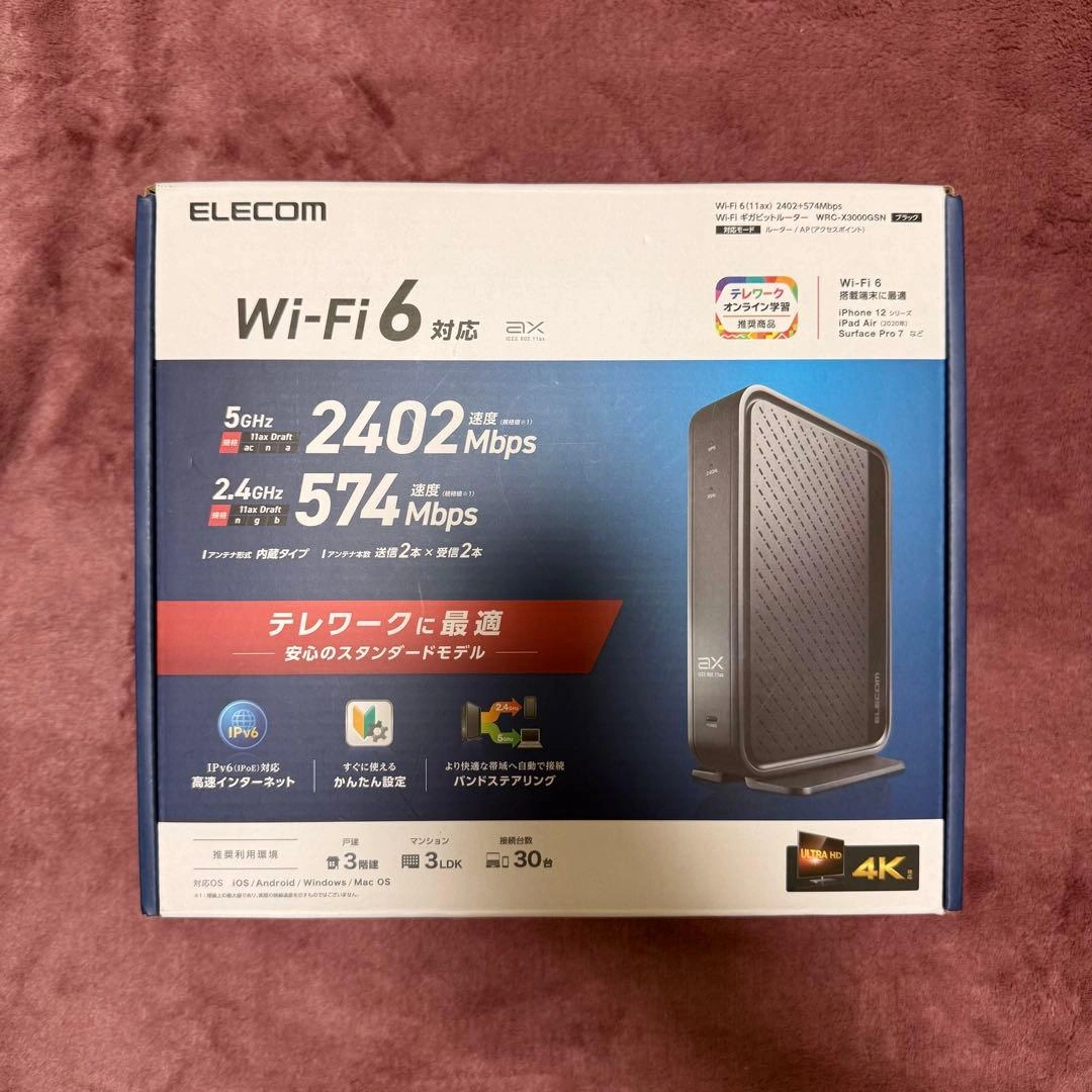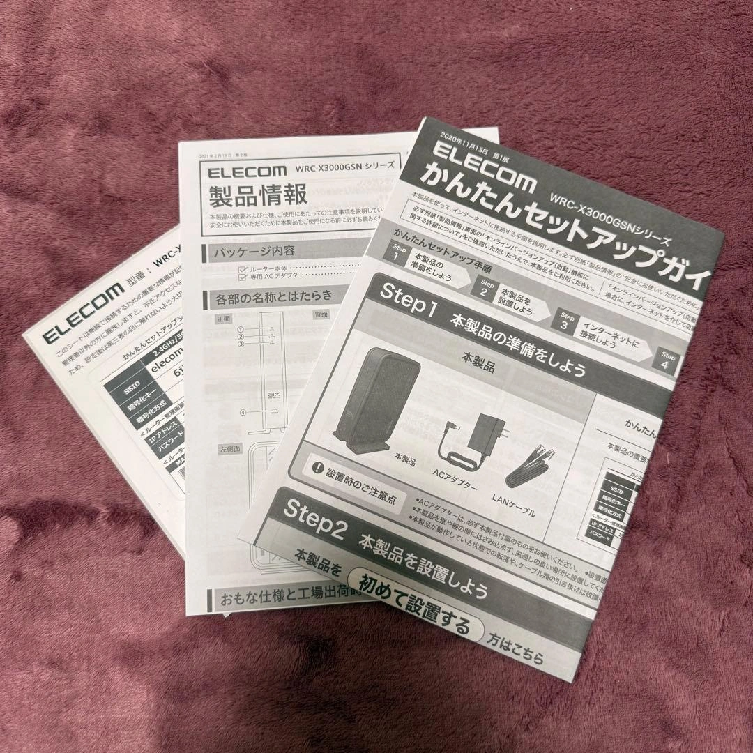 Wi-Fi 6対応の無線LANルーター、最大2402 Mbpsの通信速度です。 - ブランド: ELECOM - モデル名: WRC-X3000GNHシリーズ - Wi-Fi規格: Wi-Fi 6 - 最大通信速度: 2402 Mbps (5GHz), 574 Mbps (2.4GHz) - 付属品: 電源アダプター - マニュアル: セットアップガイド ご覧いただきありがとうございます。 本体のクリア部分はフィルムを剥がしていないので比較的綺麗な状態です。説明書も付いているので安心してご利用ください。