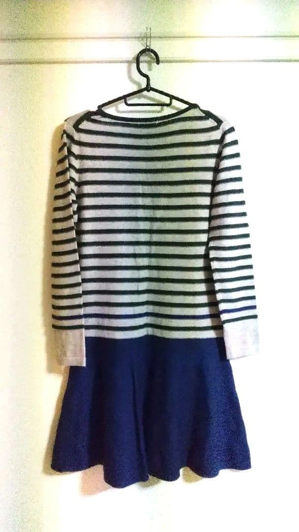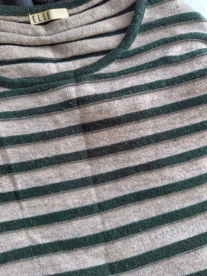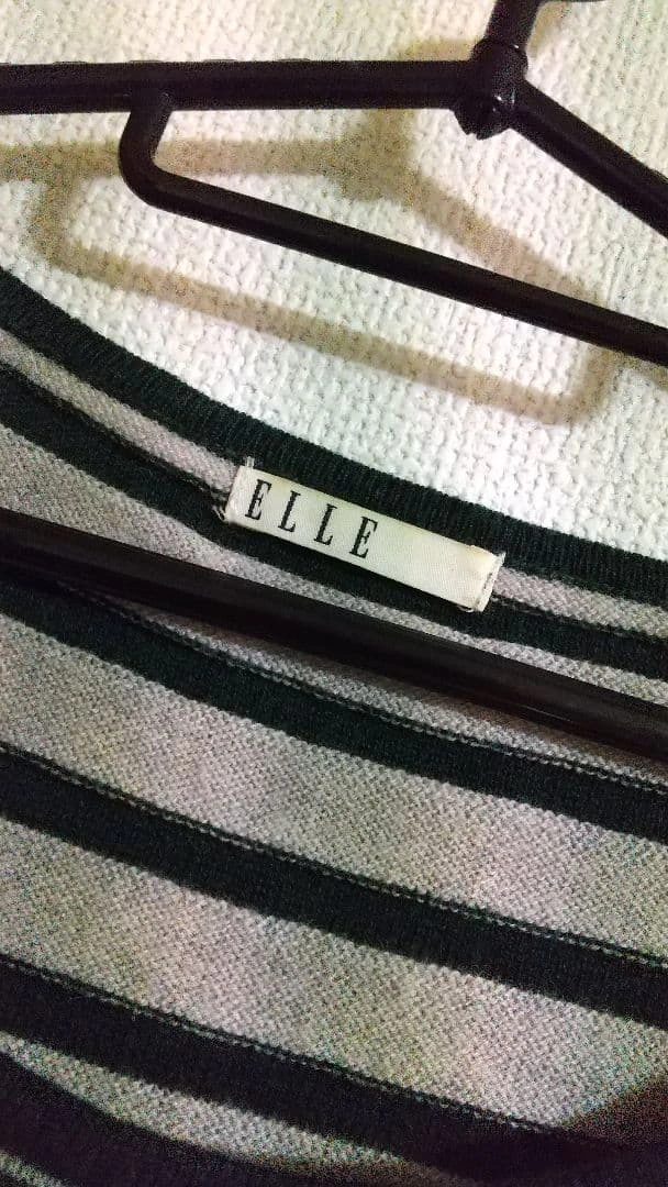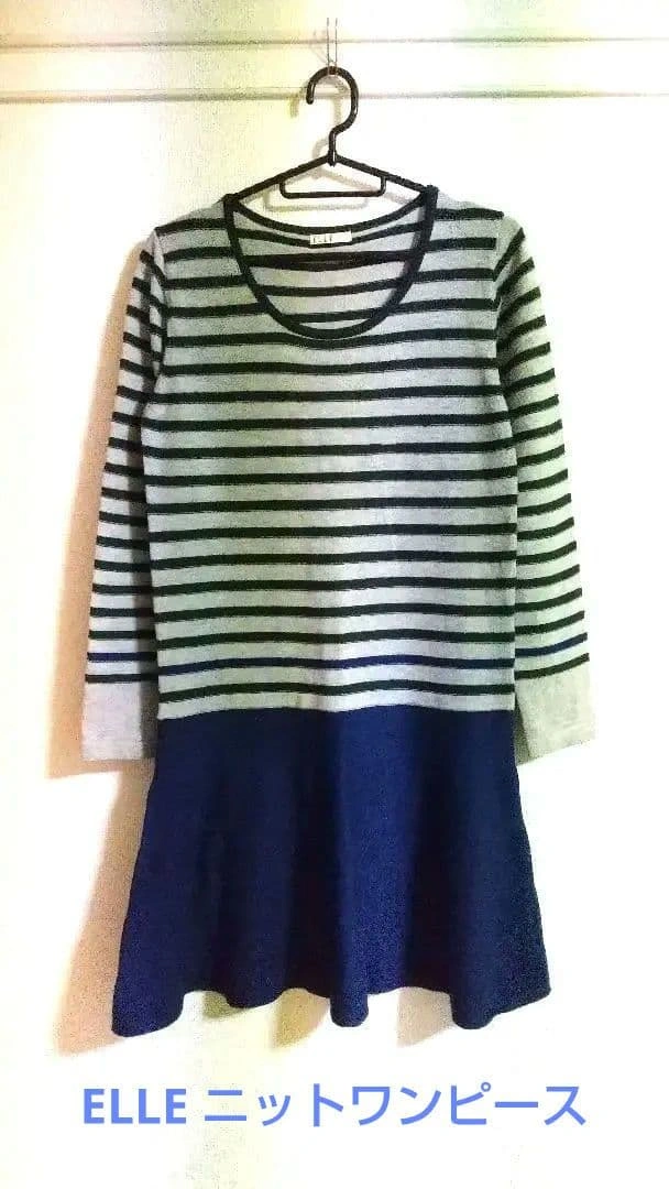 ELLEのニットワンピースです。 グリーンとグレーの細めのボーダーに、スカート部分は青色です。 保管と素材(ウール混)に伴う毛玉が多少あります。 中古・自宅保管品をご理解のうえ、よろしくお願いいたします。