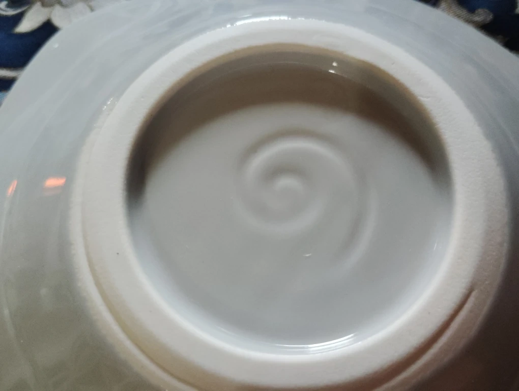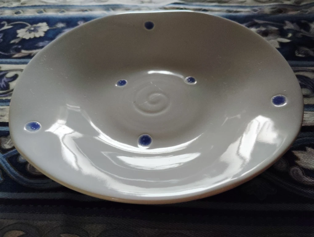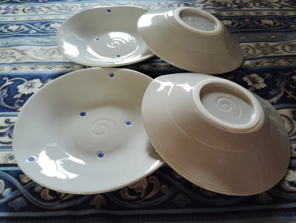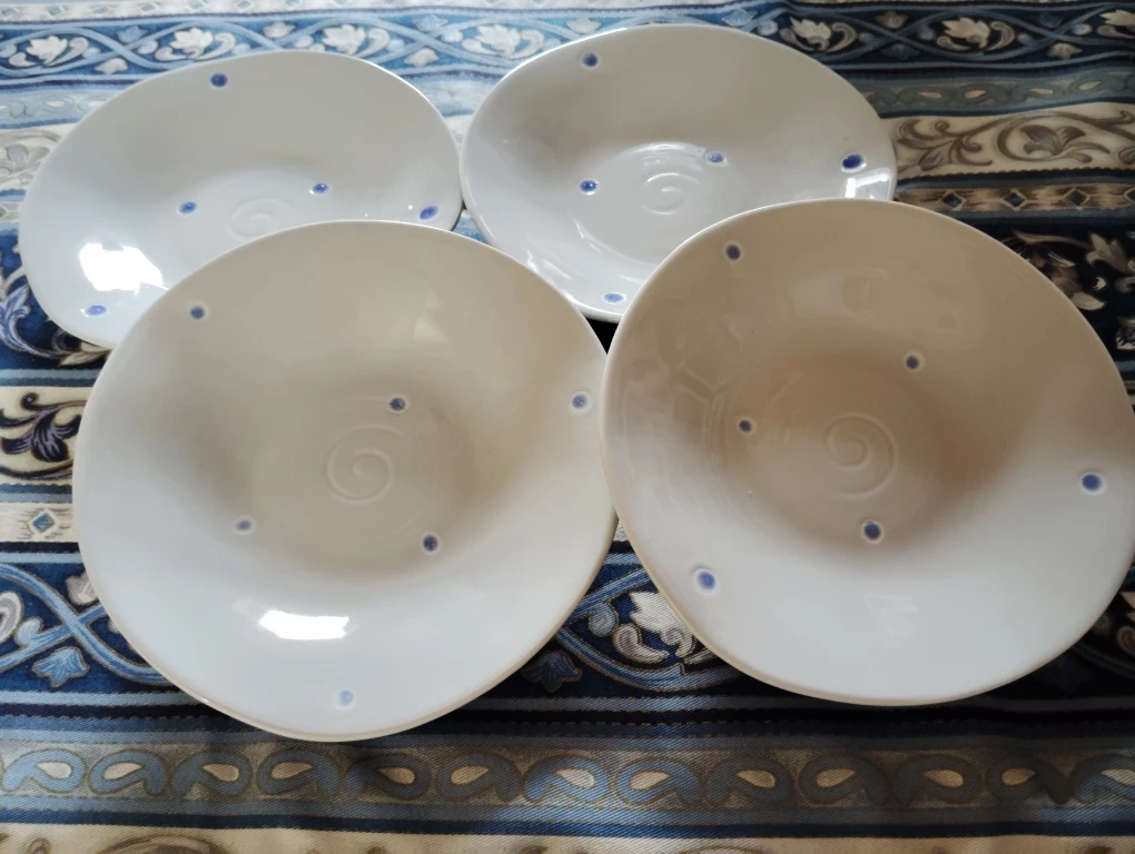 砥部焼   最後となってしまいました。 一つ一つ絵付けし焼き上げた器です。 傘を広げた様な形状、3箇所にうねりと跳ねがある。艶あり空色に膨らむ青のドット柄、凹む渦柄、指でなぞれば心は渦に惹き込まれる。 水色お皿4枚セットです。 ・水色に青い水玉模様 ・中央に渦巻き模様 ・やや深めの形状 -サイズ:(約)径17 高2.8  センチ