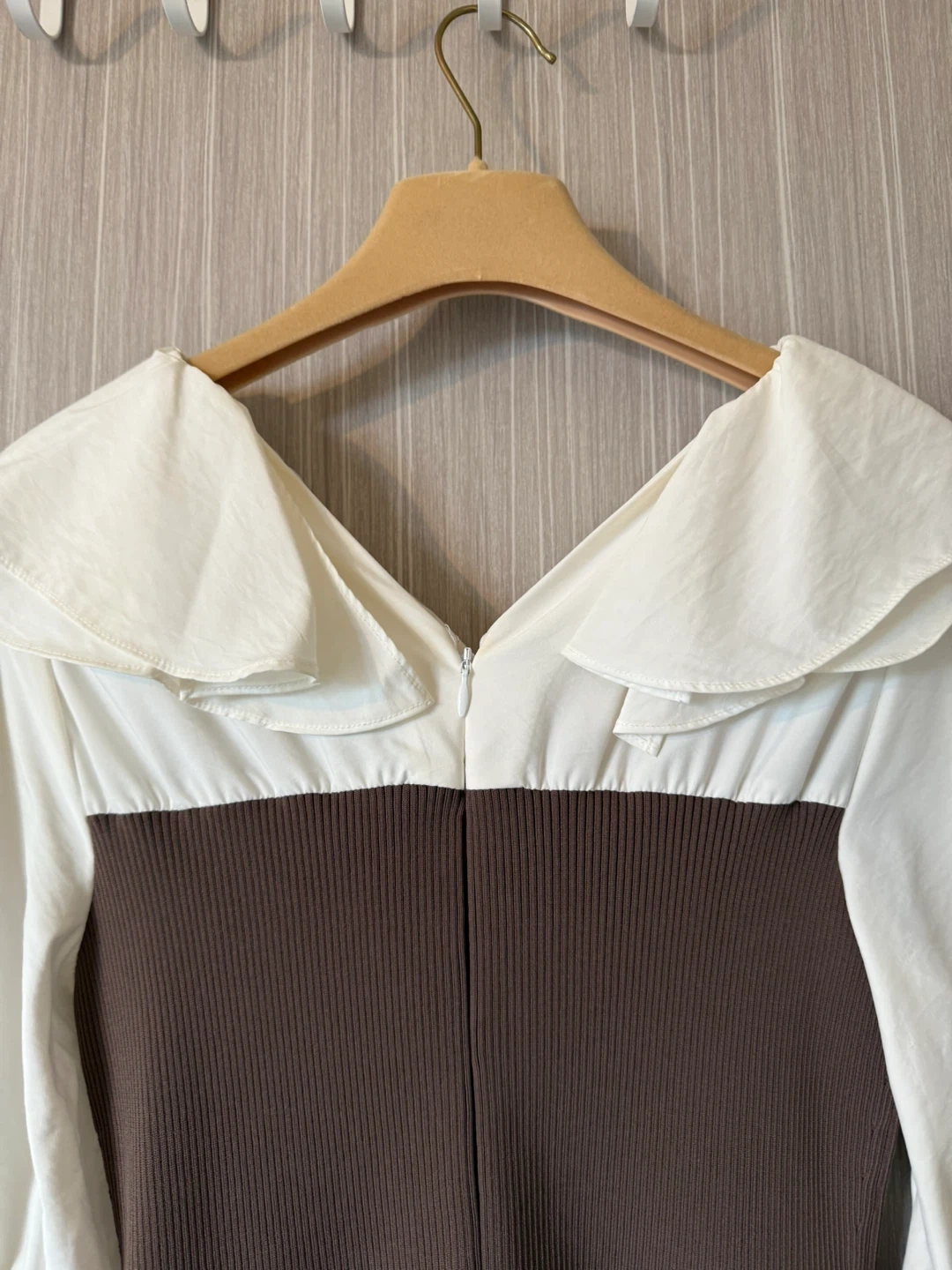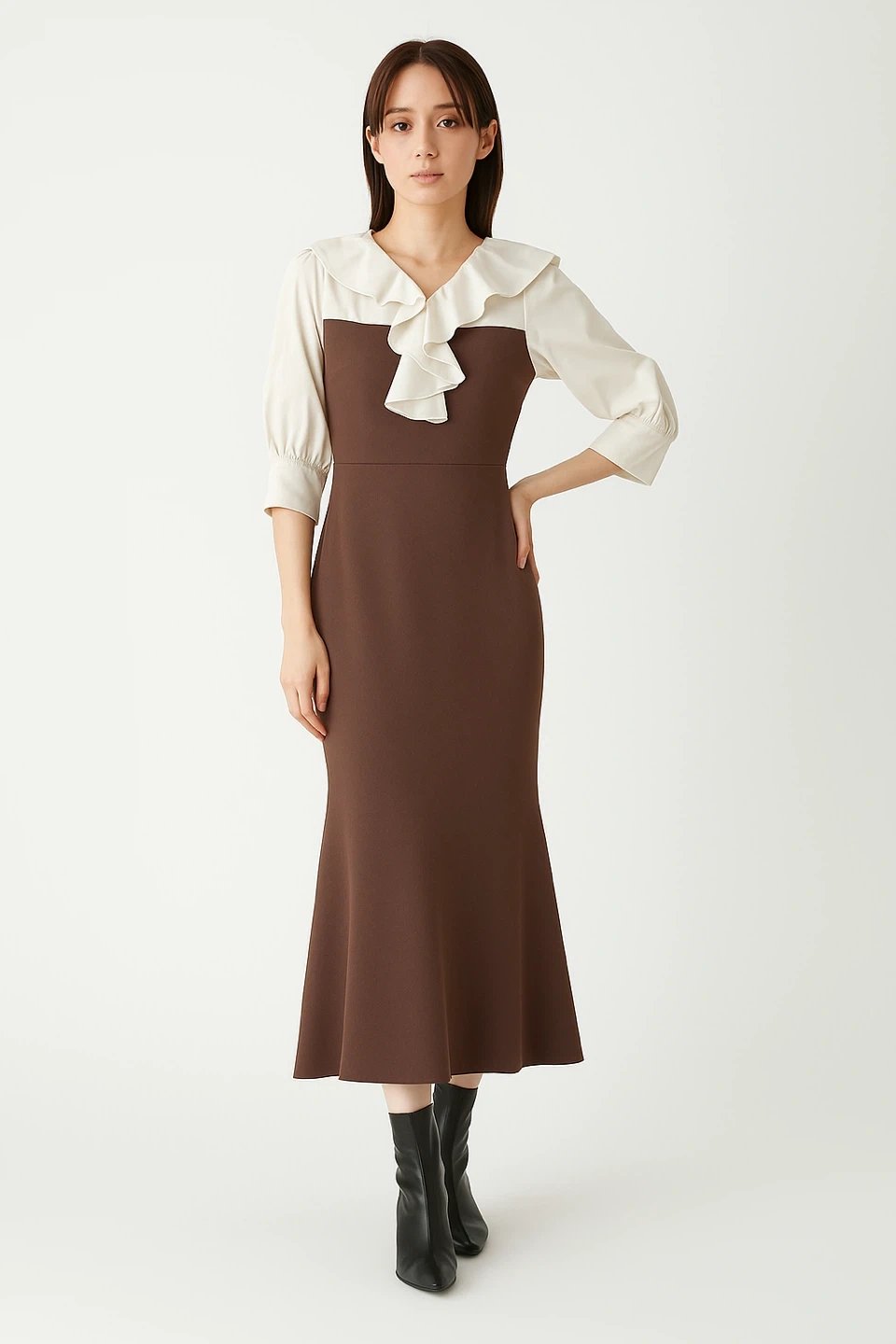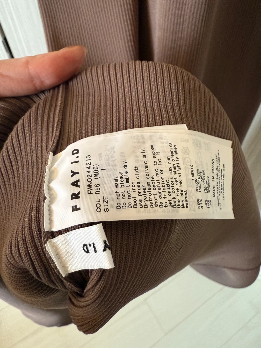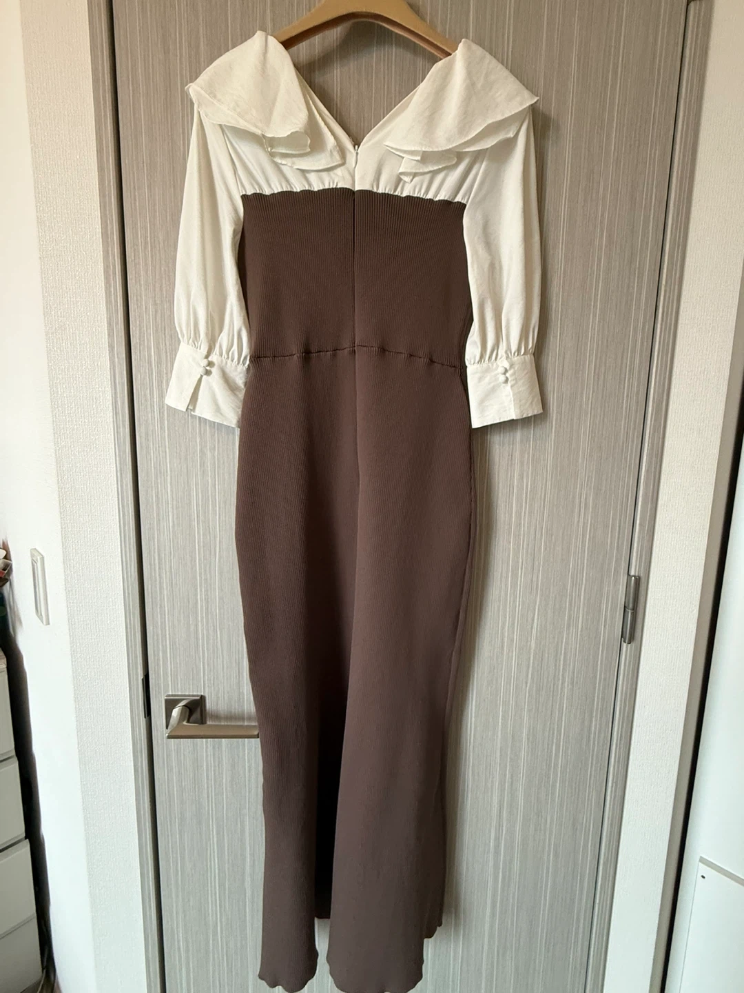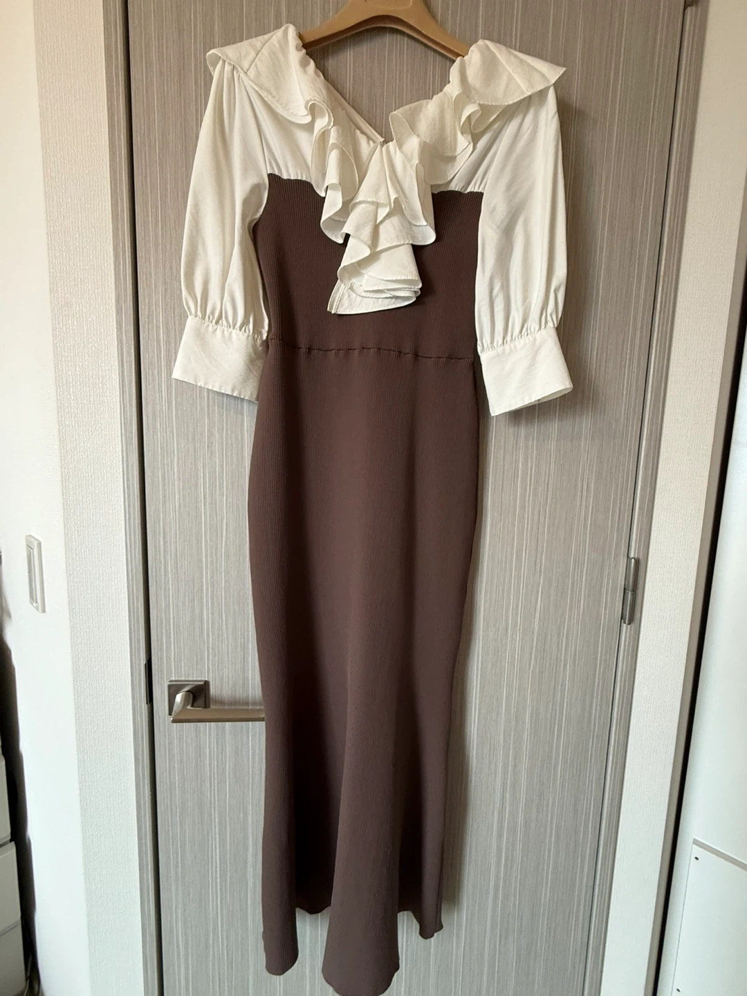 FRAY I.D フレイアイディーのワンピースです 【情報】 ブランド:フレイアイディー 型番:FMN0244213 サイズ:1 カラー:056(MOC) 肩から下まで125cm ウエスト部分平置き30cm 【状態】 使用感少なめ 3-4回着用 モカ色の着画像がなかったので、AIで黒いワンピースをモデルさんが着用しているものを色変えしました。 参考にご覧下さい。 引き渡し場所はご相談下さい。