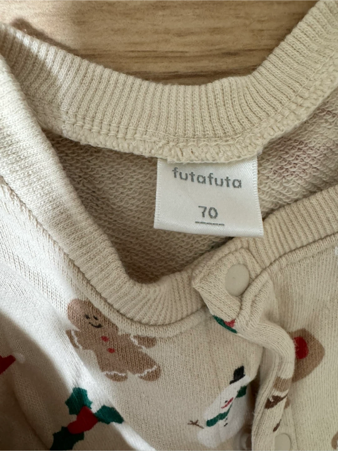 バースデイブランド、futafutaのベビー服ロンパース70cmです。 ・ブランド:futafuta ・サイズ:70cm ・素材:本体 綿100%、リブ部分 綿95%、ポリウレタン5% ・クリスマス柄(サンタ、トナカイ、ジンジャーブレッドマン、雪だるまなど) ・状態:使用感はありますが、目立つ傷や汚れはありません 去年のクリスマスで着用しました。 数回しか着用しておりませんが、 中古品であることをご了承いただける方でお願いいたします。