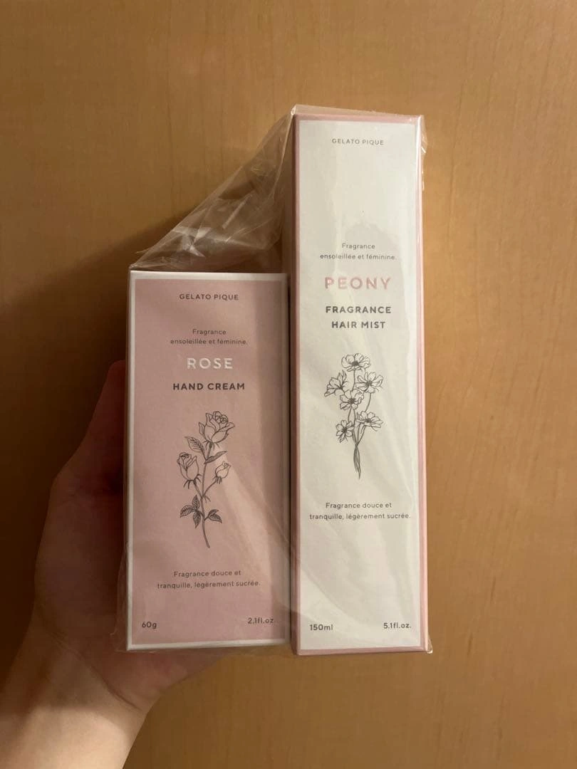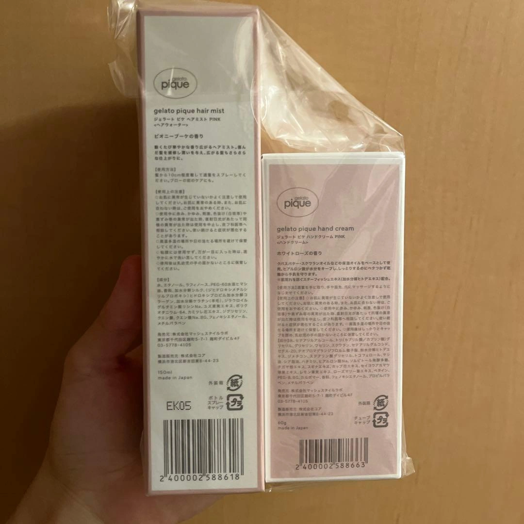 ローズの香りのハンドクリームとピオニーのフレグランスヘアミストのセットです。 - ブランド: gelato pique - 製品名: ハンドクリーム - 香り: ローズ - 内容量: 60g - 製品名: フレグランスヘアミスト - 香り: ピオニー - 内容量: 150ml ご覧いただきありがとうございます。 頂いたものなのですが使用する機会がないためお譲りいたします。新品未開封です。 ご希望の方はお気軽にご連絡ください。