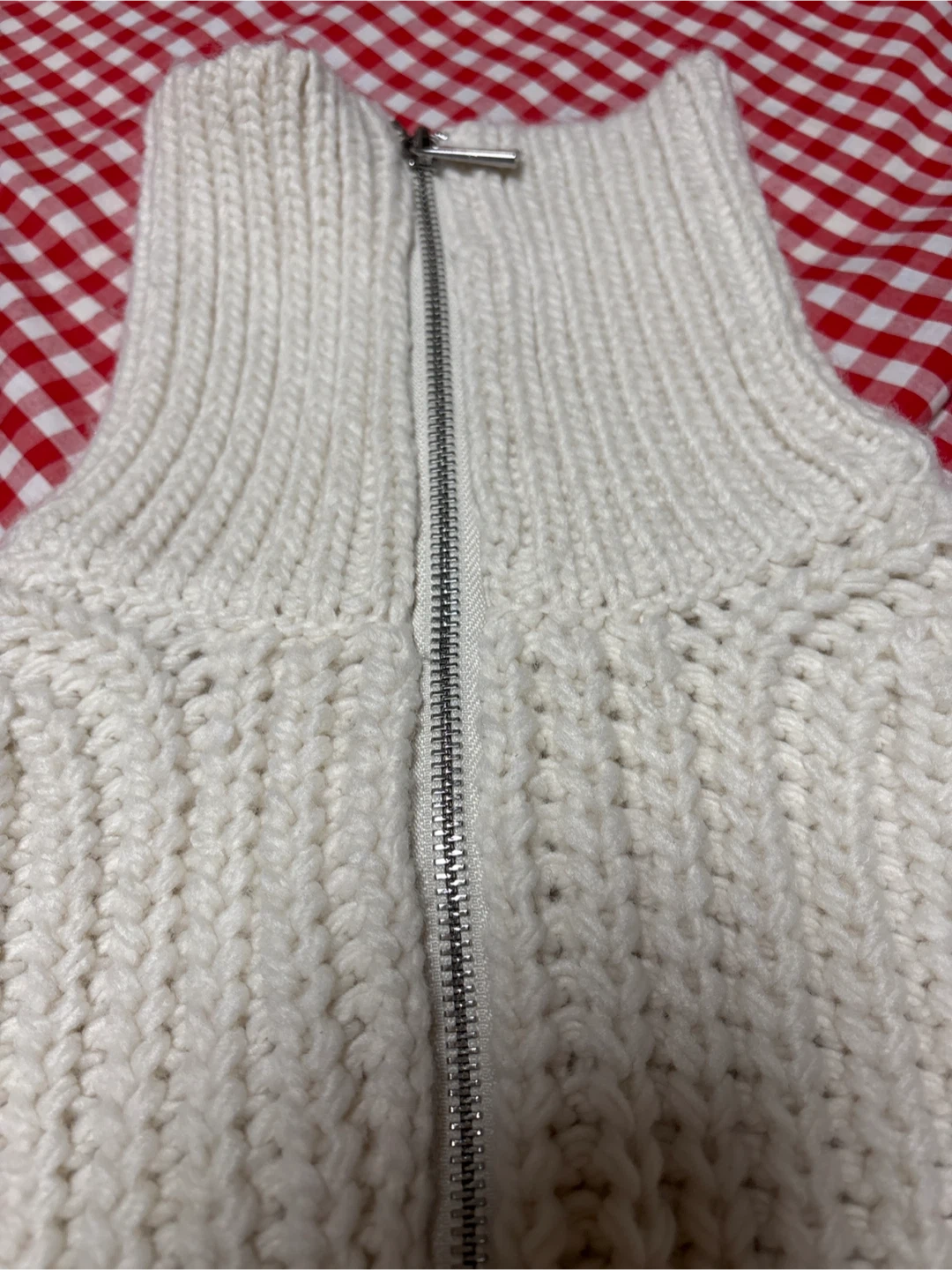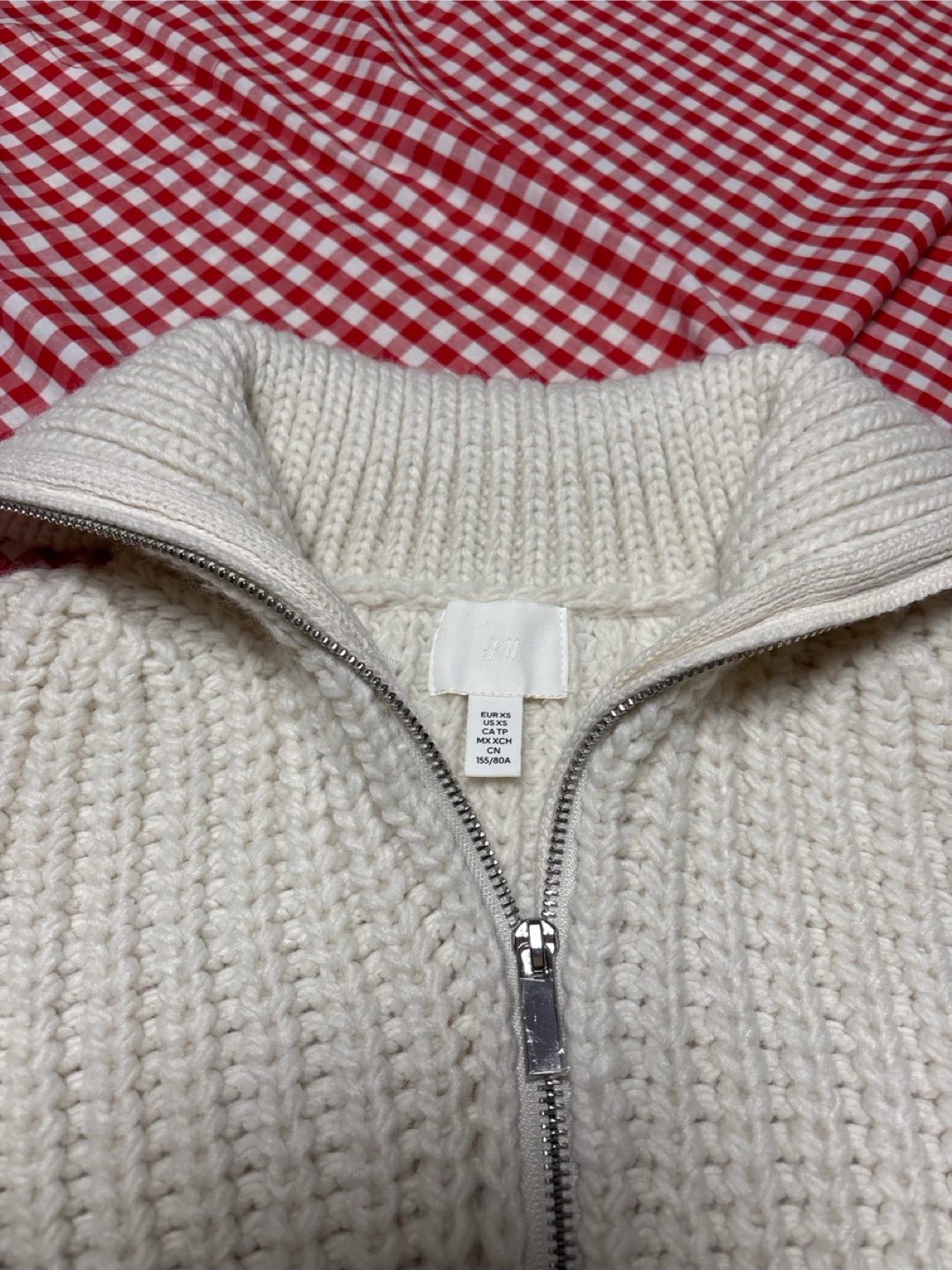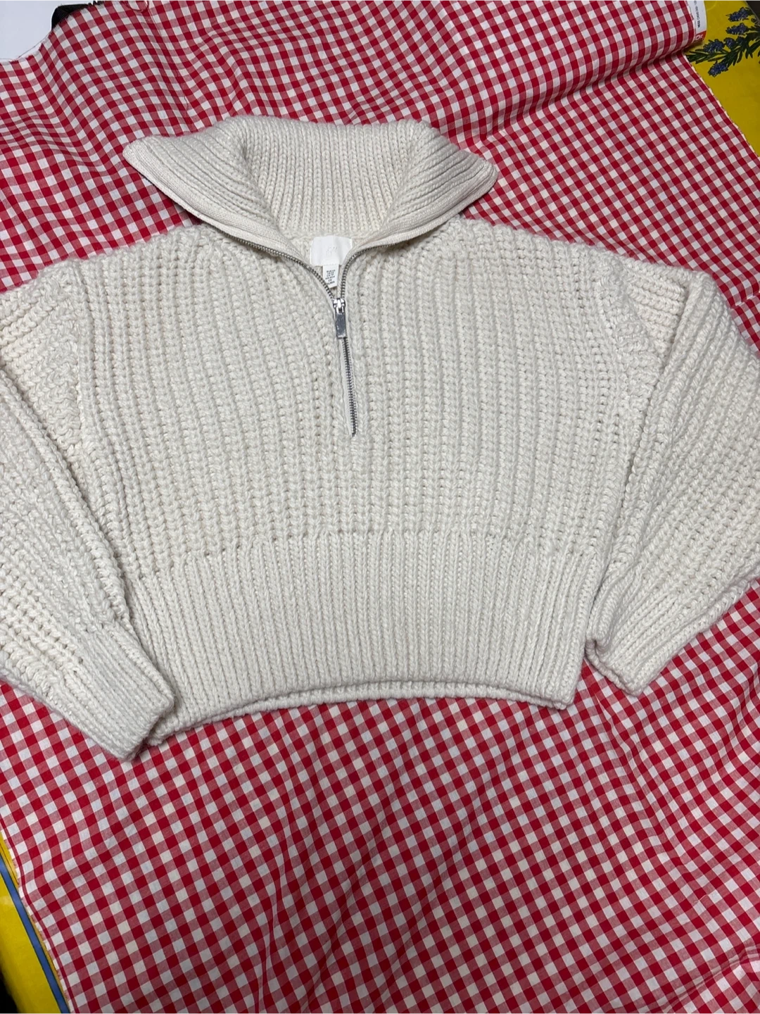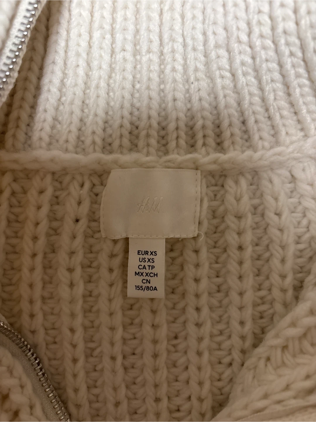 H&Mのハーフジップニットです。サイズ表記にXSと書いてありますが167㎝の女子が数回着ていたものです。ですからMとさせて頂きました。Lサイズのも言えそうなサイズです。 サイズ肩幅43㎝、身幅48㎝着丈39㎝ 丈が短いスタイルです。 ・ブランド:H&M(エイチアンドエム) ・サイズ:M ・色:オフホワイト ・素材:アクリル50%、ポリエステル45%、ウール5% ・状態:使用感少なめ よろしくお願いいたします。