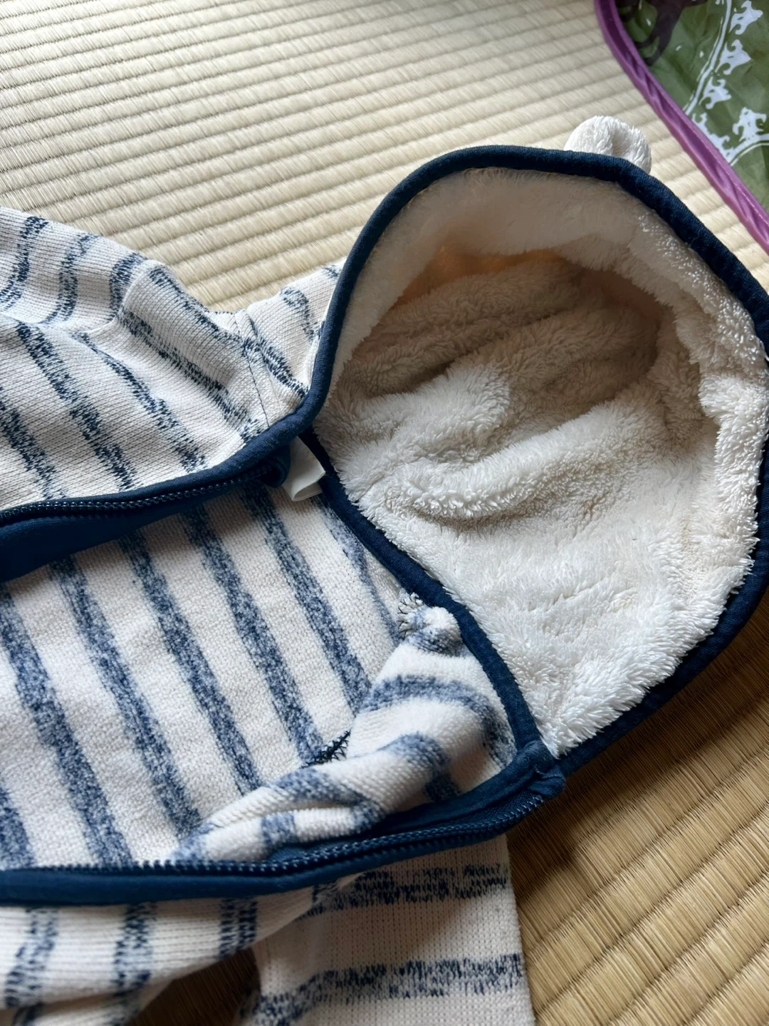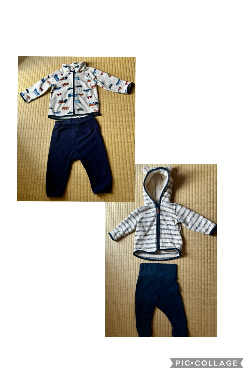 H&Mのベビー用フリース上下セット、2点まとめ売りです。 どちらも柔らかく暖かい素材で、秋冬シーズンにぴったりのアイテムです 1セット目(車柄) 白地に車やバスなどの乗り物柄がかわいいフリースジップアップジャケットと、ネイビーのパンツのセット。 軽くて動きやすく、普段着やお出かけにおすすめです。 2セット目(くま耳ボーダー) ボーダー柄のパーカーはフードにくま耳付きで、内側はふわふわのボア素材。 ネイビーのパンツと合わせてナチュラルでかわいい雰囲気です。 【サイズ】68(目安:4-6か月頃) 【ブランド】H&M 【状態】どちらも全体的にきれいな状態。 パンツに若干の毛羽立ちがありますが、目立つ汚れや破れはありません。 【お手入れ】ホームクリーニング済み 【保管環境】ペット・喫煙者なし