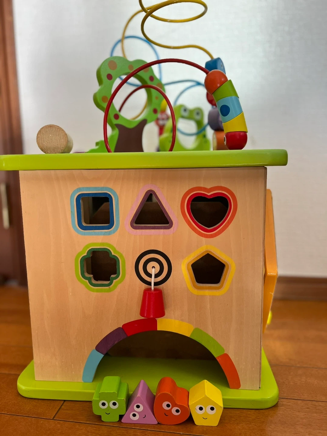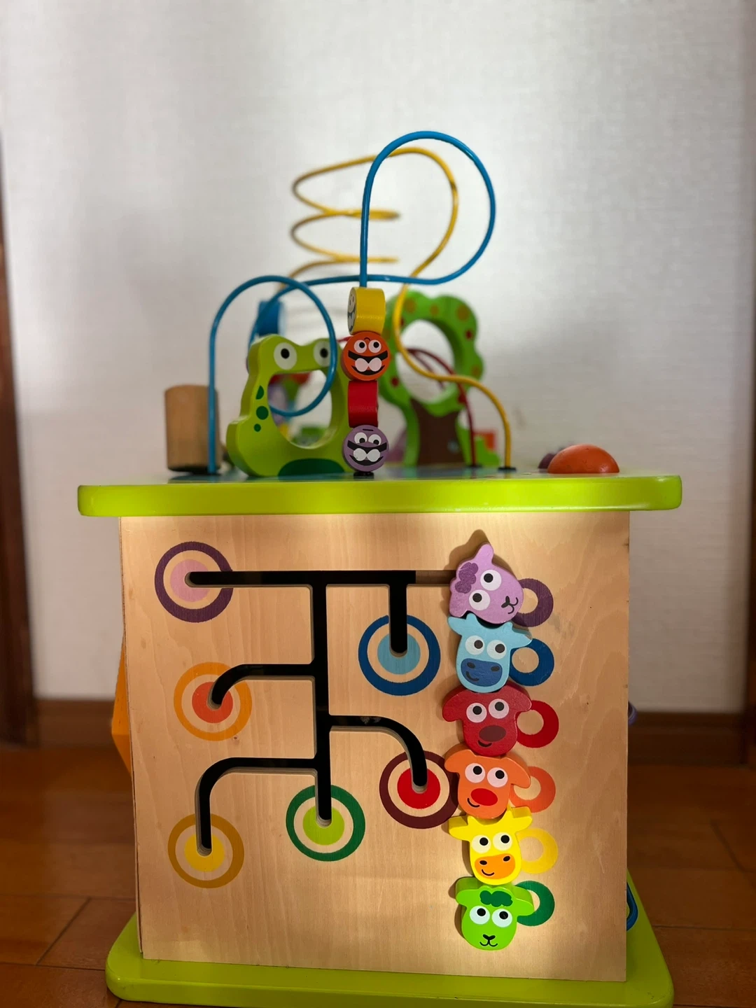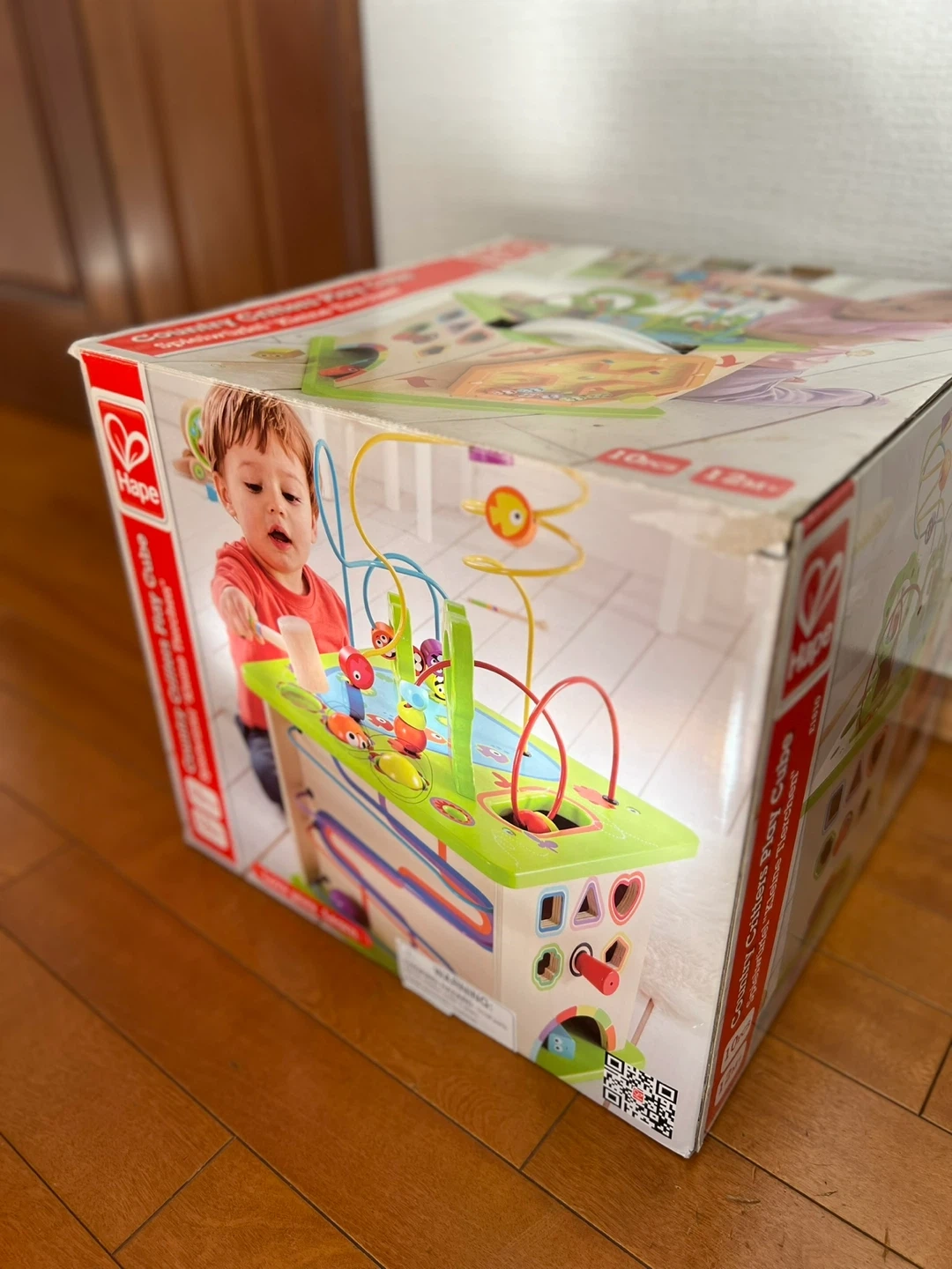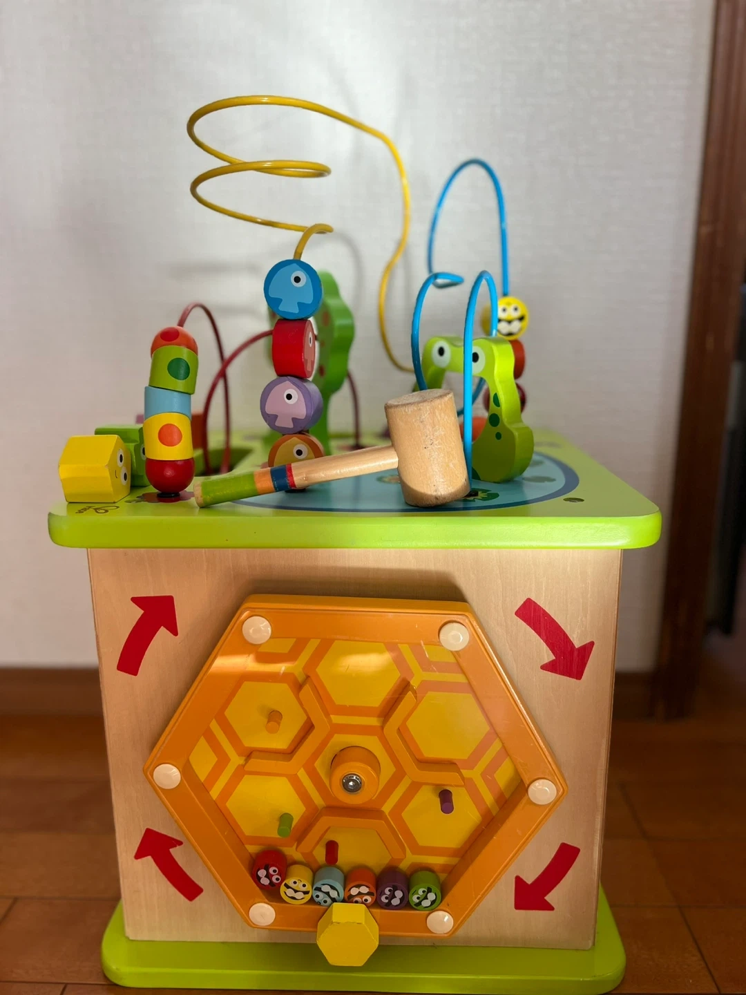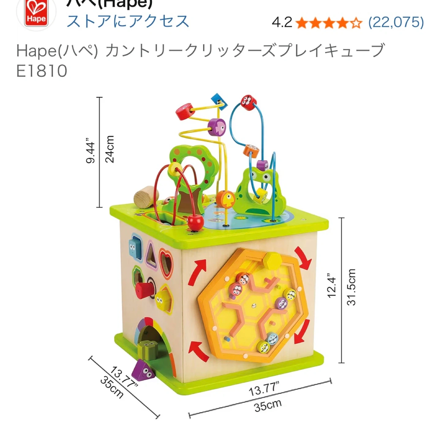 ドイツの老舗玩具Hape(ハペ)のプレイキューブ 迷路、形あわせ、とんかち遊び、ボールころがし、ビーズコースターなどいろいろな遊びが集まったカラフルな5面アクティビティ知育玩具です。 水性塗料を塗った丈夫なつくりは、何年にもわたって、楽しいアクティビティを提供します。 世界の安全基準を満たした高品質でシンプルで飽きのこないデザインが特長です 【商品説明】 ・対象年齢 :12月以上 ・世界60か国以上で愛される知育玩具、ハペのおもちゃ ・対象性別 :男女共用 ・電池:不要 ・本体サイズ :49.7×35×35cm 使用感、小傷等あり。 付属のハンマーやボール、形合わせのピースなどにはげや傷、汚れがあります。 ※写真をご参照ください。 ※青色のボールが欠品しています。 ※破損などないのでまだまだ遊んでいただけるものになっていますが、子供が遊んだものになるので使用感はあります。幼児の使用した玩具にご理解頂ける方のみのご購入をお願い致します。 説明書なし、専用の外箱がありますのでそちらで発送致します。上部を外し、裏返した状態で発送します。 使用の際は表に返して六角レンチで4箇所を取り付けたらすぐに遊べます。 備品はプチプチの袋に入れて本体内に収納。 本体は大きめのプチプチを敷き詰めて発送します。 清掃、梱包してからの出品ですので、画像追加はできません。 新品のネット価格は28,000〜です。 【購入の前に下記ご了承ください】 ・素人の自宅保管品です ・子供が使用したのものですのでご理解のある方の購入をお願いいたします。