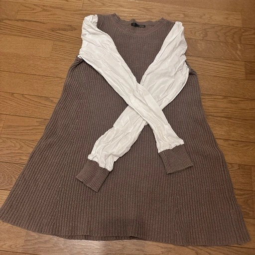 heatherリブ編みブラウン長袖ドッキングニットミニワンピース