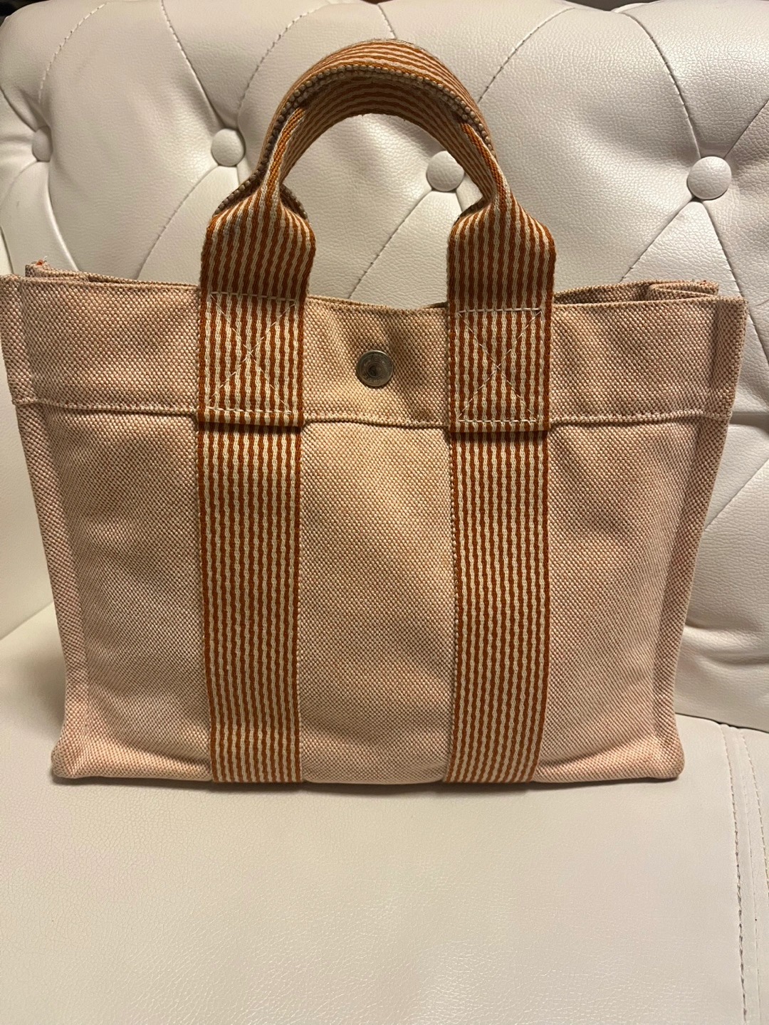 HERMES エルメス フルートゥ ハンドバッグ オレンジ ・サイズ約 タテ21cm ヨコ29cmマチ8cmハンドル22.5cm 国内正規店購入。ワンシーズン数ヶ月使用後、長期保管期間があります。使用に伴う多少の擦れ、汚れ、一部2ミリ程度のシミあり(画像参照)はございますが、目立った傷やダメージはなく、まだまだご使用頂けます。あくまでも中古品になりますので、ご理解頂ける方のみよろしくお願いします。