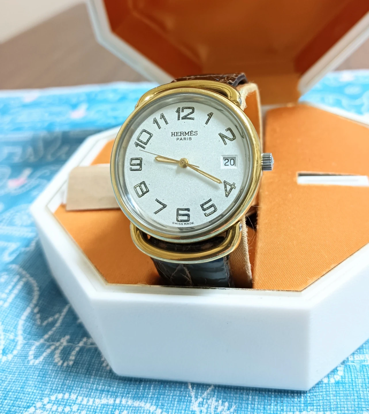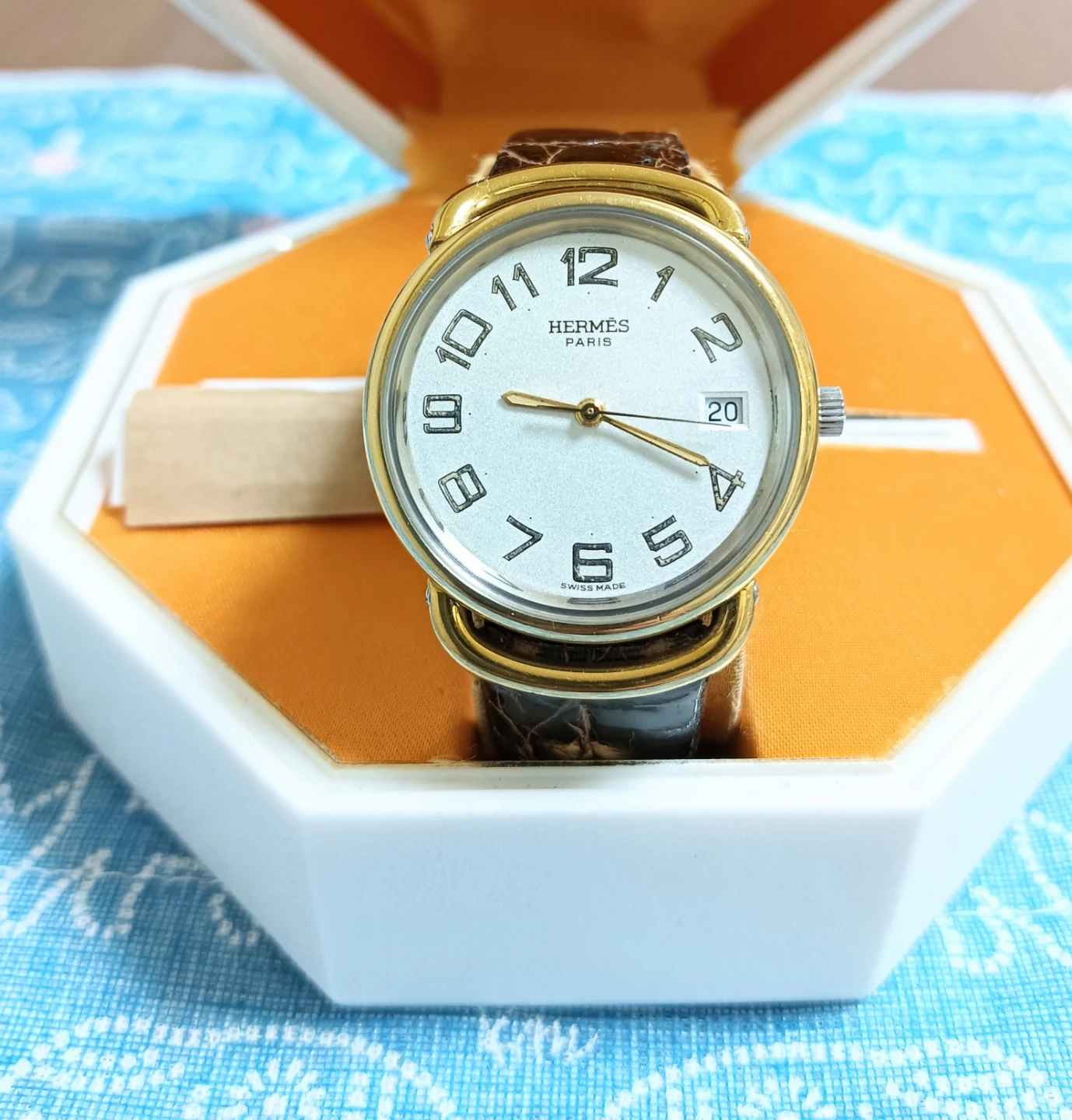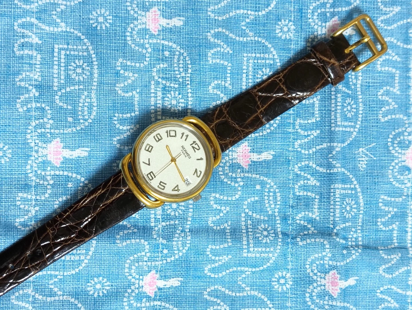★★ 他にHERMESクリッパーも出品。 HERMES エルメス プルマン 腕時計。 純正尾錠に社外ストラップ ★★ 写真の通り時計本体は綺麗めですが、社外ストラップがノリ剥がれ有りますのでベルト交換推奨となります。 当方でベルト交換してから出品も考えてますので、その場合は別途4000円アップとなります。 ★★ 腕周り 約15㎝ 余りコマは有りません。 color シルバー&シャンパンピンク こちらは現物のみとなりますが ★★