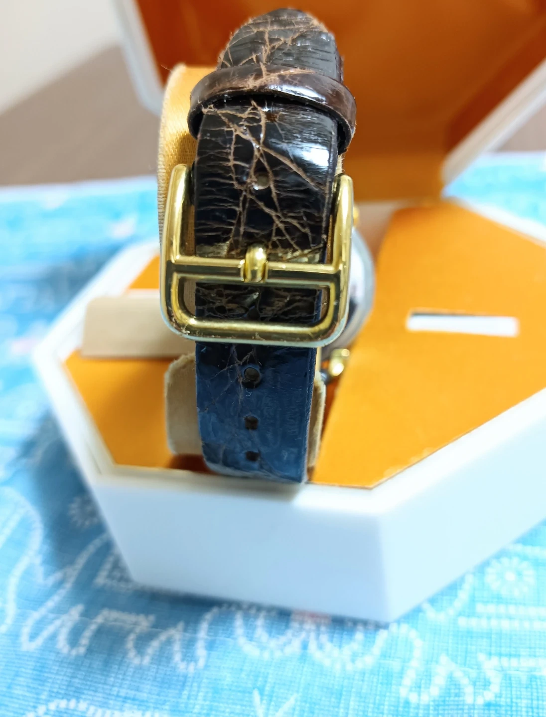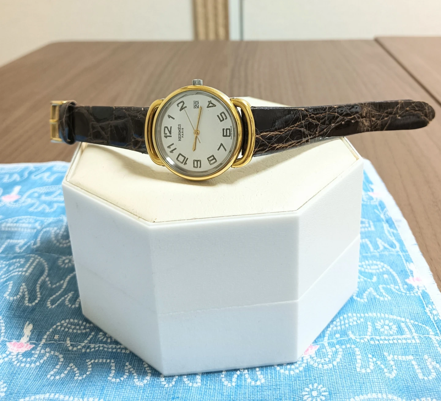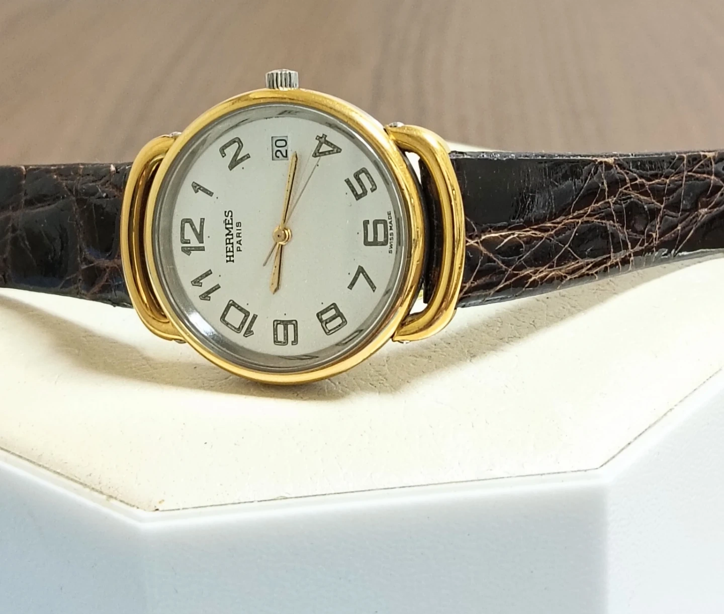 ★★ 他にHERMESクリッパーも出品。 HERMES エルメス プルマン 腕時計。 純正尾錠に社外ストラップ ★★ 写真の通り時計本体は綺麗めですが、社外ストラップがノリ剥がれ有りますのでベルト交換推奨となります。 当方でベルト交換してから出品も考えてますので、その場合は別途4000円アップとなります。 ★★ 腕周り 約15㎝ 余りコマは有りません。 color シルバー&シャンパンピンク こちらは現物のみとなりますが ★★