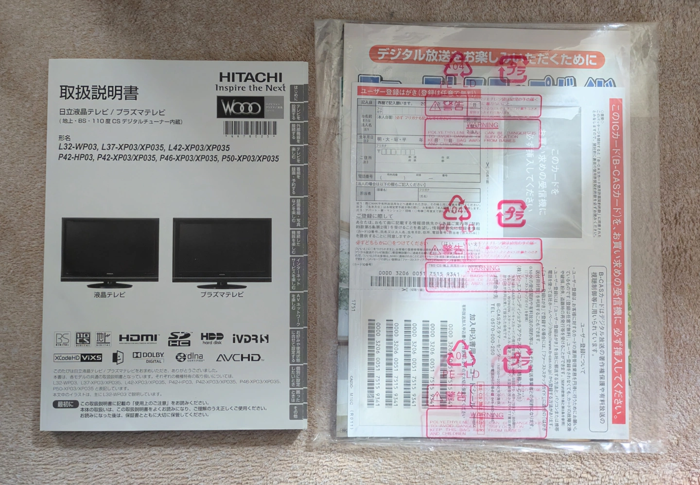 【情報】 ブランド:HITACHI (WOOO) 型番:P46-XP03 種類:プラズマテレビ サイズ:46インチ 【付属品】 リモコン×2、取扱説明書 録画機能付きでとても便利です♪ 2009年11月に購入しましたが、まだまだ使えそうです。 リモコンは正規品が反応しなくなった為、代用リモコンを使用していましたが問題なく使用できます。 指定住所(最寄駅は青砥)まで取りに来られる方でお願いします。2階(外階段)かつ重たいので2人組で、できれば台車等があった方がいいかと思います。