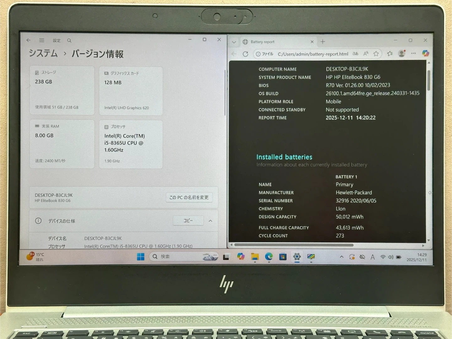 HP EliteBook 830 G6 ノートパソコンです。 【情報】 ブランド:HP(エイチピー) モデル:EliteBook 830 G6 CPU:Core i5 8365U RAM:8GB SSD:256GB OS: Windows 11 画面サイズ:13型 (1920x1080) 【状態】 ランク:B 使用感あり 画面に小さな傷あり 【付属品】 なし 中古品であることをご了承ください。