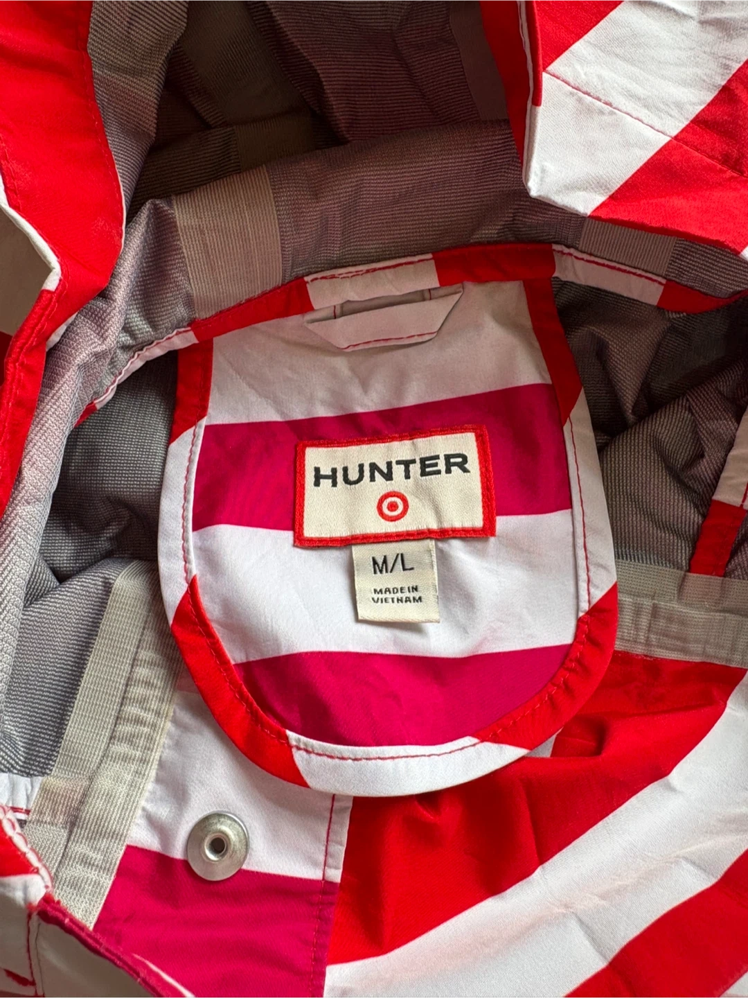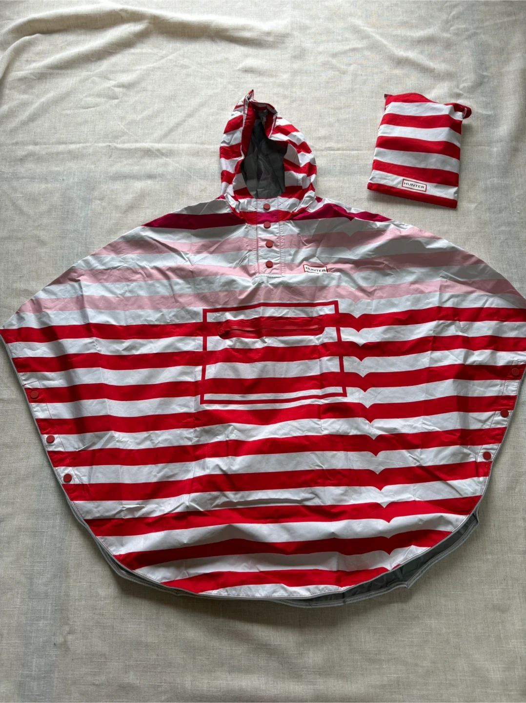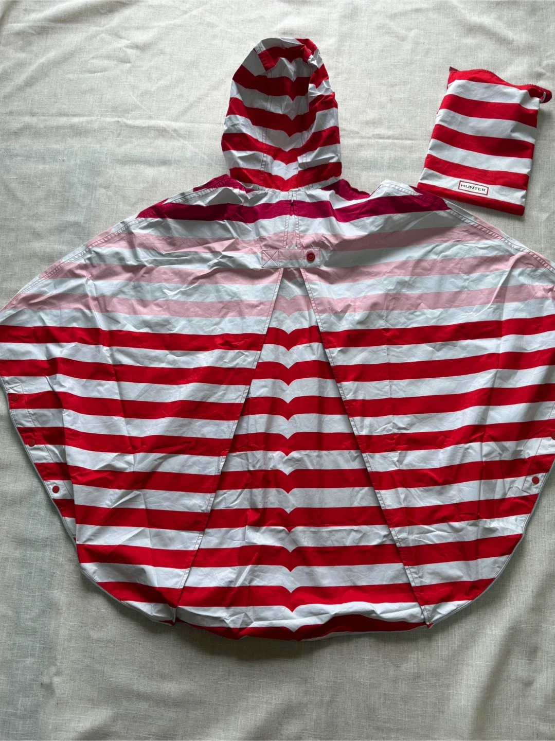 ハンターとTARGET コラボのポンチョです TARGET はアメリカの大手スーパーマーケット🇺🇸日本未発売 ・ブランド:ハンター ・サイズ:M/L ・色:赤、白のストライプ ・付属品:収納袋 ・使用感:収納袋に少し汚れあり(写真) たっぷりサイズで着るなら小学校中学年くらいかなと思いますが、お子様のサイズもあると思いますのでお気軽にお問い合わせください。 中古品であることご了承ください