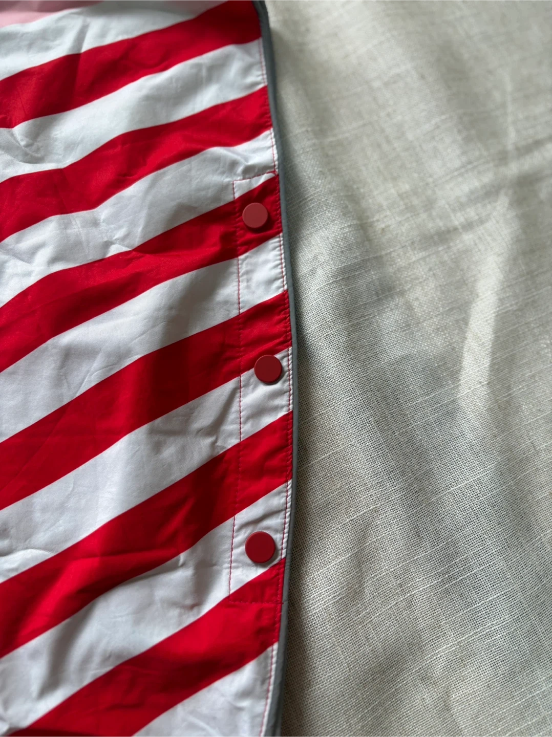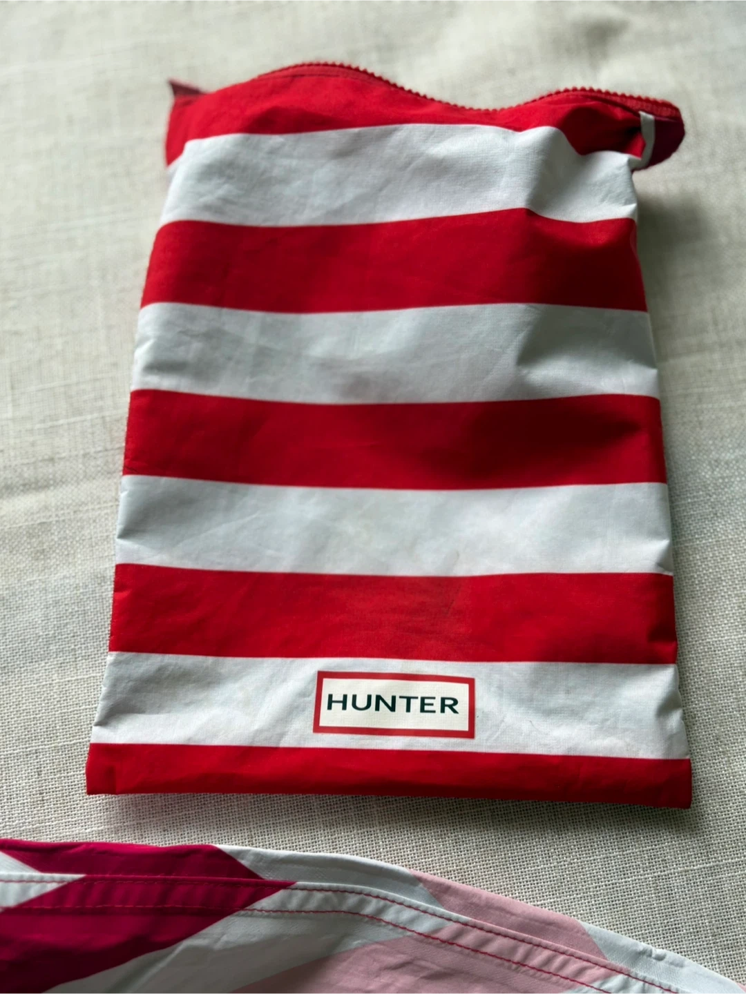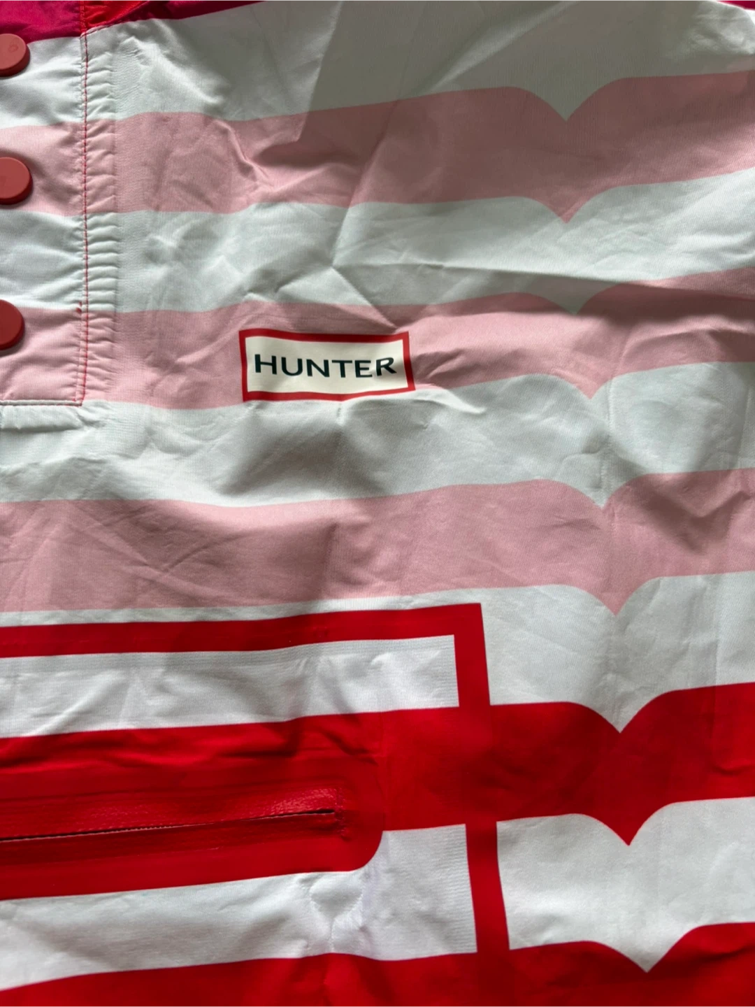ハンターとTARGET コラボのポンチョです TARGET はアメリカの大手スーパーマーケット🇺🇸日本未発売 ・ブランド:ハンター ・サイズ:M/L ・色:赤、白のストライプ ・付属品:収納袋 ・使用感:収納袋に少し汚れあり(写真) たっぷりサイズで着るなら小学校中学年くらいかなと思いますが、お子様のサイズもあると思いますのでお気軽にお問い合わせください。 中古品であることご了承ください