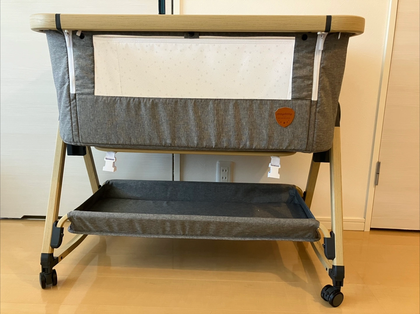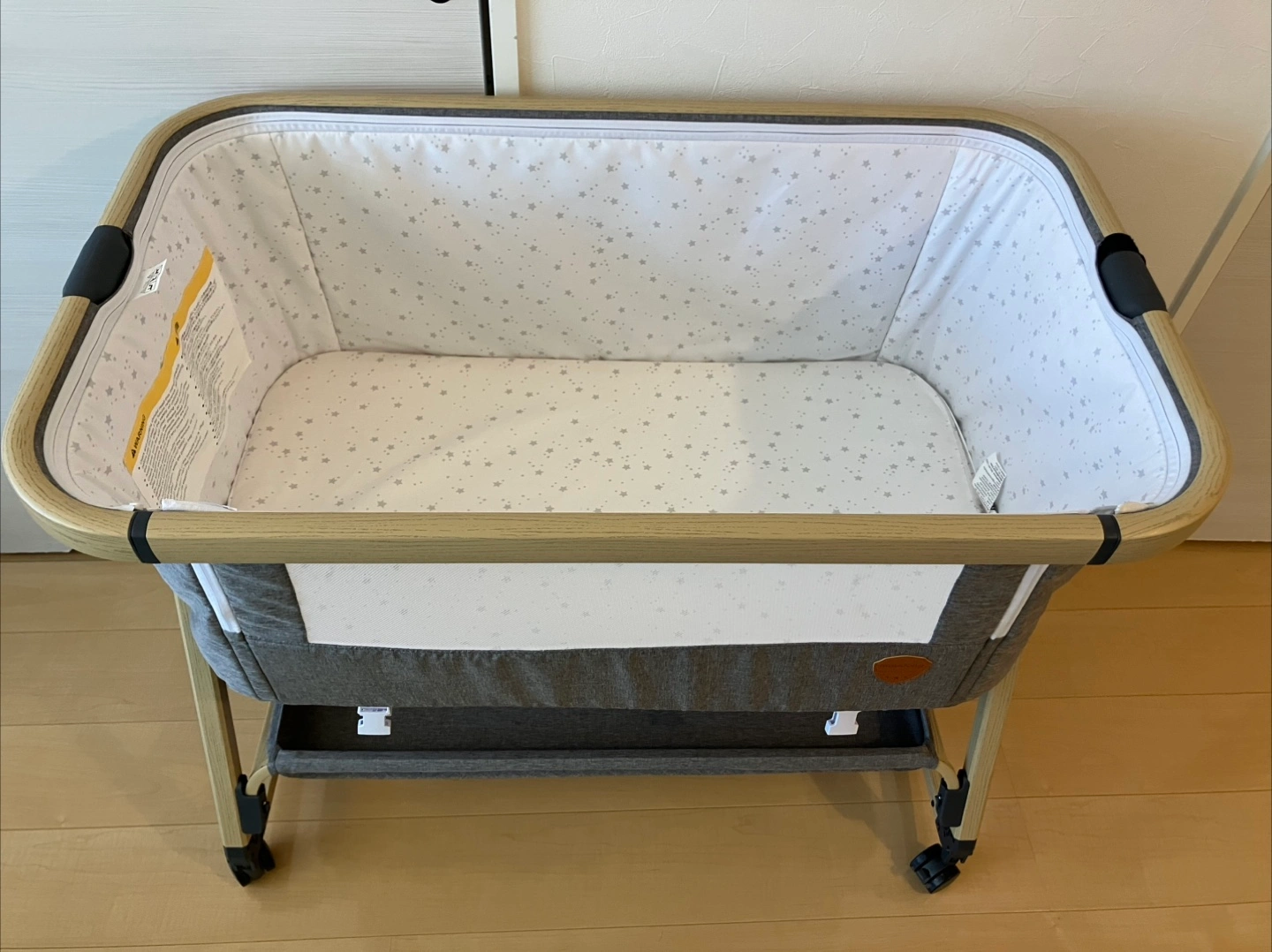 キャスター付きで、簡単に部屋を移動させることができます。そのため、昼間はリビングで家事をしながら、夜は寝室で一緒に眠ることができ、非常に便利でした! マットレスはやや薄い&硬めの印象です。私はそのまま使いましたが気になる人は別途マットレスを購入したほうがいいかもしれません。 以下の方におすすめします。 ・狭い場所でベビーベッドを使いたい ・部屋間を移動させたい ・ ペットを飼っている ・ 大人用ベッドの横で添い寝したい ・長く使えなくても問題ない →寝返りがはじまり少し危ないかなと思ったため使用をやめました。 ベッド下の収納も非常に便利で、オムツやよだれ拭き、スタイ、ベビーローションなどのお世話セットを置いてました。 蚊帳もありますが、あまり使いませんでした。 全体的に綺麗かと思いますが、中古品であるということをご了承の上、ご購入ください。 ご不明点等ございましたらご連絡ください。