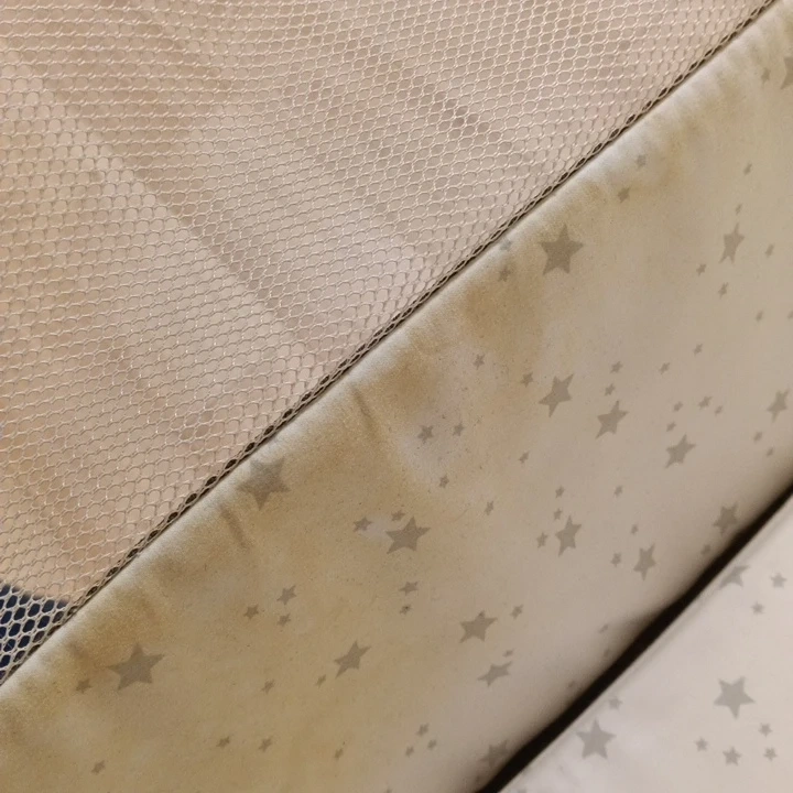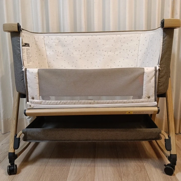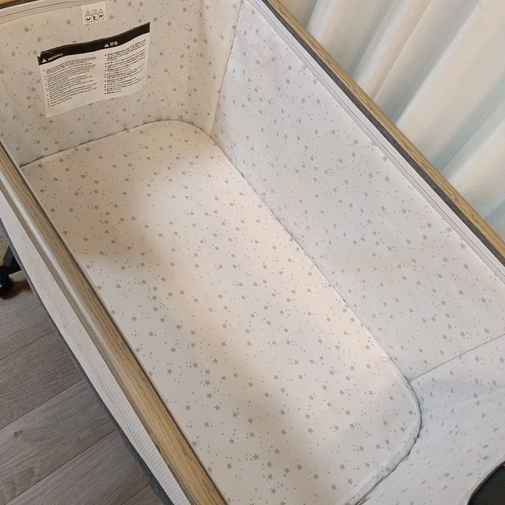HZDMLのベビーベッドです。 折りたたみのできる移動式ベビーベッドです。 里帰りや旅行などにも持ち運び可能。 小さなお兄ちゃんお姉ちゃんのいるおうちに赤ちゃんが生まれると踏まれないか、イタズラされないか…と心配になりますよね。 これからの時期は床にそのまま寝かせておくのも寒かったり、せっかく寝た子をまた持ち上げて移動するのも一苦労。 料理中などキッチンの側へ持って来たり、タイヤをたためば寝るまでゆらゆらとゆりかごのようにも使えます。 サイドがファスナーで開くので腰も痛くなりづらくお世話もしやすいです。 高さも変えられるのでミルクを飲んだ後は片側だけ高くしておいたりもしました。 脚元のカバーが一部欠けていますが使用には問題ありません。 内側の布地が変色しています。 布団やバスタオルを敷いて使用していました。 説明書はありません。 部屋の中での使用ですがタイヤに汚れがあります。 ・ブランド:HZDML ・色:グレー、木目調 ・ベビーベッド ・収納トレイ付き ・キャスター付き 中古品であることをご了承ください。