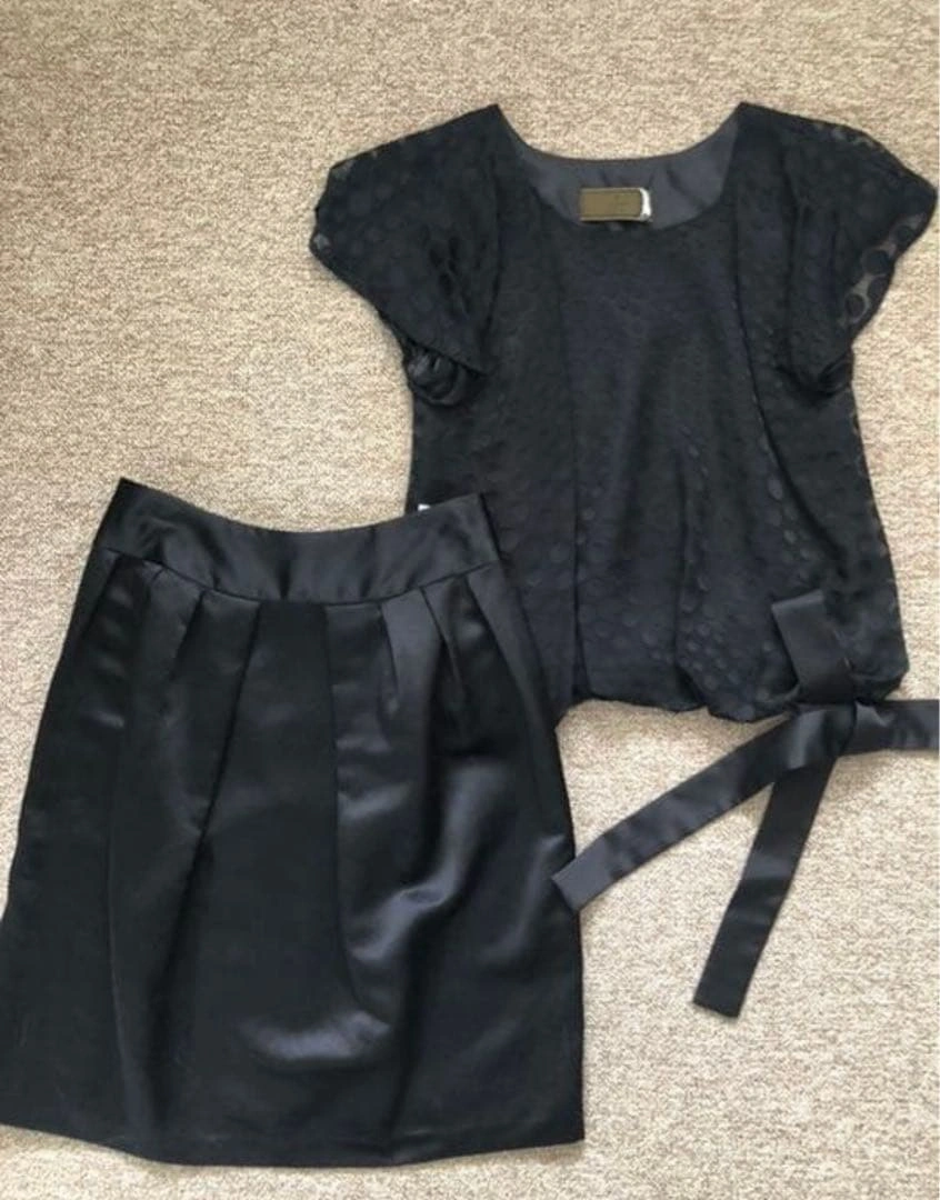 サイズ9号、お色はブラックです。 上着はレーヨン素材に水玉のレースを重ねたデザイン、スカートはキュプラ素材で光沢があります。 試着以外着る機会がなかったので出品します。 前の方は結婚式で二回着用されたそうです。 上着着丈(後ろ首中心部から計測)約44cm、スカートは平置き丈約54cm、ウエスト約33cmです。(身長162cmの着用で膝上でした) バルーン型なのでお尻周りはゆったりしています。 注)ウエスト部分はゴムではありません! 自宅にて吊るし保管しておりました。 ご希望の方はお気軽にご連絡ください。