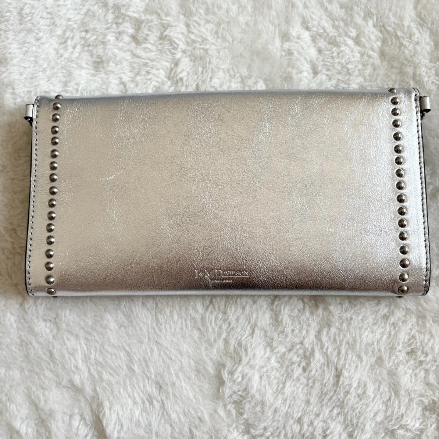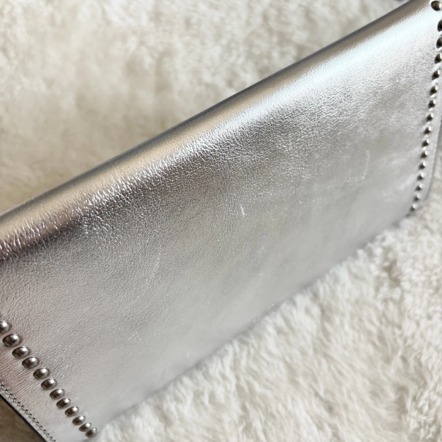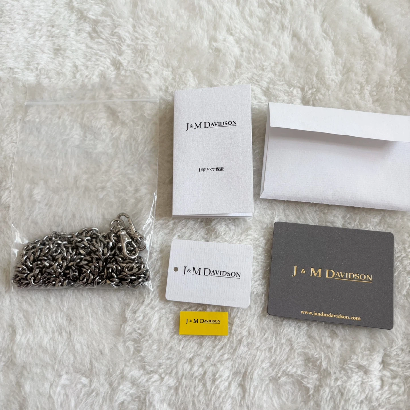 【商品詳細】 カラー:シルバー ブランド:J&M Davidson ジェイアンドエムデヴィッドソン レギュラーライン トラベルポーチ チェーンウォレット タウンユース パーティーシーン ポーチバッグ ウィズ スタッズ 【仕様・サイズ】 ショルダーチェーン取り外し可能 スナップボタン開閉式 ×2 マチ付きメインコンパートメント ×1 フリーポケット ×2 カードポケット ×6 W23.0×H12.5×D1.5cm 【素材】 カーフスキンレザー メタル 【付属品】 シルバーショルダーチェーン 保存箱 ※汚れあります 保証書 ※使用不可です 【状態】 ・全体的に引っ掻き傷があります。 ・箱は汚れや変色あり ・スナップボタン良好 【商品について】 ●写真の撮影環境やお使いの端末によって、現物と色味が異なる場合がございます。 ●あくまでも一度人の手に渡った品であること、素人検品であることをご理解ください。 ●畳しわはご了承くださいませ。 その他、気になる点はお気軽にコメントください! カラー...シルバー 素材...本革 付属品...ショルダーストラップ、箱、保証書