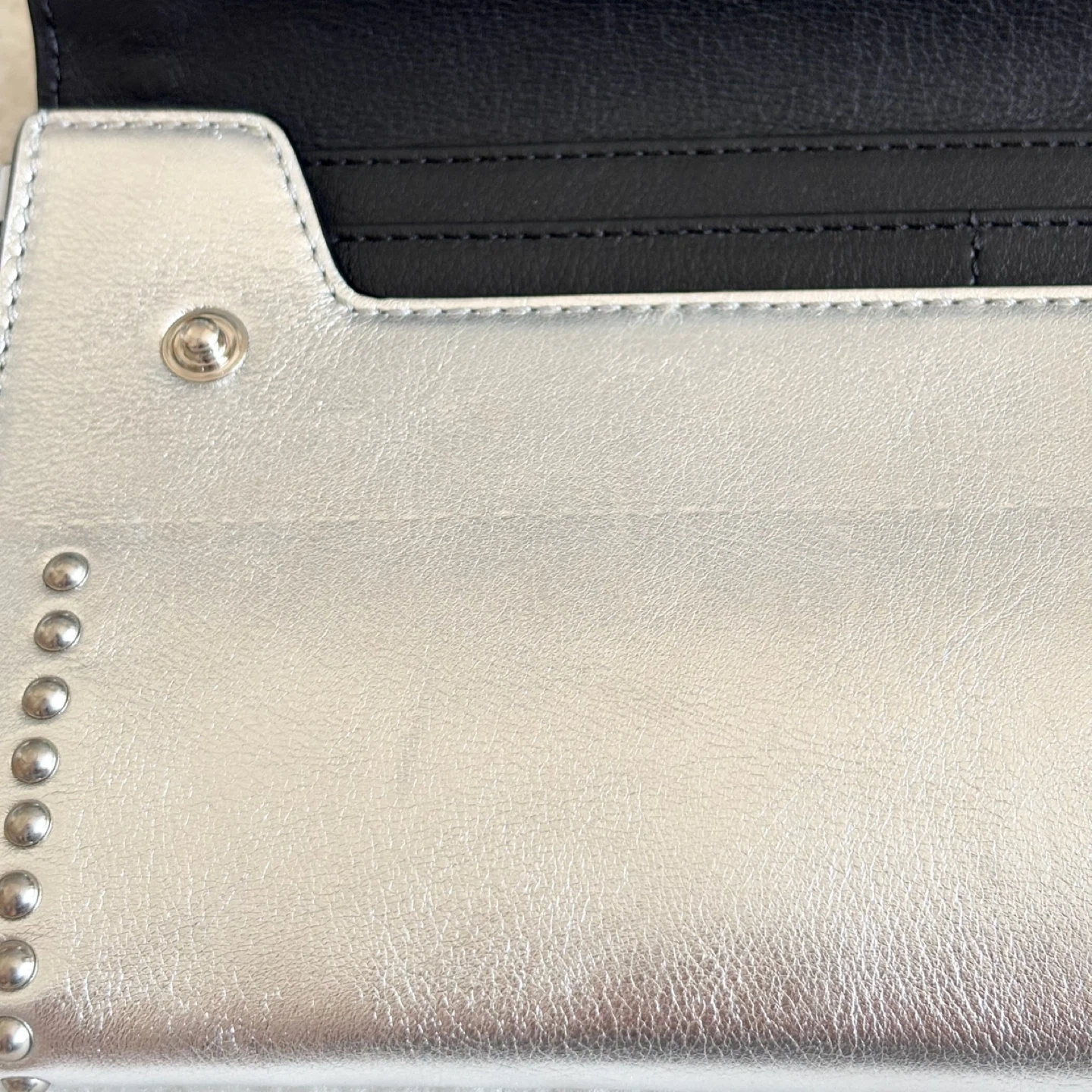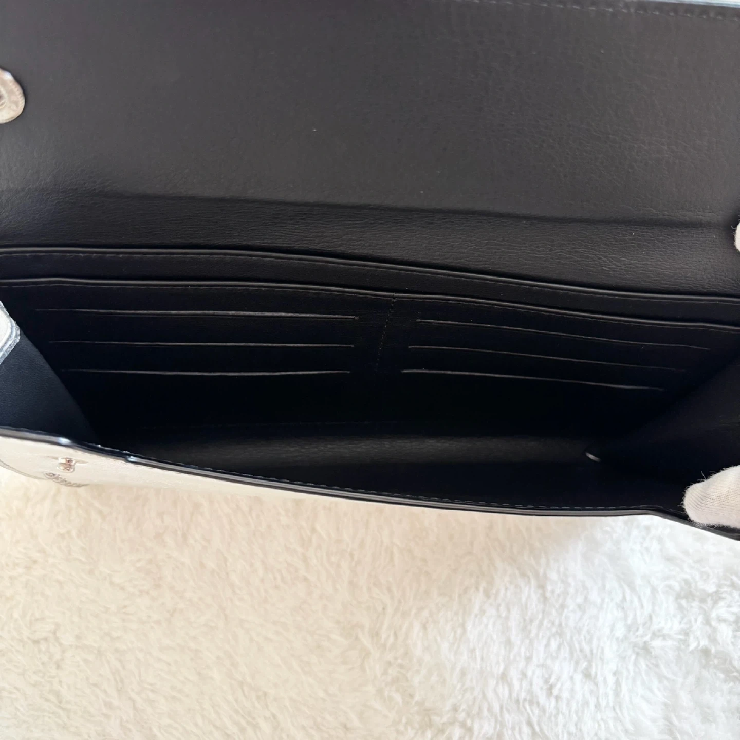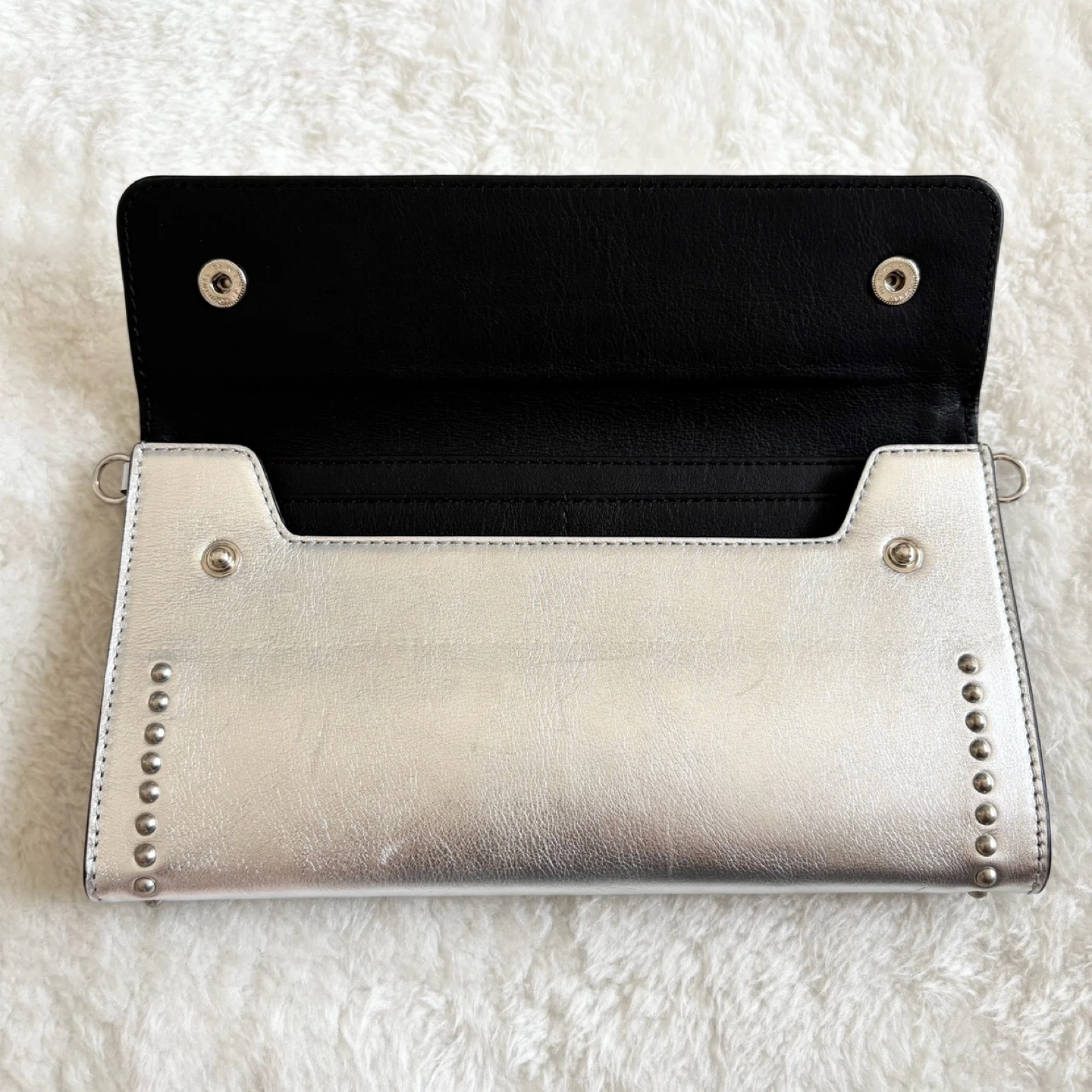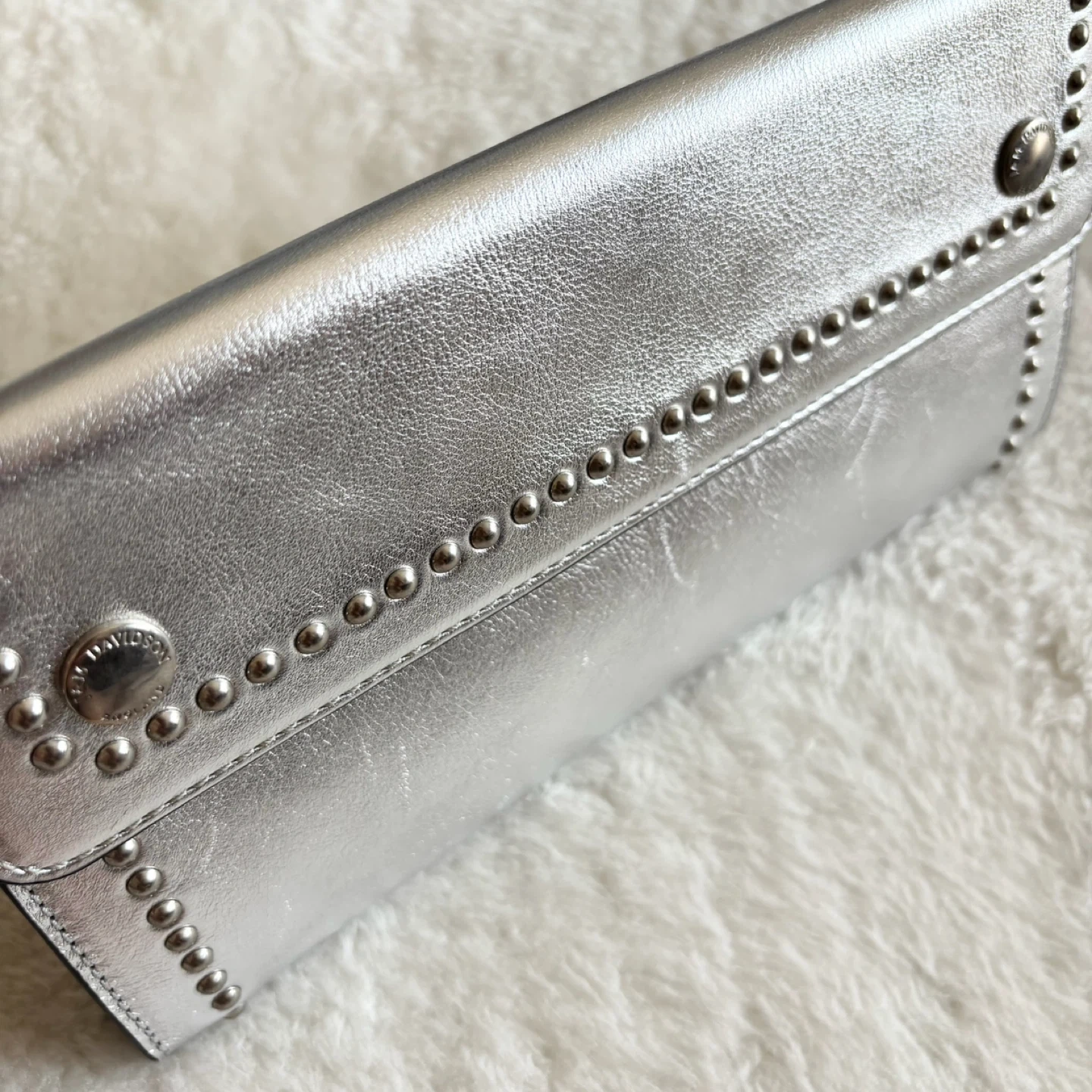 【商品詳細】 カラー:シルバー ブランド:J&M Davidson ジェイアンドエムデヴィッドソン レギュラーライン トラベルポーチ チェーンウォレット タウンユース パーティーシーン ポーチバッグ ウィズ スタッズ 【仕様・サイズ】 ショルダーチェーン取り外し可能 スナップボタン開閉式 ×2 マチ付きメインコンパートメント ×1 フリーポケット ×2 カードポケット ×6 W23.0×H12.5×D1.5cm 【素材】 カーフスキンレザー メタル 【付属品】 シルバーショルダーチェーン 保存箱 ※汚れあります 保証書 ※使用不可です 【状態】 ・全体的に引っ掻き傷があります。 ・箱は汚れや変色あり ・スナップボタン良好 【商品について】 ●写真の撮影環境やお使いの端末によって、現物と色味が異なる場合がございます。 ●あくまでも一度人の手に渡った品であること、素人検品であることをご理解ください。 ●畳しわはご了承くださいませ。 その他、気になる点はお気軽にコメントください! カラー...シルバー 素材...本革 付属品...ショルダーストラップ、箱、保証書