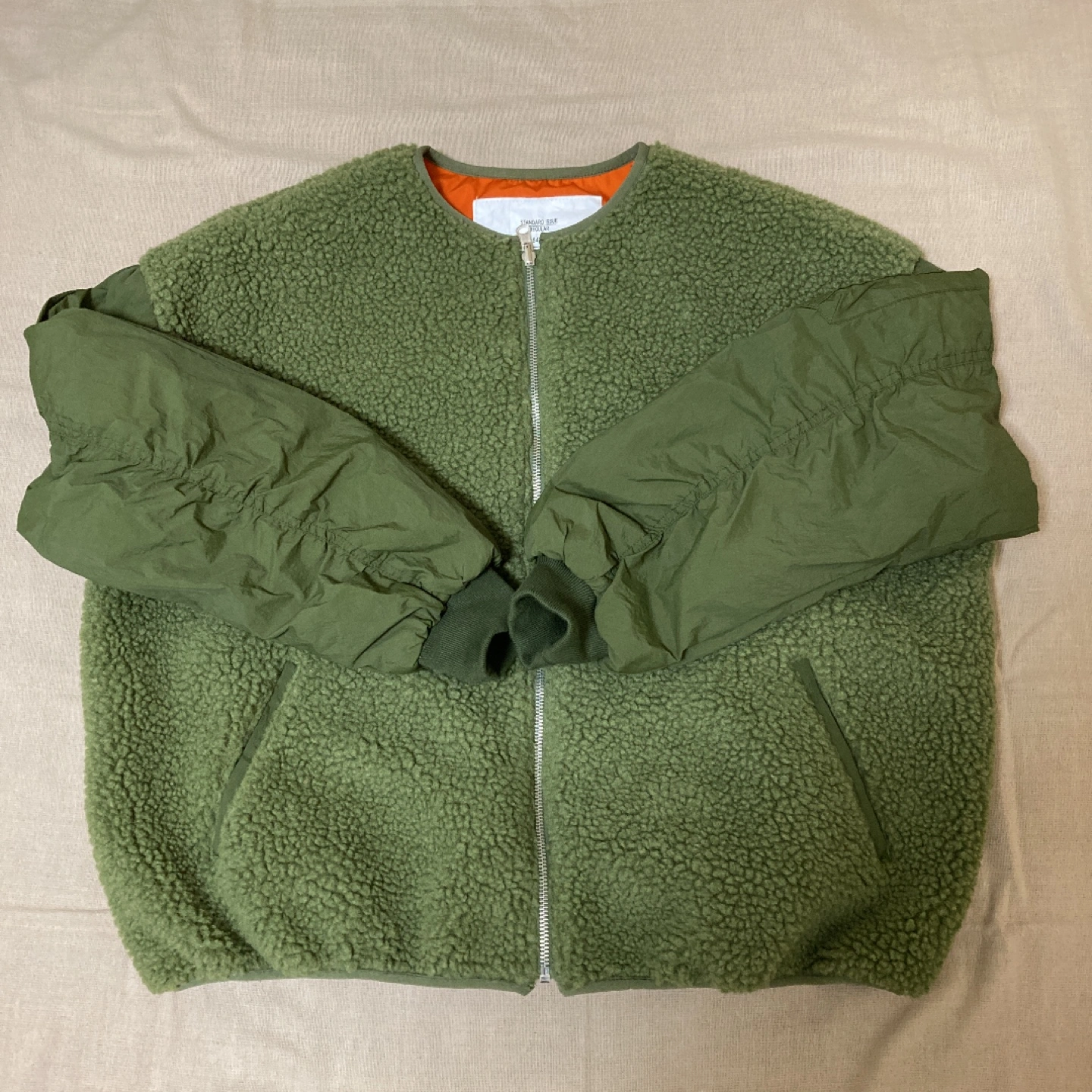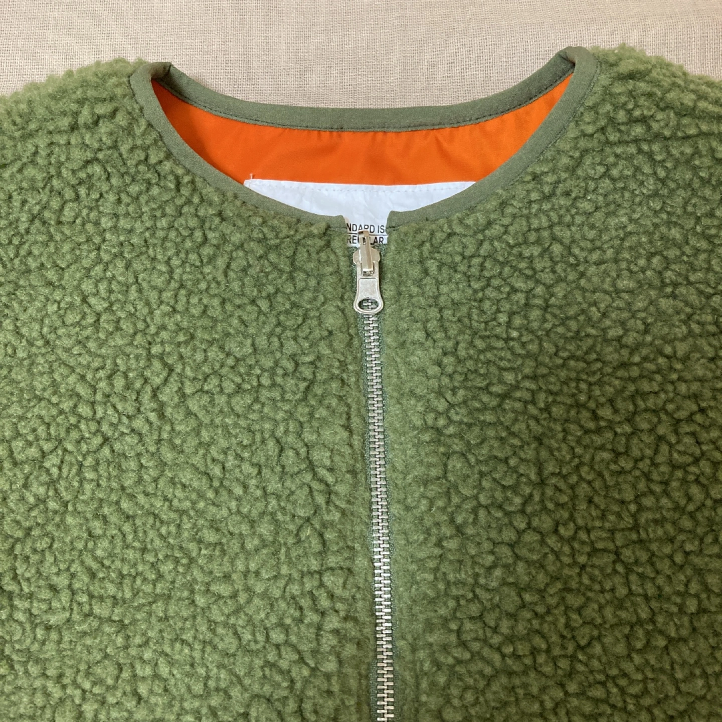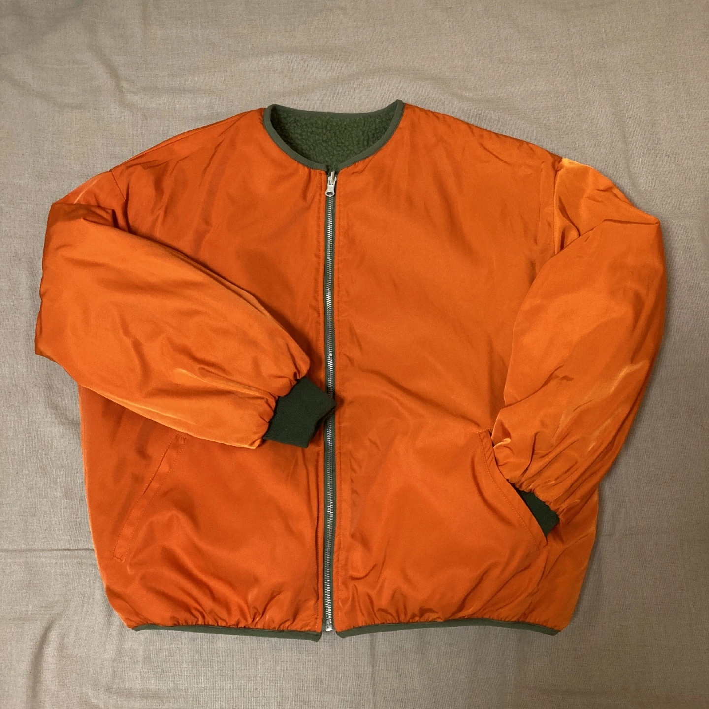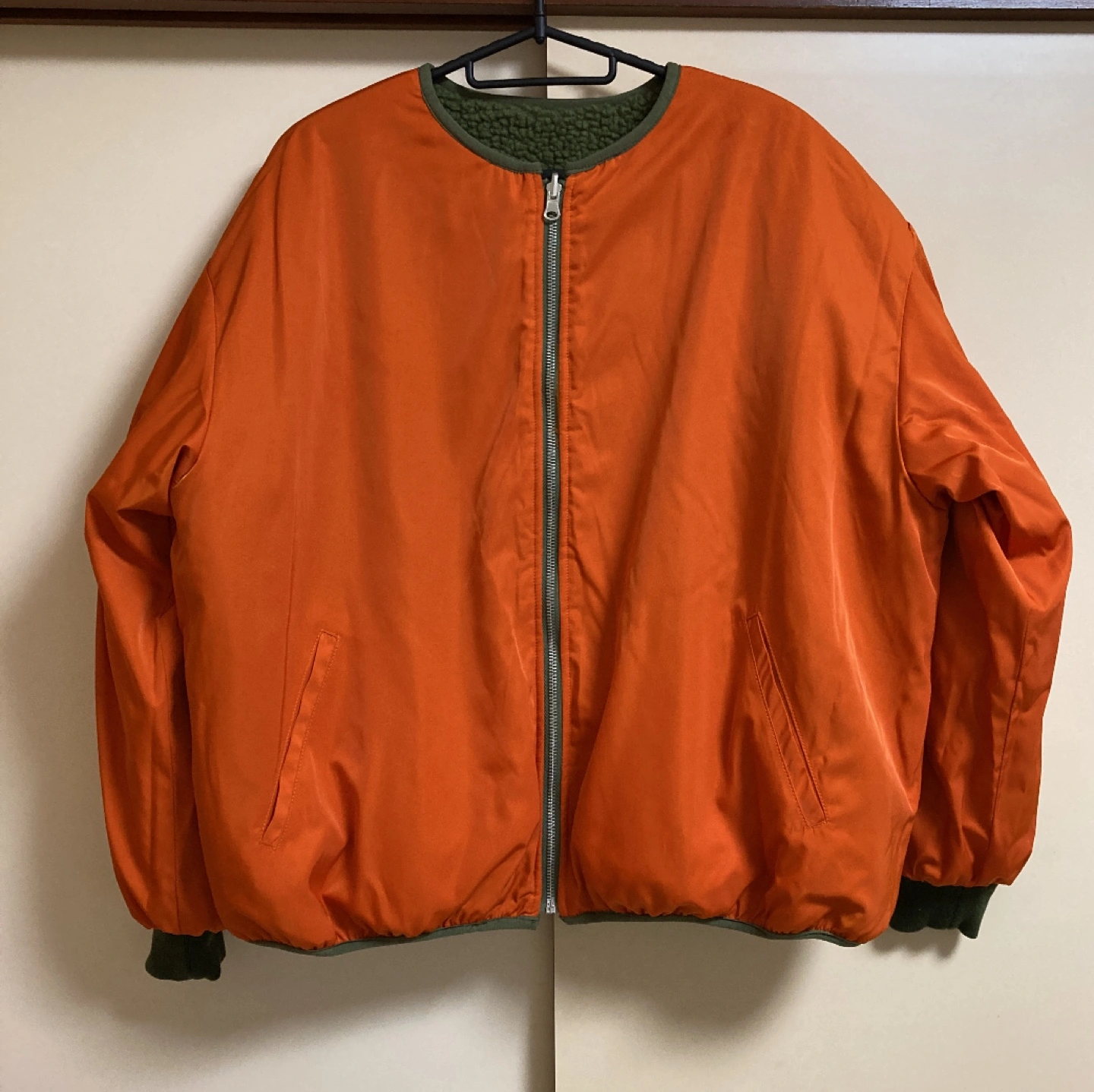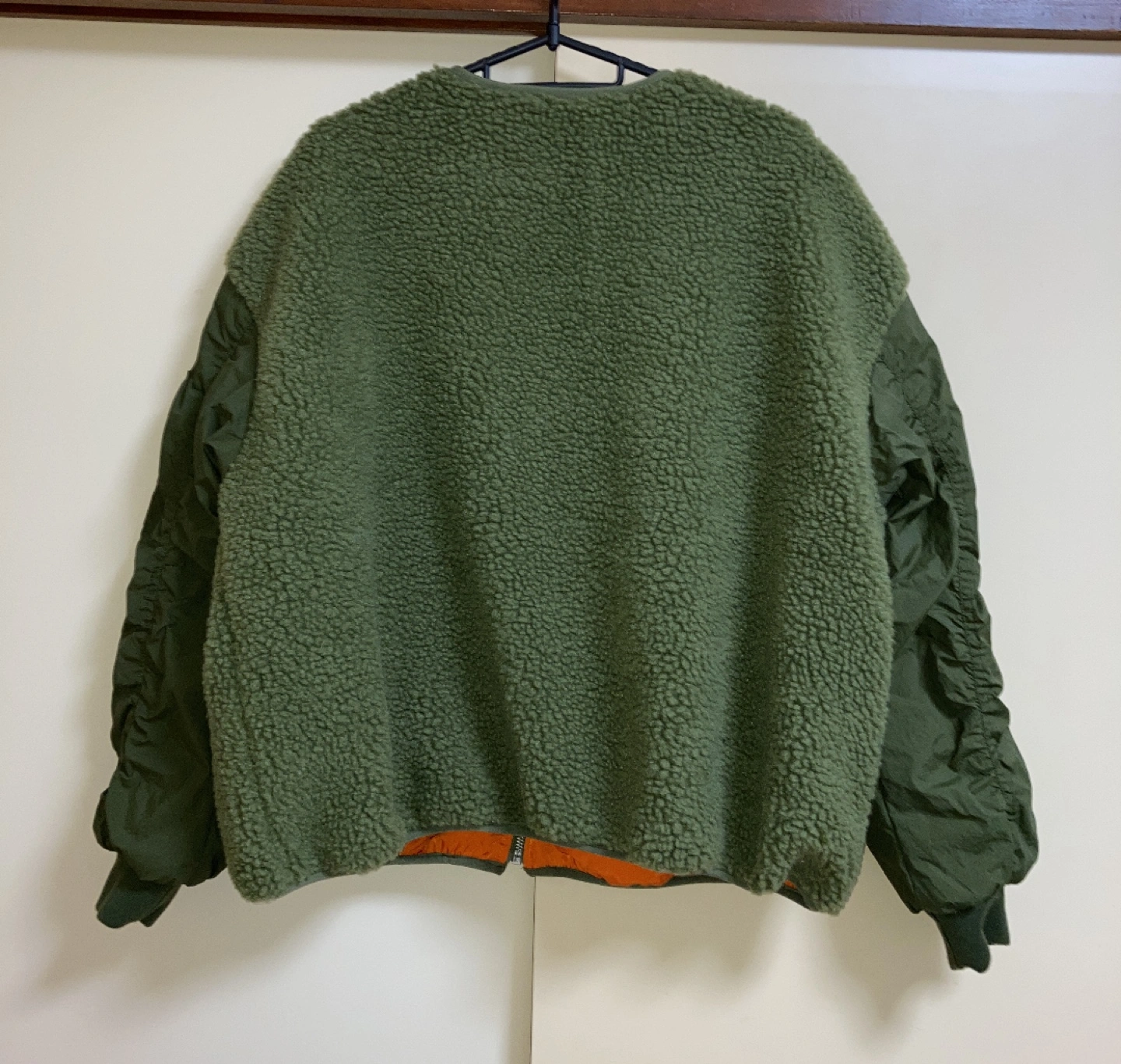カーキ色のボア×オレンジ色のノーカラーリバーシブルブルゾンです。 ボアは7枚目に近い色味で、袖はもう少し濃いめの色味です。 オレンジは8枚目に近い色味です。 オレンジ色の方を内側で着ていたので、擦れてできたものなのか、シミみたいな濃くなっている部分あり(10枚目) 他の場所にもじっくり探すと10枚目程の大きさではないですが何ヶ所かあり。 2回着用。 ★表地 基布 ポリエステル 100% パイル ポリエステル 100% 裏地 袖部分 ナイロン 100% 中わた ポリエステル 100% リブ部分 ポリエステル 100% ★Mサイズ ★身幅 69 身丈 61.5 ※画像の商品は光の照射や角度、お使いのモニター環境により、実物と色味が異なる場合がございます