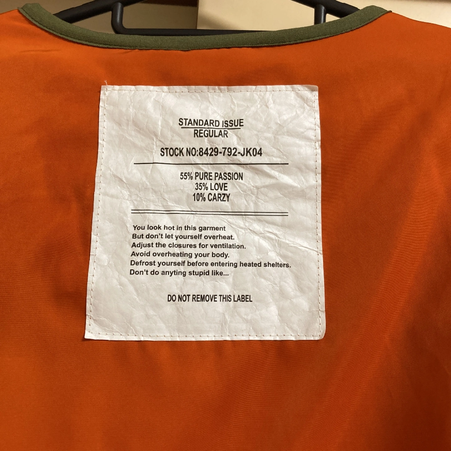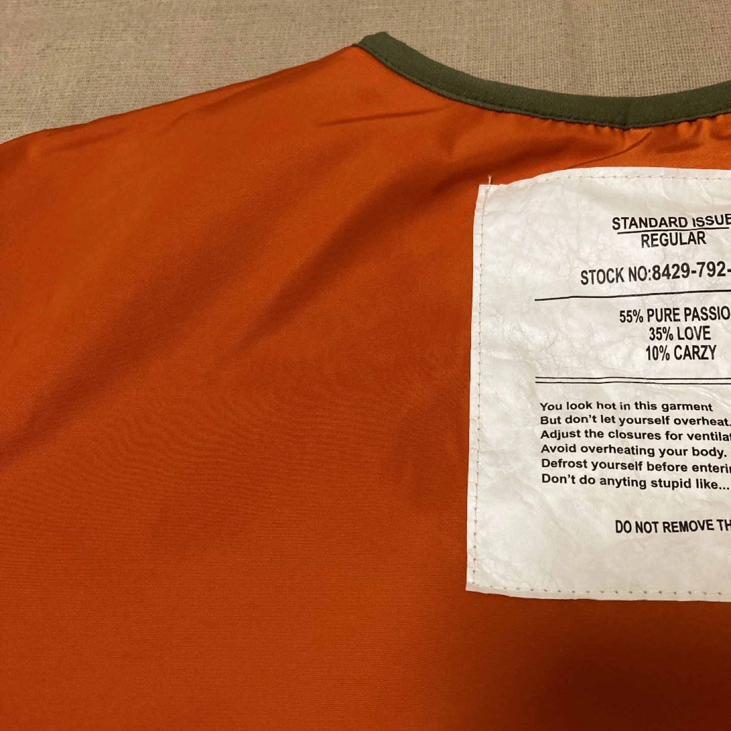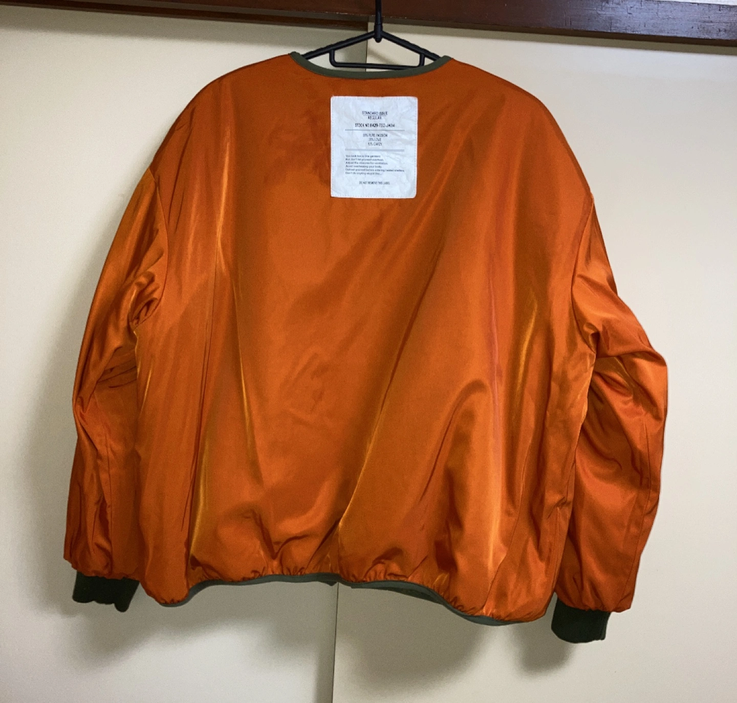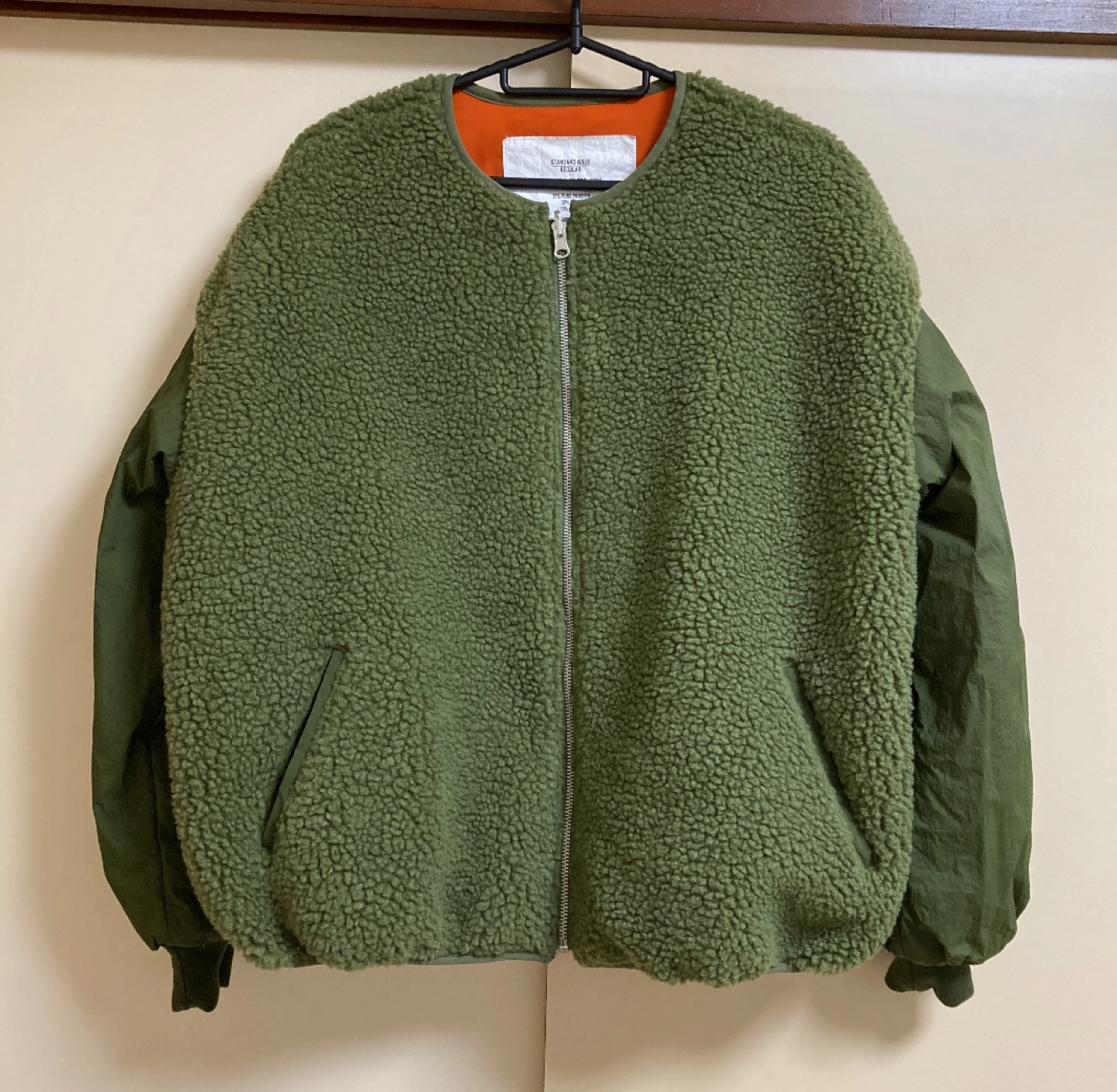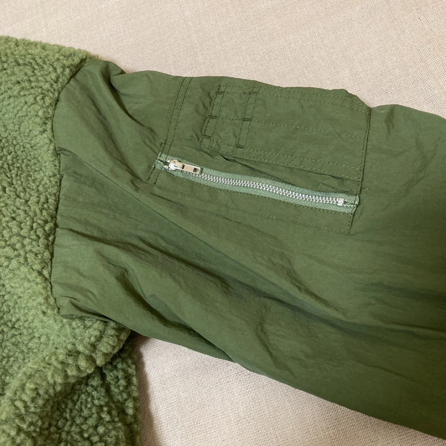 カーキ色のボア×オレンジ色のノーカラーリバーシブルブルゾンです。 ボアは7枚目に近い色味で、袖はもう少し濃いめの色味です。 オレンジは8枚目に近い色味です。 オレンジ色の方を内側で着ていたので、擦れてできたものなのか、シミみたいな濃くなっている部分あり(10枚目) 他の場所にもじっくり探すと10枚目程の大きさではないですが何ヶ所かあり。 2回着用。 ★表地 基布 ポリエステル 100% パイル ポリエステル 100% 裏地 袖部分 ナイロン 100% 中わた ポリエステル 100% リブ部分 ポリエステル 100% ★Mサイズ ★身幅 69 身丈 61.5 ※画像の商品は光の照射や角度、お使いのモニター環境により、実物と色味が異なる場合がございます