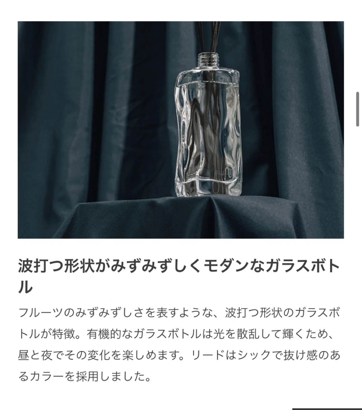 ご覧頂きましてありがとうございます。 商品は新品未使用品となっております。 撮影のために開封しております。 画像をご確認下さい。 画像が全てとなっております。 複数個ご購入も可能です。 EC:エンチャンティングカシス 熟したカシスの甘酸っぱさに、ベルガモットの深みを添えた華やかな香り。 品番MRU-121 品名 リードディフューザー 内容量 (約) 350ml リード長さ (約) 360mm 主成分 溶剤、香料 セット内容 ボトル(フレグランスオイル入) リードスティック×6 定価3300円 121 カクテルのフルーツをテーマにした気品のあるディフューザー カクテルをイメージさせる4種のフルーツ「カシス」「オレンジ」「ラフランス」「ライム」をモチーフに、甘すぎず深みやビターテイストを加え、ストーリー性のある香りに仕立てたリードディフューザー。ボトルはフルーツのみずみずしさを表現する有機的なフォルムのガラスを採用しました。シンプルでありながら高級感あるシックなデザインは、贈る相手を選ばずギフトにも最適です。 EC:エンチャンティングカシス 熟したカシスの甘酸っぱさに、ベルガモットの深みを添えた華やかな香り。