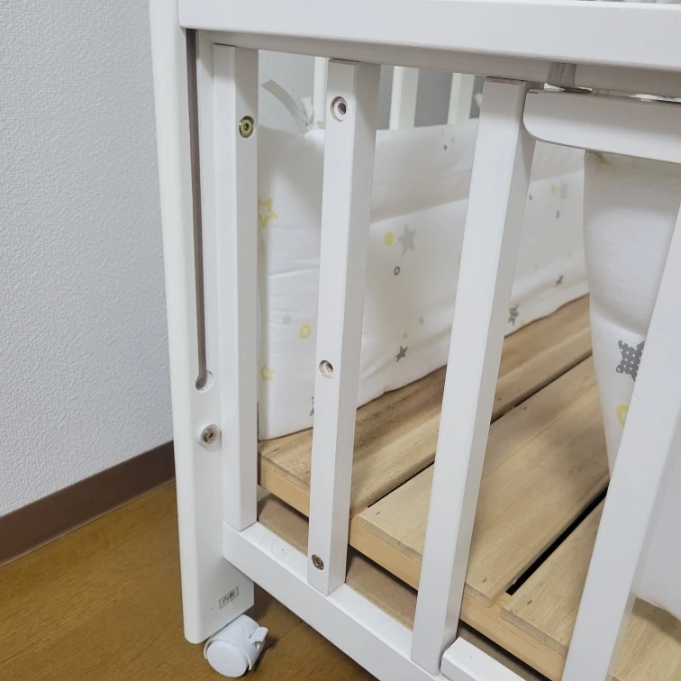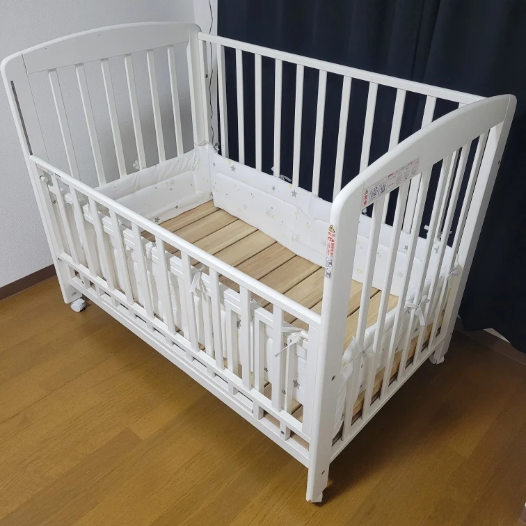 あたたかさKATOJIのレギュラーサイズベビーベッドと、サンデシカの立体ファイバー敷マットのセットです。 新生児期~2歳までお使いいただけます。 KATOJI ベビーベッド 購入価格:24000円 サンデシカ 立体ファイバー敷マット 購入価格:6290円 ベビーベッドは引越しの際に引越し業者に落とされて一部破損してしまいました…(修理済み) 傷も多いため、格安でお譲りします。 立体ファイバー敷マットについては画像5枚目をご確認ください。自宅でホームクリーニングしてお渡しします。 エアウィーヴみたいな感じで通気性抜群です。高反発素材で安心。 1年8ヶ月ほど使用しましたが、使わなくなりましたのでどなたかお譲りします。 高さ3段階調整可能。底面にオムツの予備など置いておけるので便利でした💮 必要かは実際見てもらってでも良いのですが、専用のダブルガーゼフィットシーツ(1990円)と画像に写っている柵のガード?も必要であればおまけでお付けします。 (不要であればお申し付けください) 自宅前(マンション)まで車で取りに来ていただける方宜しくお願いします。 ・3段階高さ調整可 ・キャスター付き ・傷や破損が少しあります ※中古品であることをご了承ください。