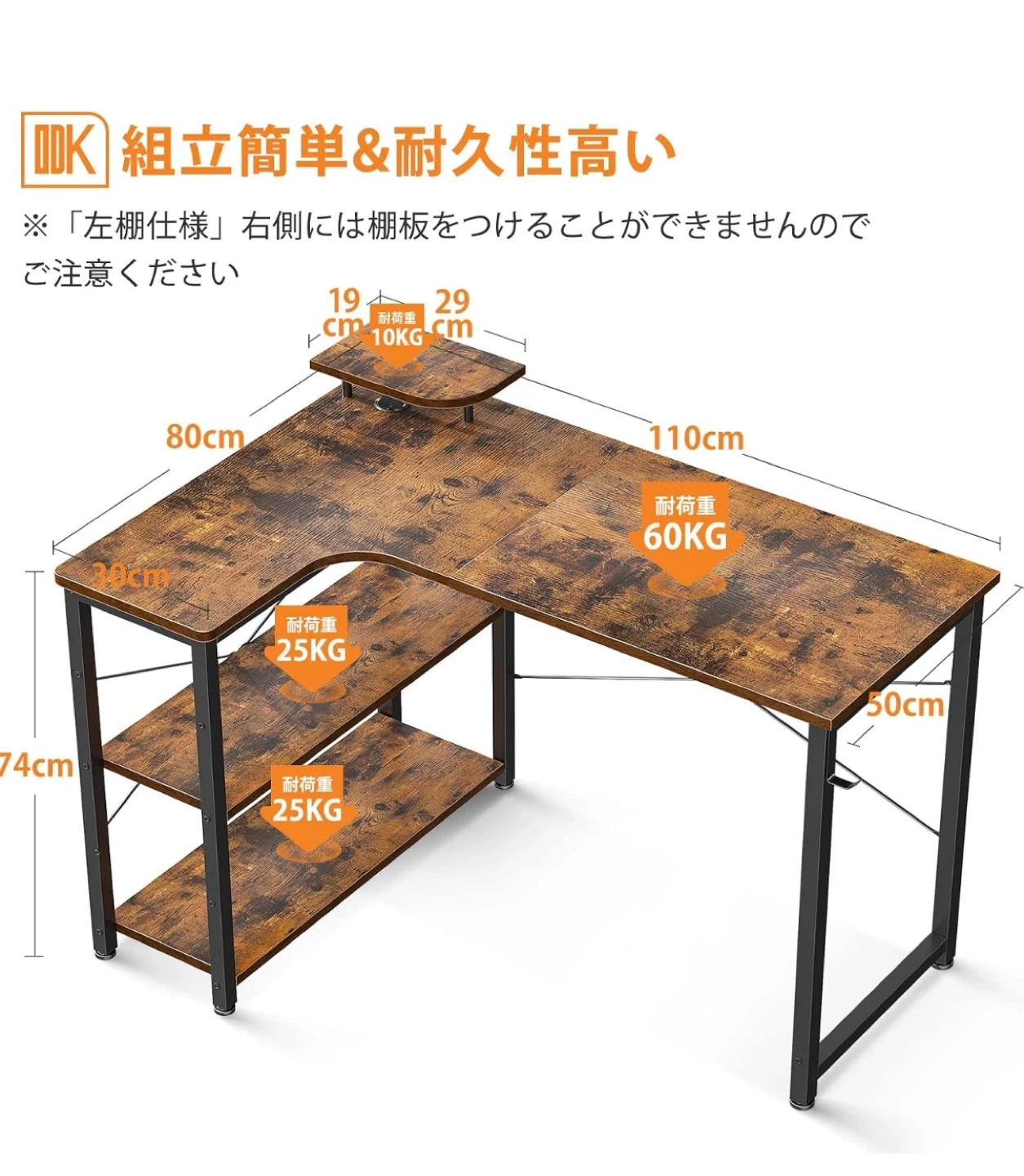 • 状態 :新品・未使用 • ケース形:L字型 • デスクの用途:コンピューターデスク / ライティングデスク • カラー:ビンテージ(天板・トップともビンテージ) • 表面処理:粉体塗装(撥水加工) • 天板耐荷重:60 kg • テーブルトップ厚さ:2 cm • 作業面の対角長:136 cm 寸法・重量 • 本体サイズ(奥行き × 幅 × 高さ):80 × 110 × 74 cm • 表記サイズ:1108074 cm • 商品重量:16.7 kg 画像7の状態で手渡し致します。 よろしくお願いします。