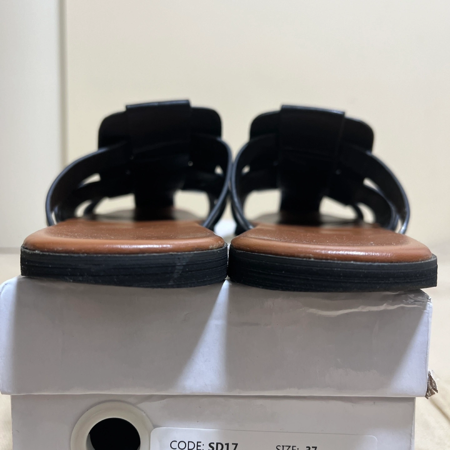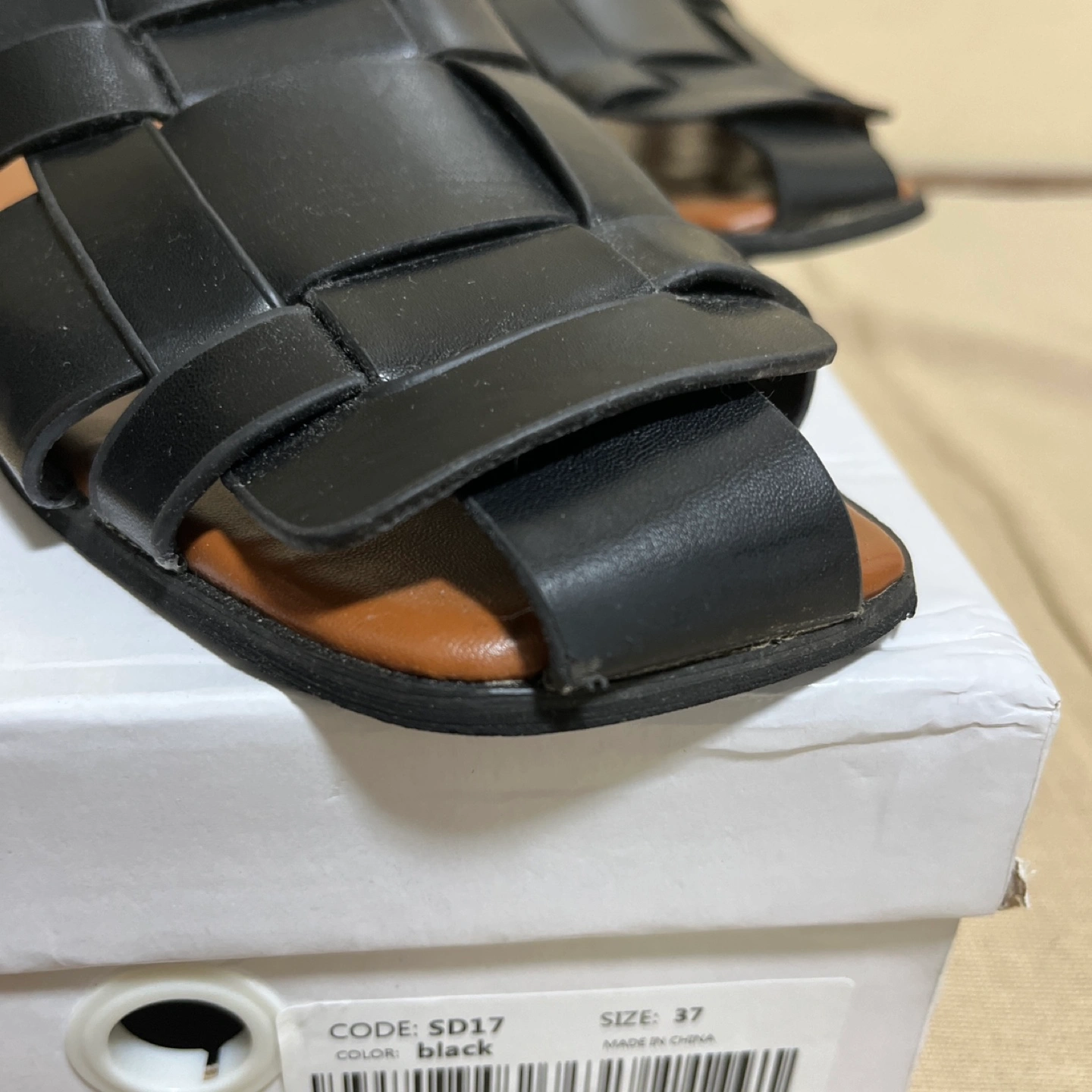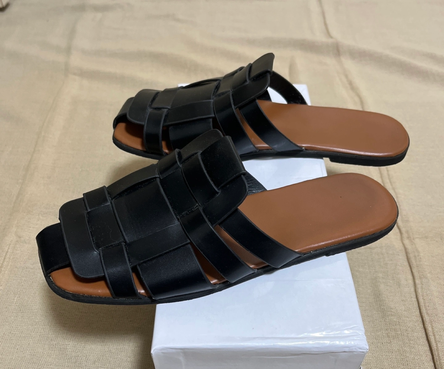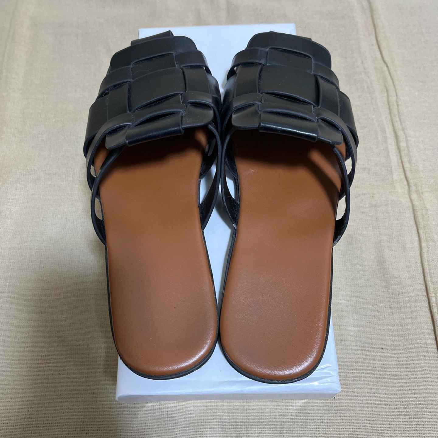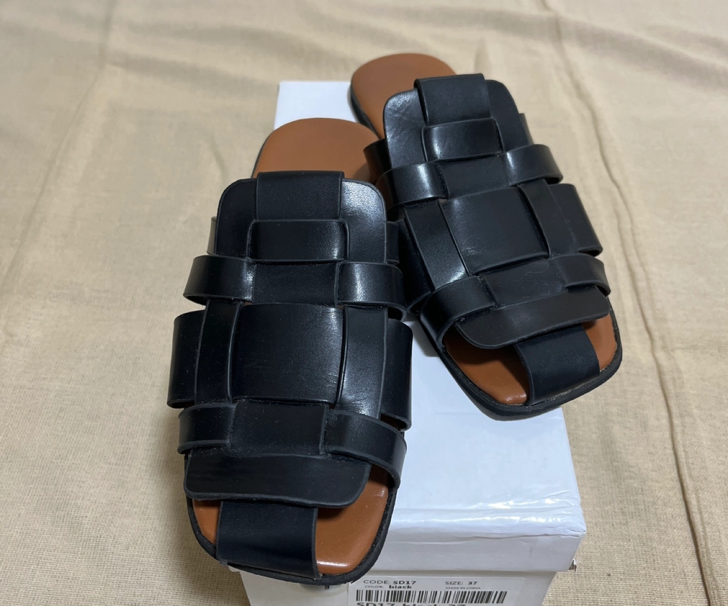 ブラックカラーのスクエアトゥ編み込みスリッパサンダルです。 ■ソフトな合皮の編み込みデザインで、肌当たりが柔らかく◎ ■さっと脱ぎ履きができ◎ 細かな傷汚れ、ソールの減り、擦れや皺などの使用感あり。 つま先の擦れ傷あり(8枚目) ★甲材: 合成皮革PU / 底材: 合成ゴム ★サイズ 37(23.5) ※画像の商品は光の照射や角度、お使いのモニター環境により、実物と色味が異なる場合がございます
