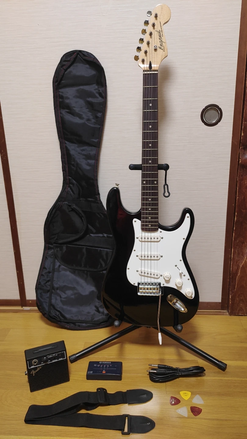 1. Legend エレキギター 2. アンプ Fender MA-10 3. ソフトケース 4. ストラップ 5. スタンド 6. ピック 5枚 7. チューナー 8. ケーブル