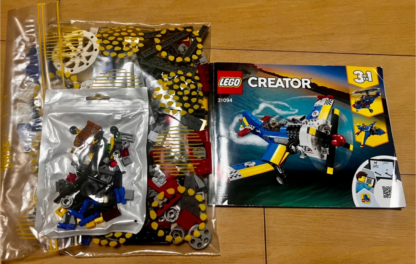 LEGO Creator 31094は、3つの異なるモデルに組み立て可能な飛行機セットです。 箱無し。 - モデル: 31094 正規品 - シリーズ: CREATOR - 年齢推奨: 7歳以上 - タイプ: 3-in-1 海外で購入したLEGO正規品です。 使用に伴う小傷や取りきれない埃、説明書にも折れがありますが、組み立てには問題なく、まだまだ遊んでいただけると思います。 ブロックパーツは足りないものがあります。 ・371001:1つ代替品、古いもののため色褪せ ・4211445:1つ代替品、色味の異なるグレー ・403226:4つしかなく2つ欠品。 また青いパーツで1つダメージの大きいものがあります。画像8枚目ご確認ください。 出品にあたり作り直し、説明書と見合わせて確認しましたが、 他にも見落としがあったら申し訳ありません。 子供の遊んだ中古品である事をご理解の上、ご購入をお願いします。