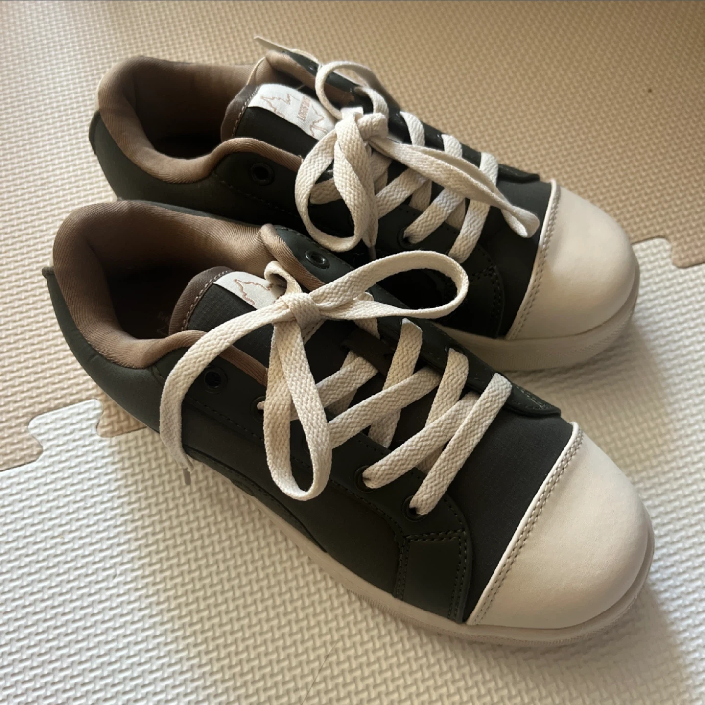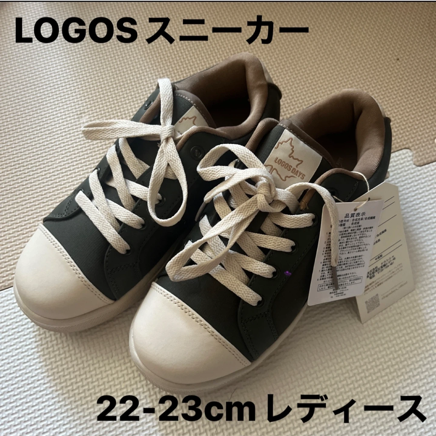 ロゴスのスニーカーです。 ・サイズ:22-23cm レディース ・色:ダークグリーン(カーキ)、ホワイト(ベージュ) ・状態:新品、未使用 LOGOSのスニーカーです。 カーキ系の色で、白に見える部分は若干ベージュっぽくクリーム色っぽい色で、全体的にアースカラー?アッシュカラー?くすみカラーで流行りの色味です。 何gかはわかりませんがすごく軽いので、 歩きやすいと思います。 また、軽いのに形がしっかりしていて固さが丈夫そうなので、履きやすくもあると思います。 ただ、一度も履いていないため、 履き心地の詳細についてはわかりません。 スニーカーを購入しすぎてしまう癖があり、 新品なままのスニーカーがほかにもあるので、 断捨離のため出品します。
