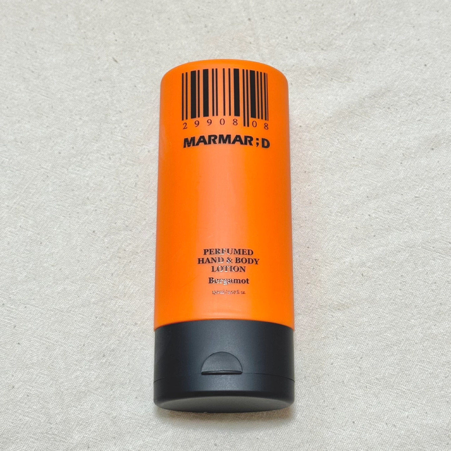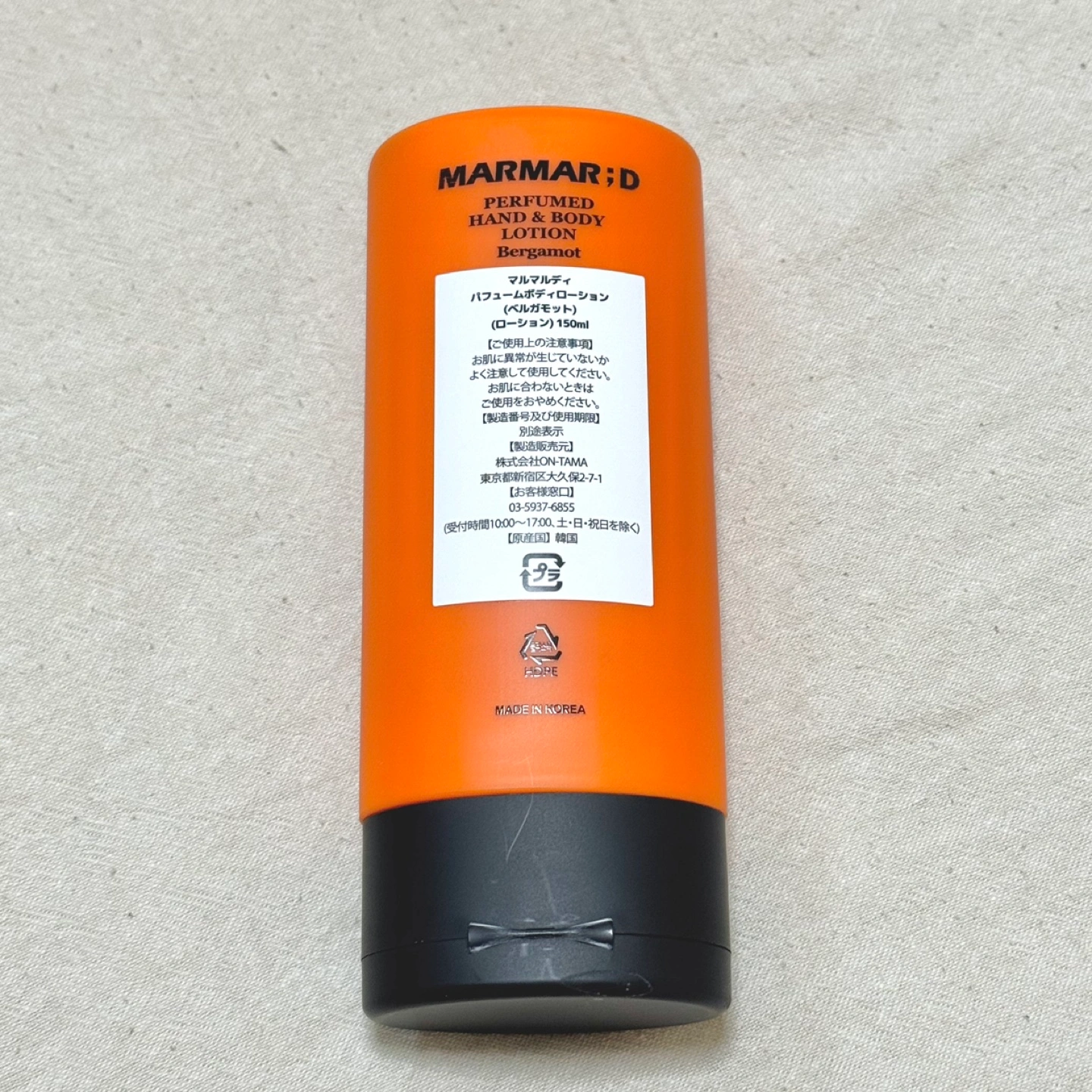 MARMAR:D マルマルディ PERFUMED HAND & BODY LOTION ハンドクリーム ボディローション 香り:ベルガモット 内容量:150ml 使用期限25.12.21 香りを嗅いだだけの未使用品です。 未使用ですが一度人の手に渡ったものですので気にされる方は購入をお控えください。 【商品説明】 爽やかなベルガモットオレンジにほのかなシダーウッドの香りを加えた暖かいオレンジの木の香り。 1.べタつきにくく、さっと手になじみ乾燥など外部からの刺激を受けた 手肌を柔らかく包みます。 2.ヒノキ*¹、マデカ*²、セラミド*³を含有し保湿、肌を整えます。 3.シアバター*⁴、アルガンオイル(アルガニアスピノサ核油)*⁵配合でキューティクルケアまで。 *¹:ヒノキ水(整肌成分) *²:マデカッソシド(整肌成分) *³:セラミドNP(保湿成分) *⁴:シア脂(保湿成分) *⁵:アルガニアスピノサ核油(保湿成分) 【ベルガモット】 爽やかなベルガモットオレンジにほのかなシダーウッドの香りを加えた暖かいオレンジの木の香り。 トップノート:ベルガモット ミドルノート:ジャスミン ベース:シダーウッド ーーーーーーーーーー 【MARMAR;D/マルマルディ】とは? 日常生活の中、毎瞬間向き合うすべての商品に本質的な機能と美しさを込めた韓国生まれのライフライフスタイルブランドです。 MARMAR;D(マルマルディ)の表現する、木・土・葉など、静寂と平和に包まれた森をイメージした香りは、疲れた日常にリラックスとヒーリングの気分を届けてくれます。