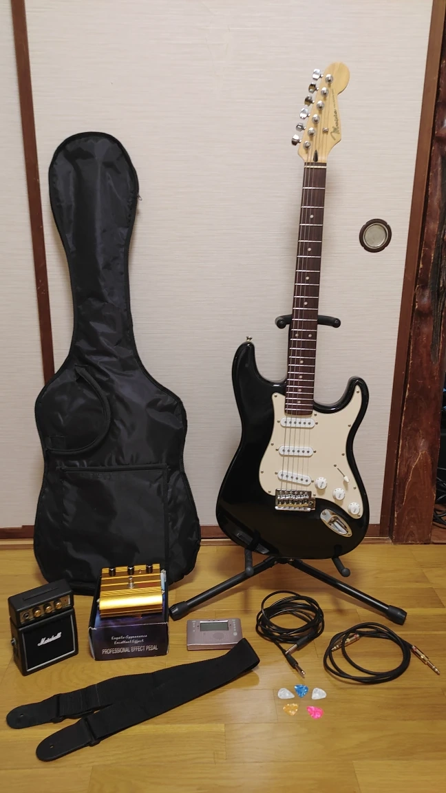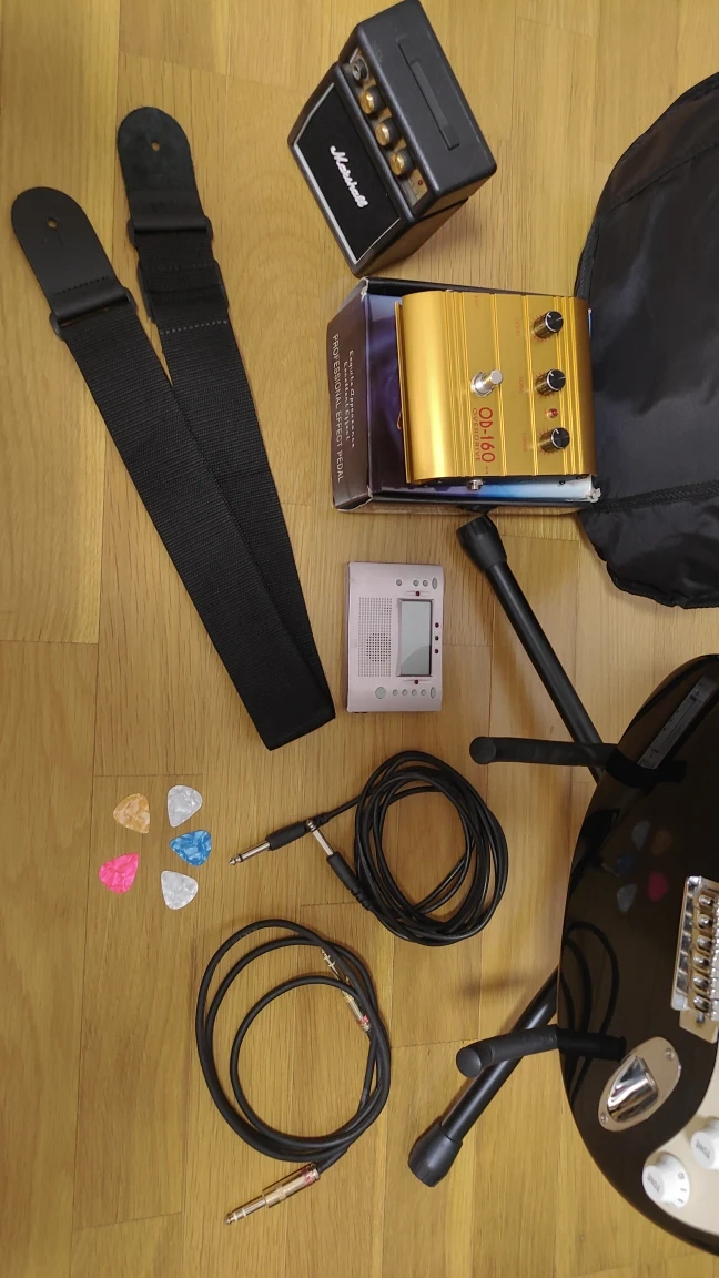 1. Mavis エレキギター 2. アンプ Marshall MS-2 3. ソフトケース 4. エフェクター OverDrive OD-160 5. スタンド 6. ピック 5枚 7. チューナー 8. ケーブル x2 9. ストラップ