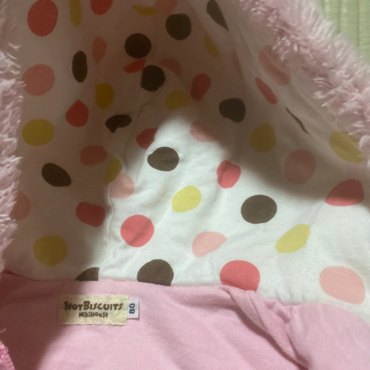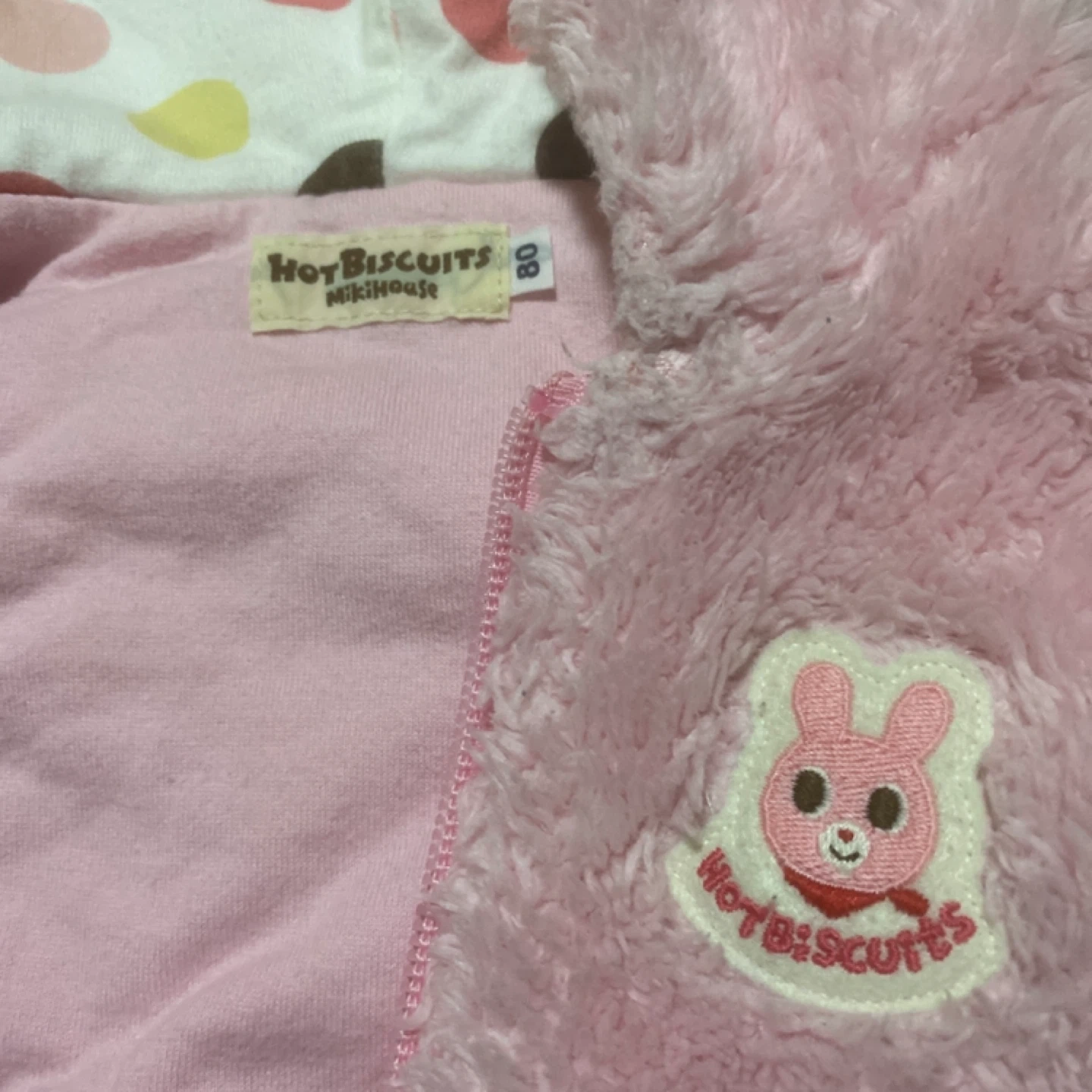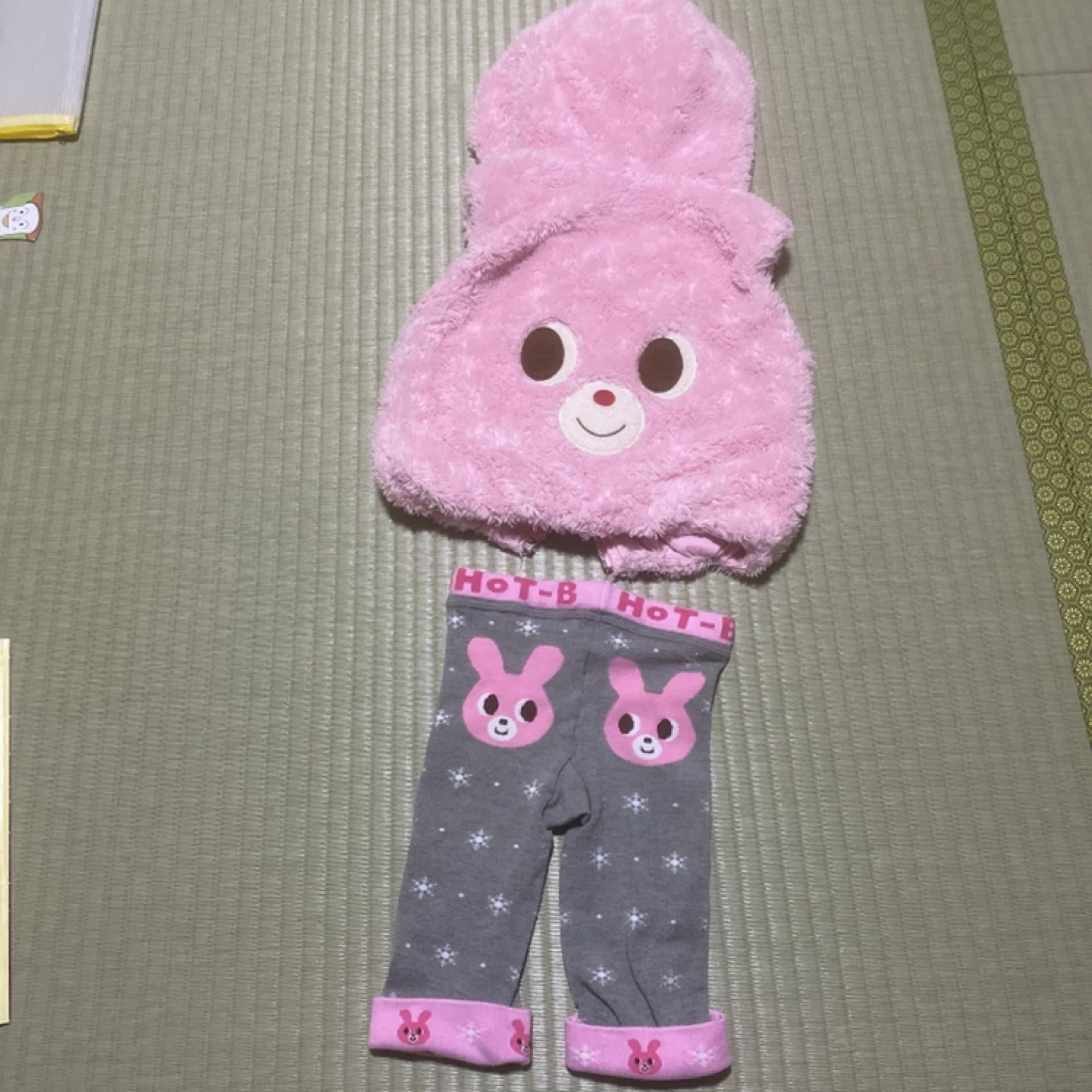ミキハウスのHOT BISCUITS 後姿が可愛い ベスト&パンツのセットです。 フード付きのもこもこファーベスト 中側は綿素材で暑がりのお子さんにも安心。秋口の温度調節に活躍しました。 ストレッチパンツの方も綿混の素材で、 遠赤外線の保温効果のあるものです。 裾を折り返して短めにすることもできます。 ・上着とズボンのセット ・上着はピンク色、 ・ズボンはグレー色、ウサギのデザイン 中古品であることをご了承ください。