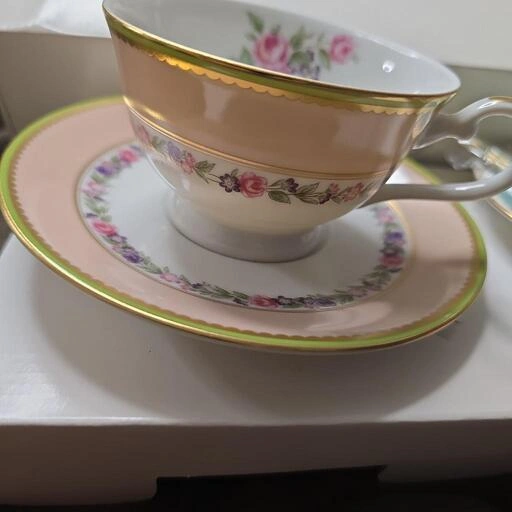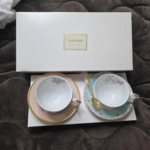 新品未使用・箱入りです。 箱には多少の傷・汚れがあります。 家庭内の保管品ですので、気になる方はご遠慮ください。 見本の写真(①)はかなり色が濃いので、現品写真をご確認ください。 ブランド: NARUMI ナルミ カップ・ソーサー各2客 スプーン2本 サイズ カップ:約 直径9.5×高さ6cm、容量 約200ml ソーサー:直径約14.8cm スプーン:長さ約11.6cm ボーンチャイナ 日本製 ご不明点はお気軽にお問い合わせください。