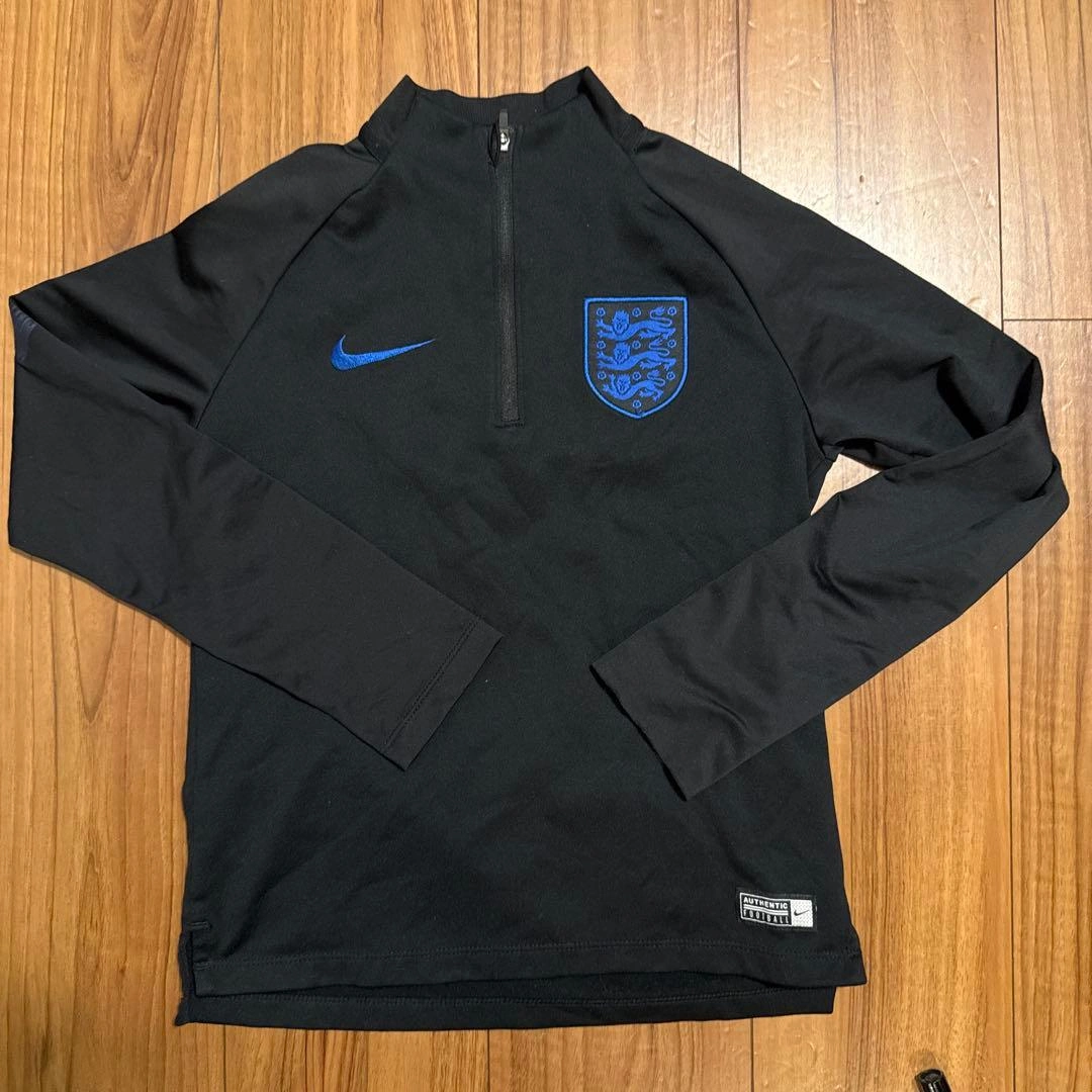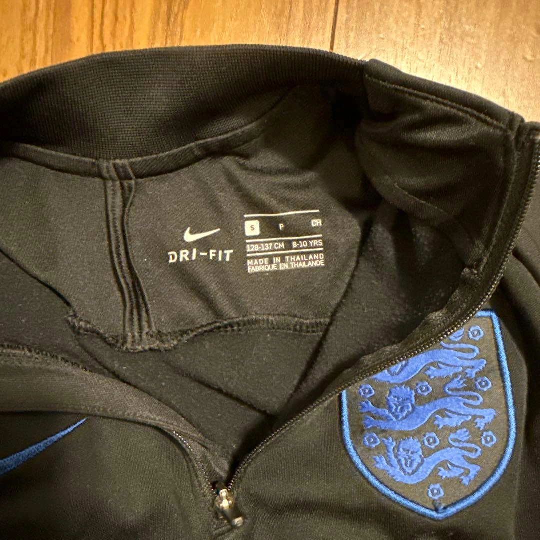 NIKE、イングランド代表のジャージ、子供用サイズSです。 130cmくらいだと思います。 イギリスのウェンブリースタジアム横のショップで購入し、子供のサッカーで防寒着として着用しました。ジャージの中でも薄手なので、夏以外は持ち歩いていました。 素人の自宅保管、中古品であることをご理解いただける方のご購入をお願いします。