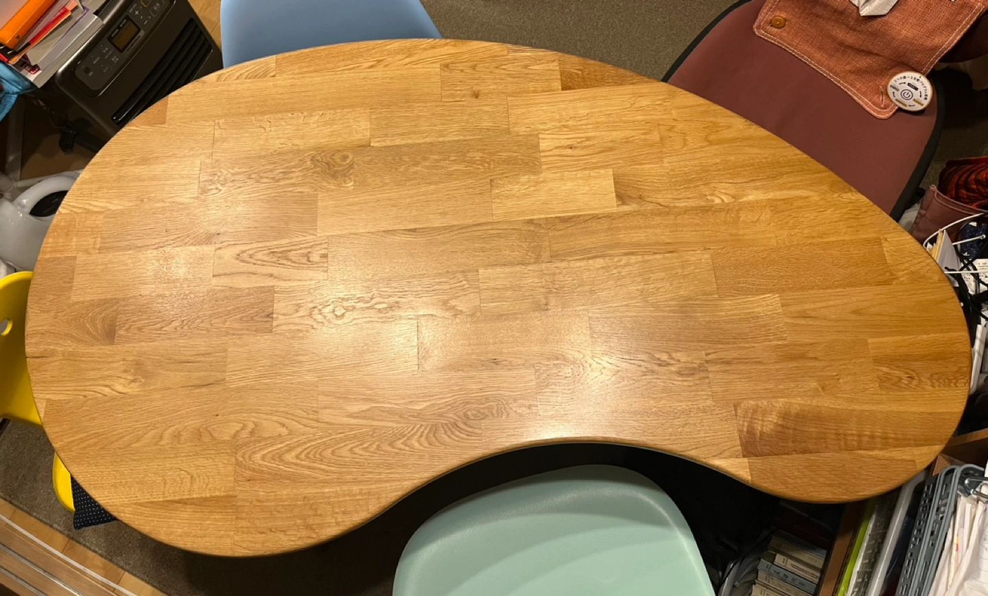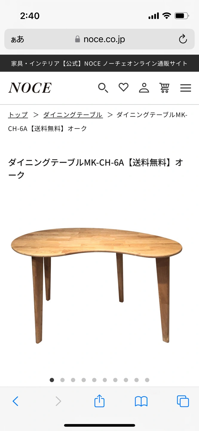 NOCEのダイニングテーブルです。カーペットの上に置いて使用していたので目立った汚れはありません。 とても気に入っている形なのですが、4人でダイニングテーブルとして使うのにややゆとりがなくなったので手放すことにしました。 事務所で、くびれているところに座って膨らんでいるところにお客様が座るという使い方が最高かなと感じています。 起業した暁には再度購入したいくらいです。
