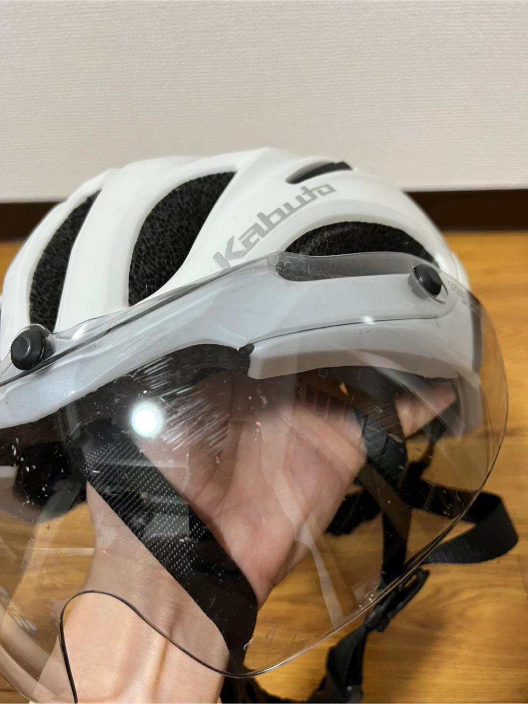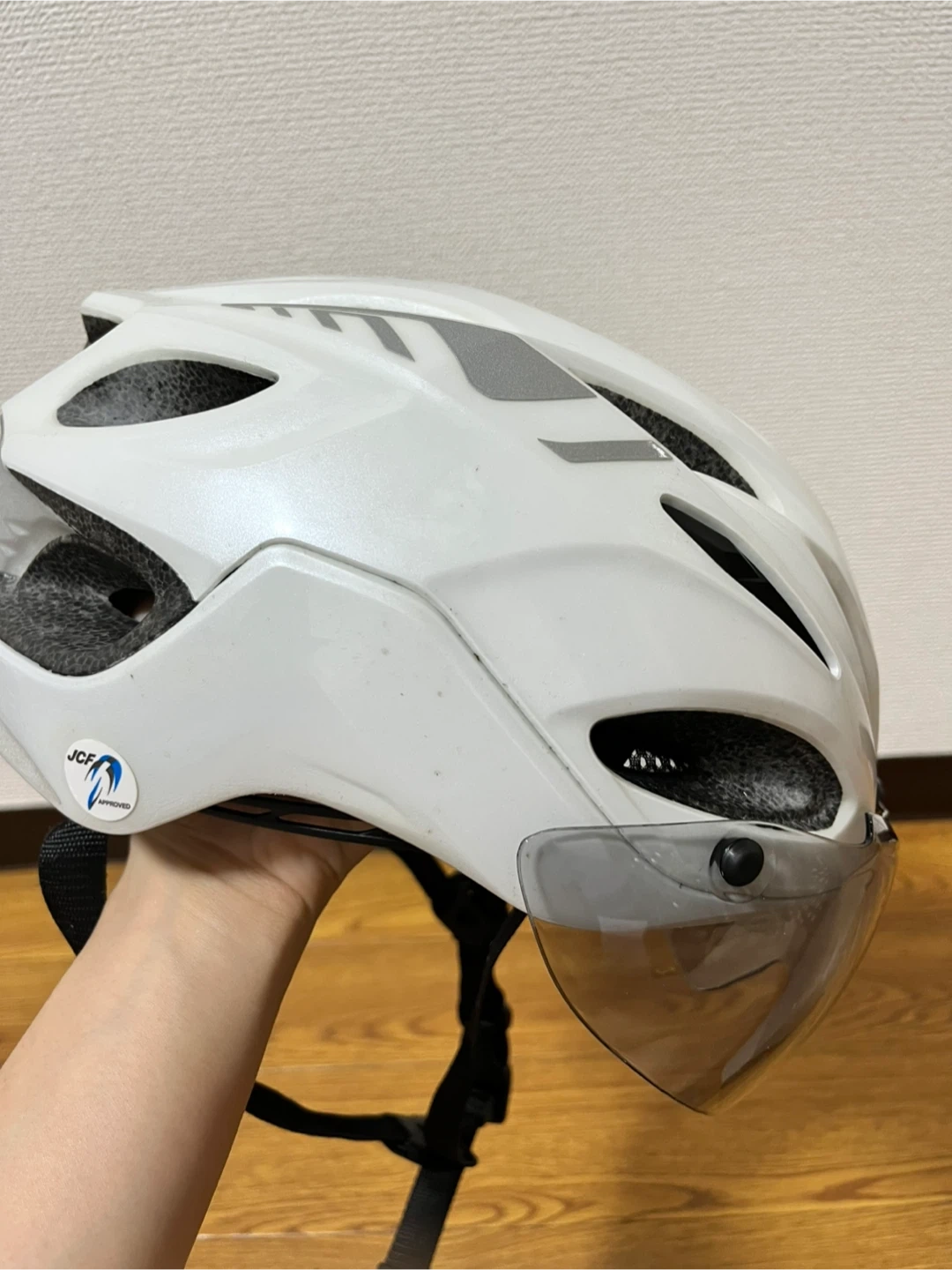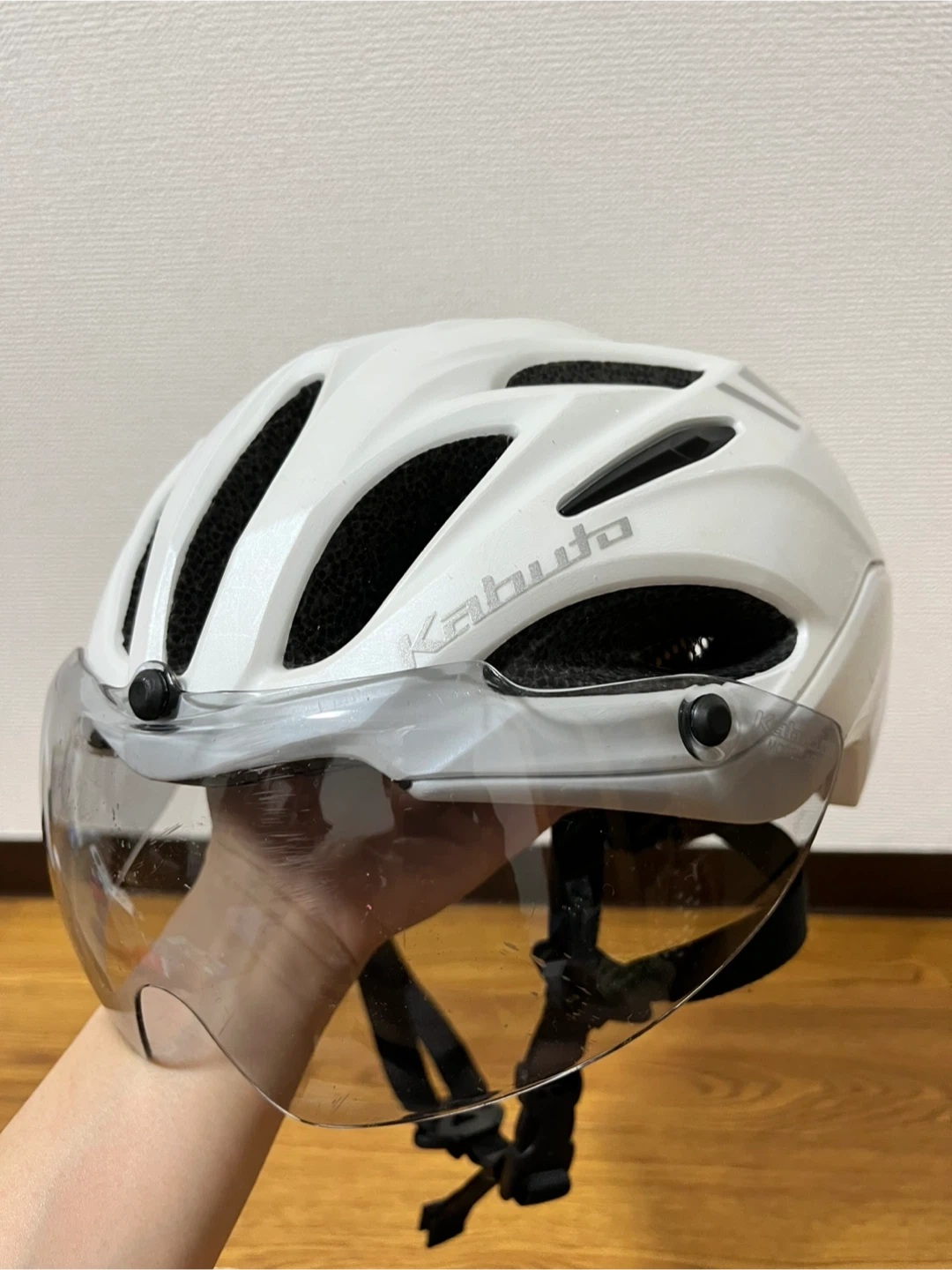 OGK Kabuto Vitt S/M ホワイト サイズ : S/M 55-58cm 色 : ホワイト 3年前に購入し、サイクリングをしていた頃に使っていました。1年間サイクリングを休んでいたので、クローゼットにしまっておきました。 使用はあまりしていませんので状態は良い方だと思います。 シェルとアイシールドに傷や汚れがあります。状態は画像でご確認ください。 目立たない擦れなどはあります。また、シールにシワが出来ていましたのでご確認ください。 付属品はありません。 まだきれいな状態と個人的には思いますが素人検品になります。 見落としなどご理解いただけますようお願いします。 中古品にご理解のある方のみ、ご検討、ご購入下さい。 自宅保管のお品ですのでご理解下さる方。 ご質問がある場合は、遠慮なくコメントしてください。 宜しくお願い致します。